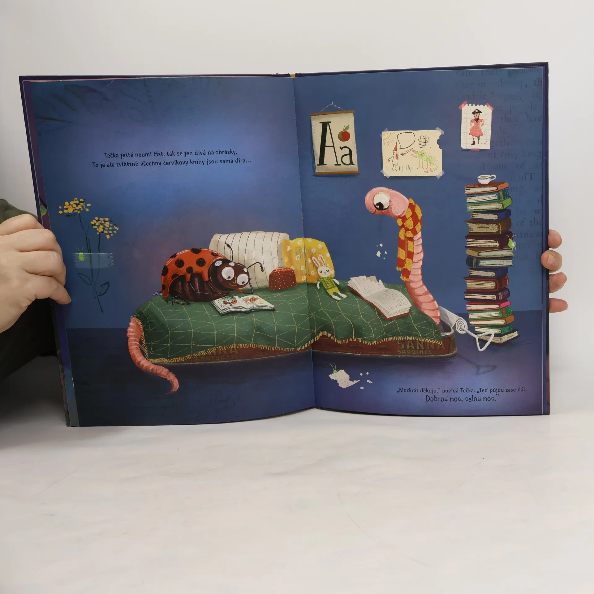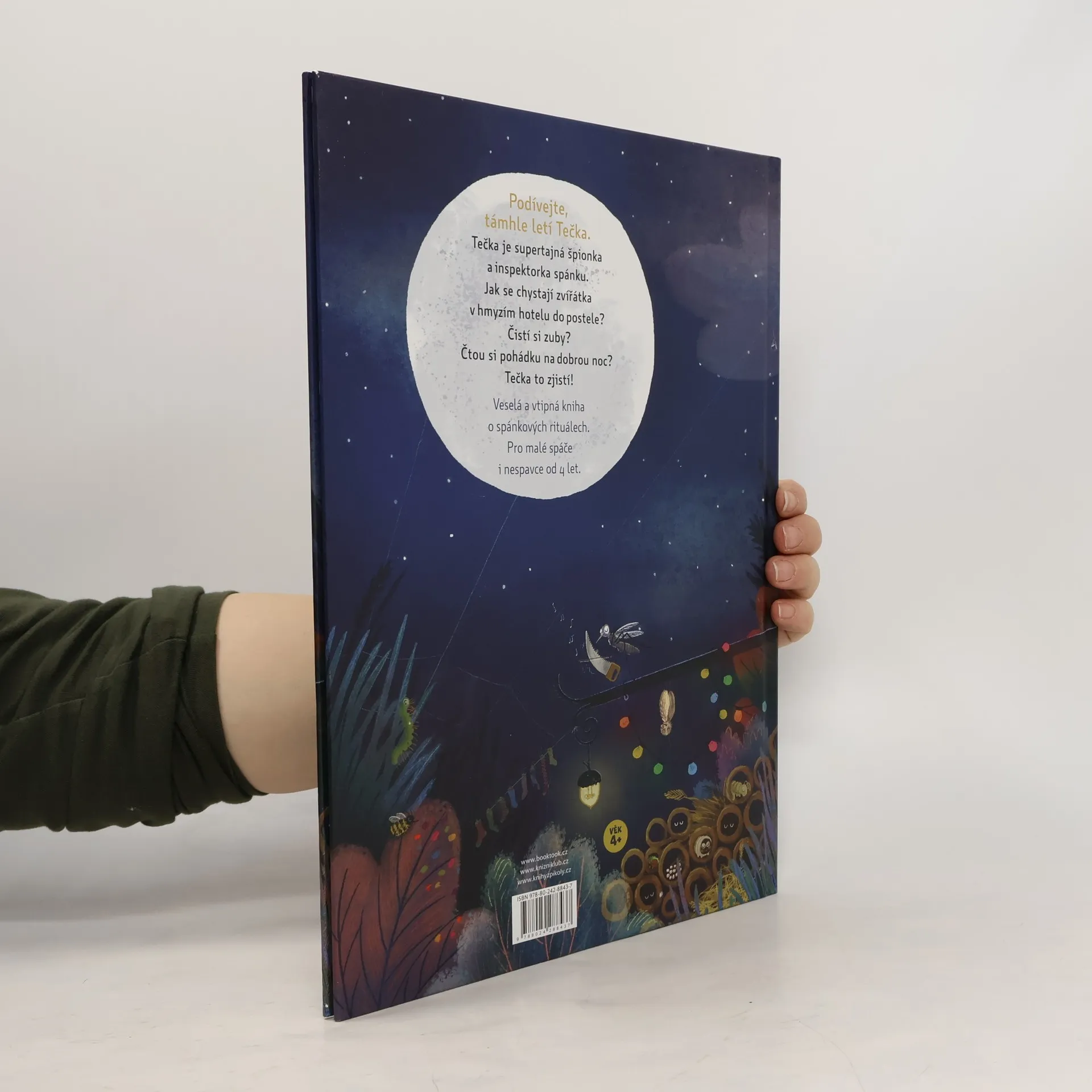 Tečka je tajná špionka a inspektorka spánku. Ale pst, nikomu to neříkejte! Přichází právě do hmyzího hotelu zkontrolovat, jestli se všichni pěkně chystají do postýlek. Mají vyčištěné zoubky? Jsou vykoupaní a převlečení do pyžamek? A co knížka před spaním? Tak už jen vyčůrat a spát. Ale i špionka Tečka přece jen na něco zapomněla. Ještěže má kamarády, kteří se o pusu na dobrou noc nenechají ošidit. A teď už sladké sny! Dobrou noc, celou noc!