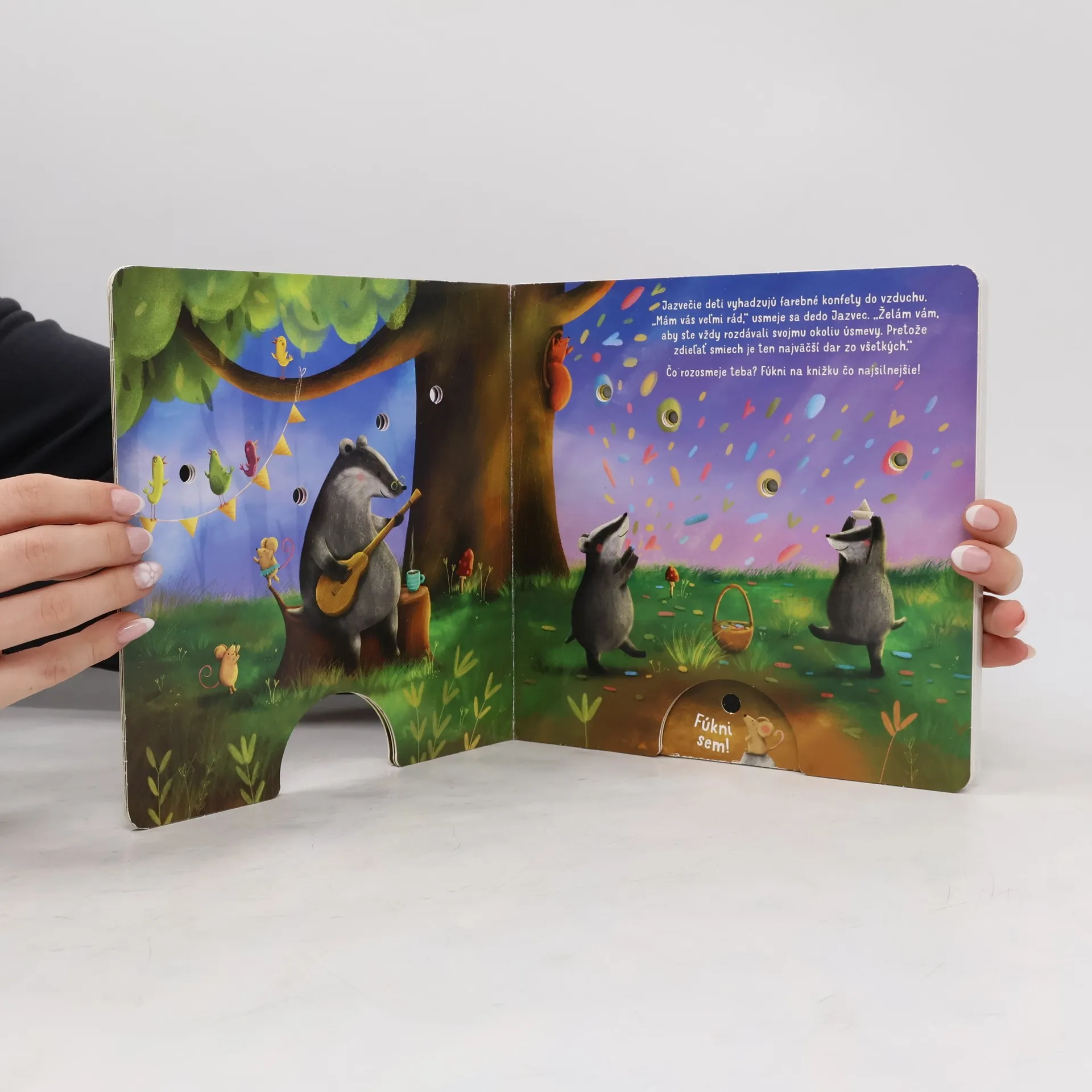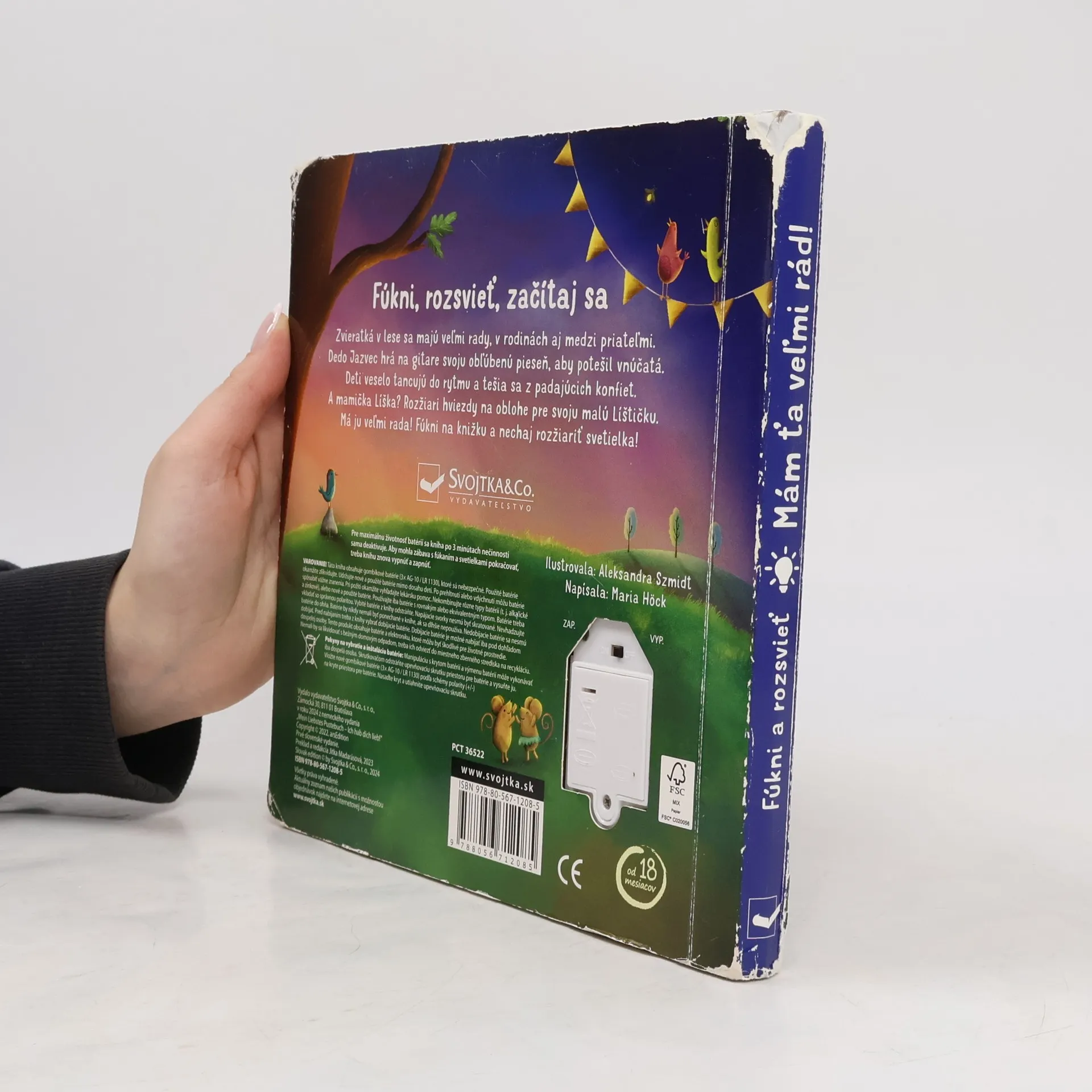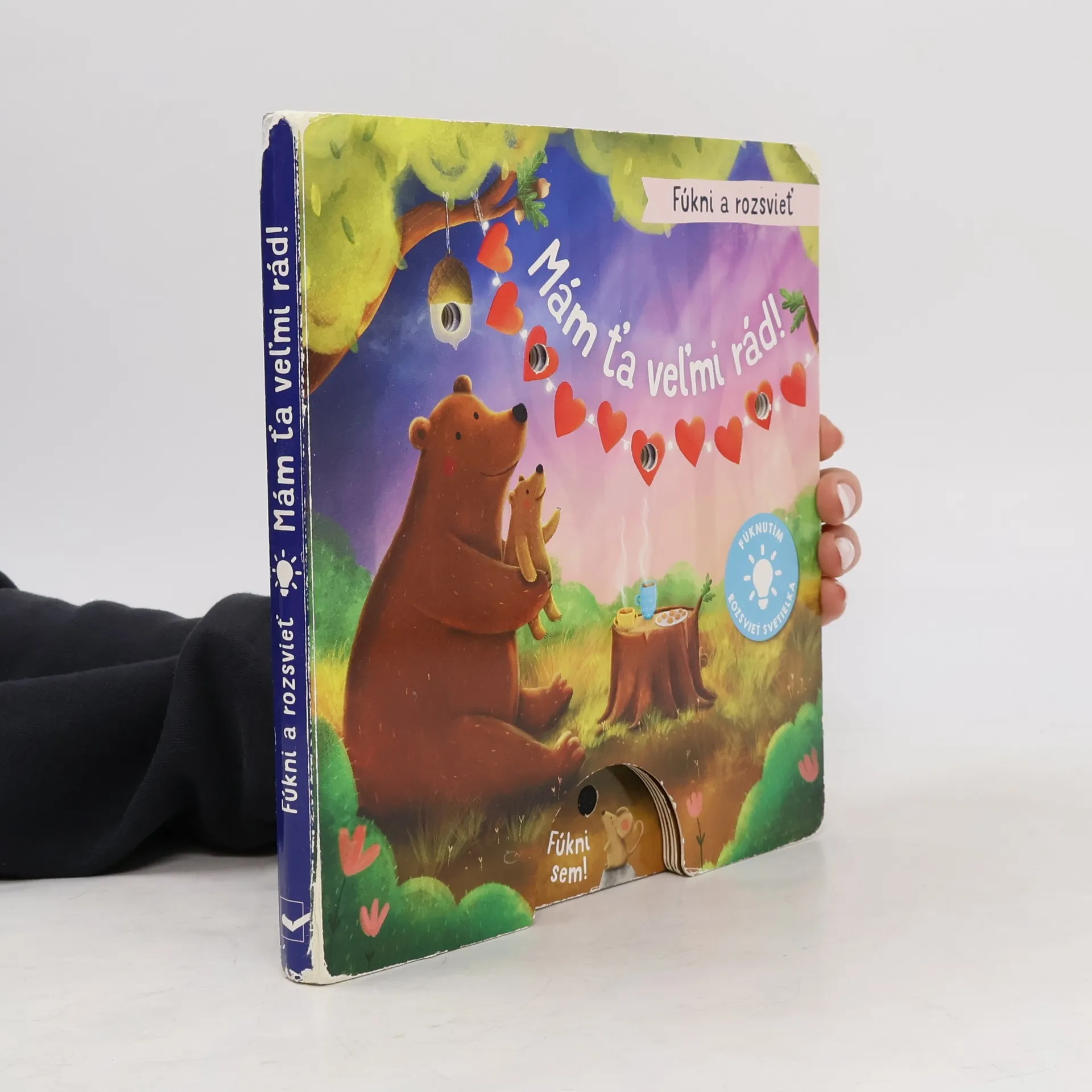 Fúkni, rozsvieť, začítaj sa - fúknutím rozsvieť svetielka. Zvieratká v lese sa majú veľmi rady, v rodinách aj medzi priateľmi. Dedo Jazvec hrá na gitare svoju obľúbenú pieseň, aby potešil vnúčatá. Deti veselo tancujú do rytmu a tešia sa z padajúcich konfiet. A mamička Líška? Rozžiari hviezdy na oblohe pre svoju malú Líštičku. Má ju veľmi rada! Fúkni na knižku a nechaj aj ty rozžiariť svetielka!