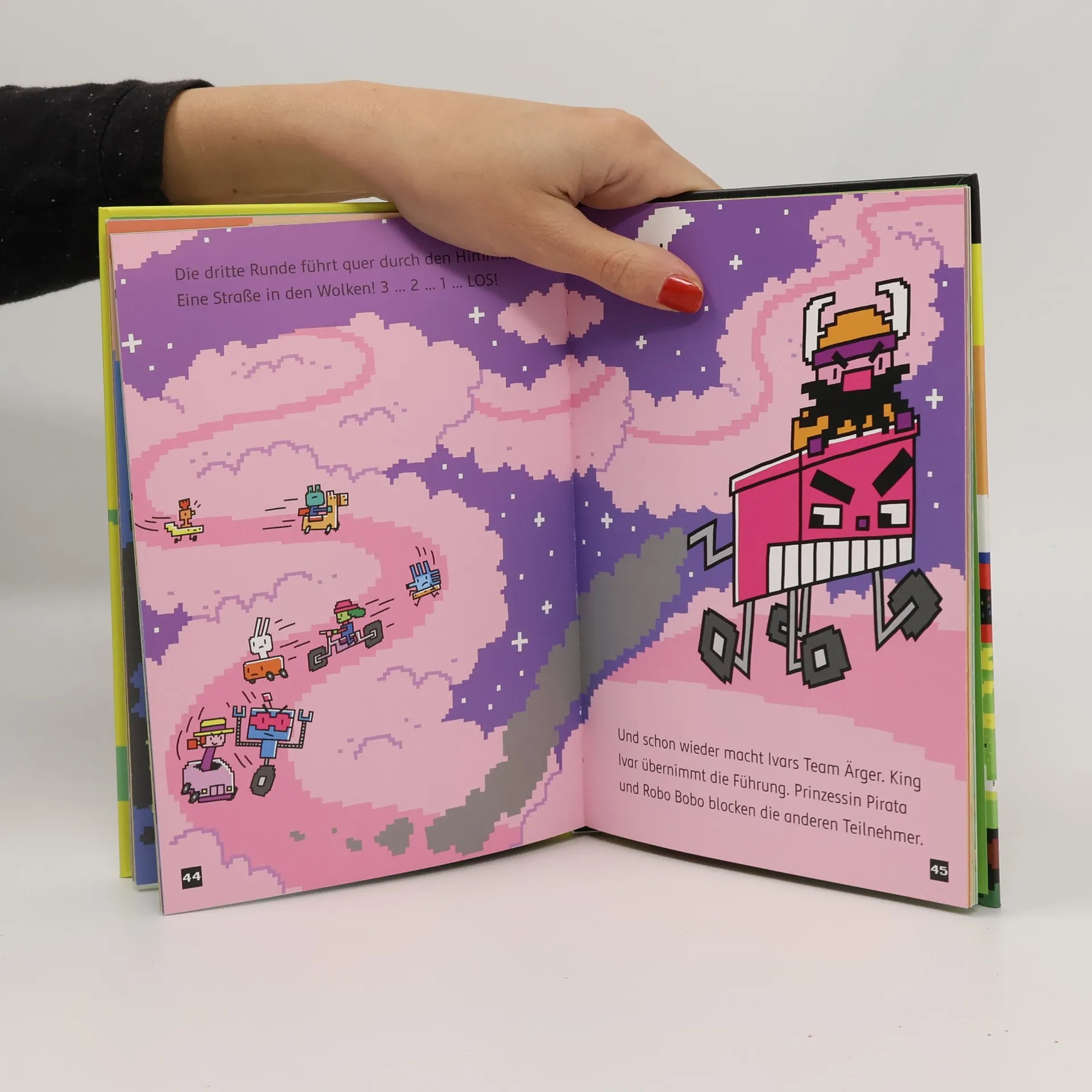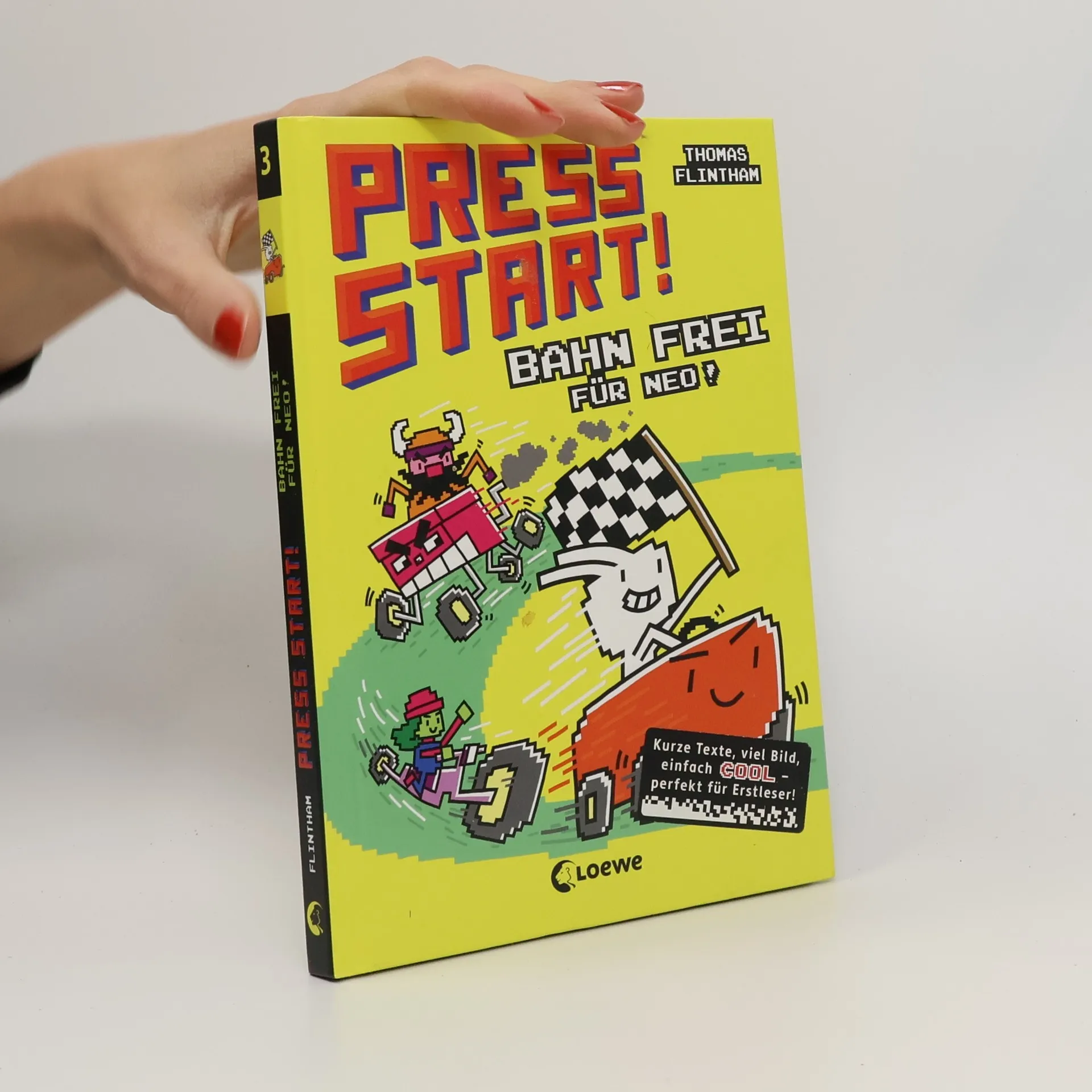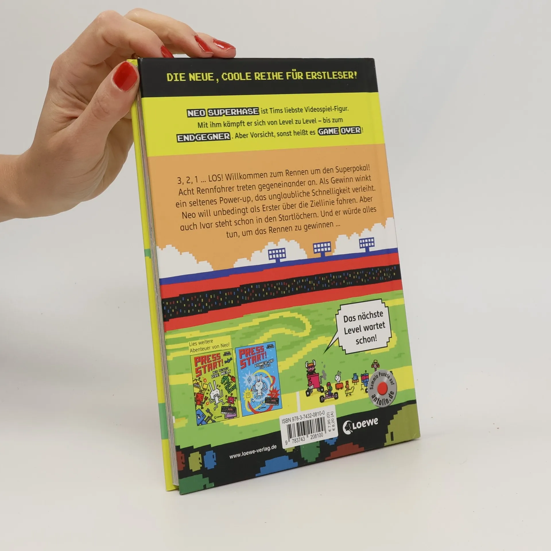 Das Buch ist bei deiner Buchhandlung vor Ort und bei vielen Online-Buchshops erhältlich! Neo Superhase ist Tims liebste Videospiel-Figur. Mit ihm kämpft er sich von Level zu Level – bis zum Endgegner. Aber Vorsicht, sonst heißt es Game over! 3, 2, 1 … Los! Willkommen beim großen Rennen um den Superpokal! Acht Rennfahrer treten in vier Runden gegeneinander an. Als Gewinn winkt ein seltenes Power-up, das unglaubliche Schnelligkeit verleiht. Neo Superhase will unbedingt als Erster über die Ziellinie fahren. Aber auch sein Erzfeind King Ivar steht schon in den Startlöchern. Und er würde alles tun, um das Rennen zu gewinnen … In der Reihe Press Start! von Thomas Flintham ist der Hase Neo der Superheld in einem Computerspiel. Sein persönlicher Endgegner: King Ivar, der fiese Wikinger, und seine Armee aus Robotern. Zum Glück hat Neo aber Superkräfte und kann alle Gefahren bestehen, die in jedem neuen Level auf ihn warten. Dieses Buch ist ein Muss für alle kleinen Gamer! Ein Buch mit vielen bunten Bildern von Thomas Flintham! - Zum ersten Selberlesen für Jungs ab 7 Jahren - Coole Computerspiel-Optik - Kurze Texte und besonders hoher Bildanteil - Lesespaß garantiert – auch für Lesemuffel! Der Titel ist bei Antolin gelistet.