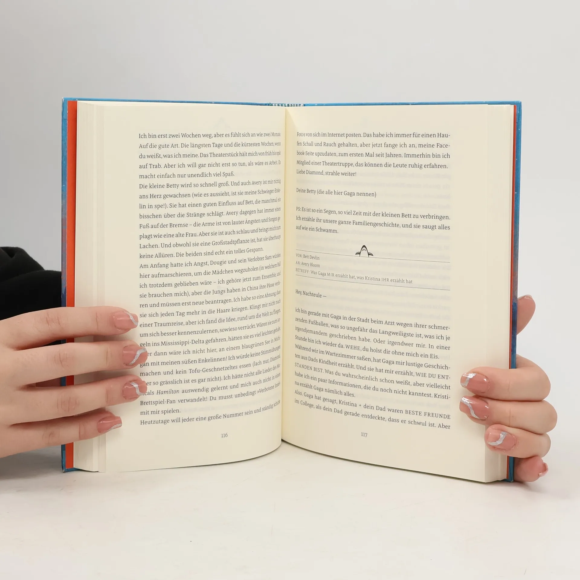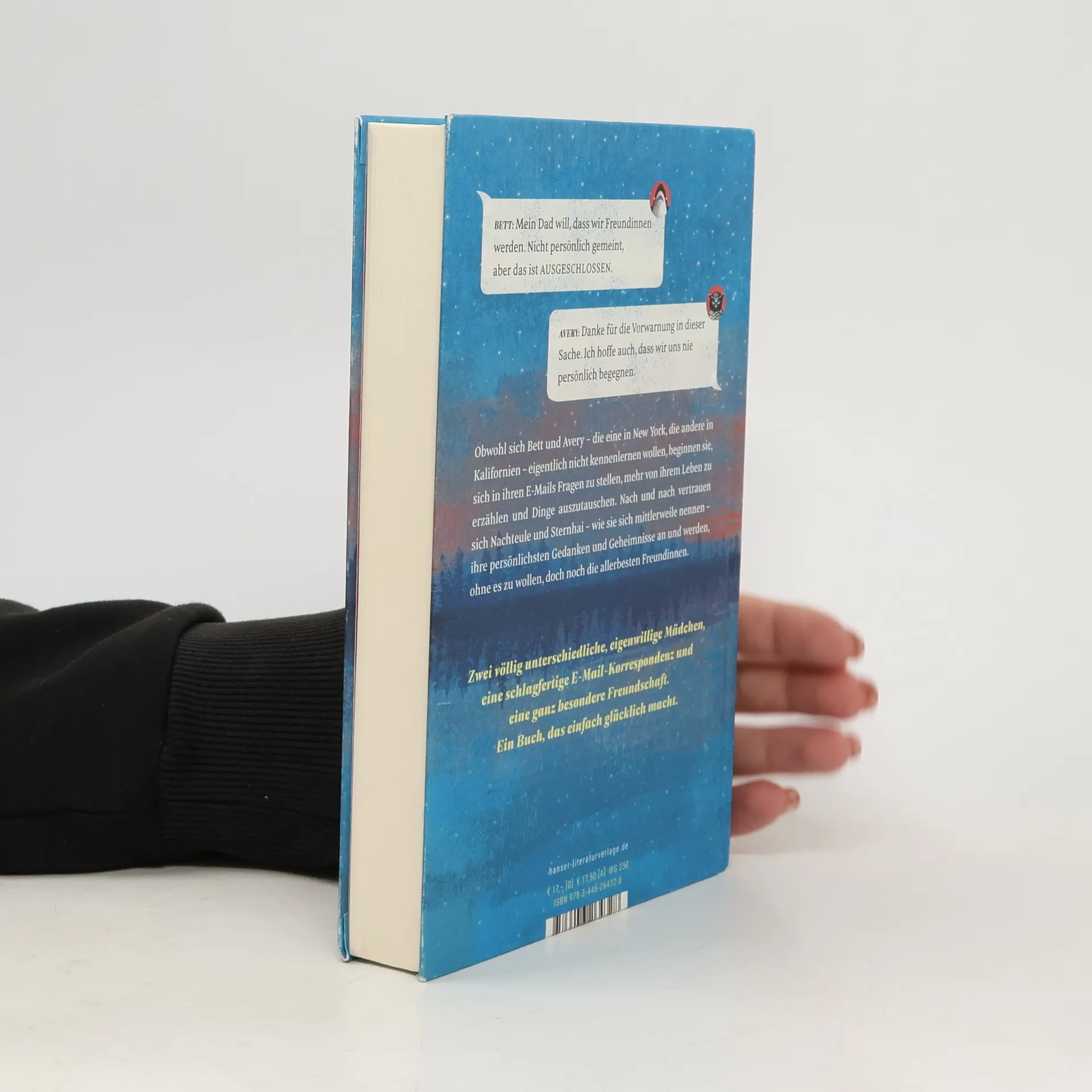 Die schönste Freundschaftsgeschichte und der genialste Dialog seit „Gut gegen Nordwind“. Von den Bestsellerautorinnen Holly Goldberg Sloan und Meg Wolitzer Achtung, Suchtpotential! Diesem Buch verfällt der glückliche Leser mit ganzem Herzen ab der ersten Seite. „Du kennst mich nicht, aber ich schreibe dir trotzdem.“ So beginnt die Geschichte von Bett und Avery, deren alleinerziehende Väter die verrückte, romantische Idee haben, dass sie eine Familie werden könnten. Nicht mit Bett und Avery! Obwohl sich die beiden Mädchen auf gar keinen Fall kennenlernen wollen, beginnen sie vor lauter Neugierde, in ihren E-Mails Fragen zu stellen, mehr von ihren Leben zu erzählen und Dinge auszutauschen. Nach und nach vertrauen sich Nachteule und Sternhai – wie sie sich mittlerweile nennen – ihre persönlichsten Gedanken und Geheimnisse an und können sich ein Leben ohne einander nicht mehr vorstellen.