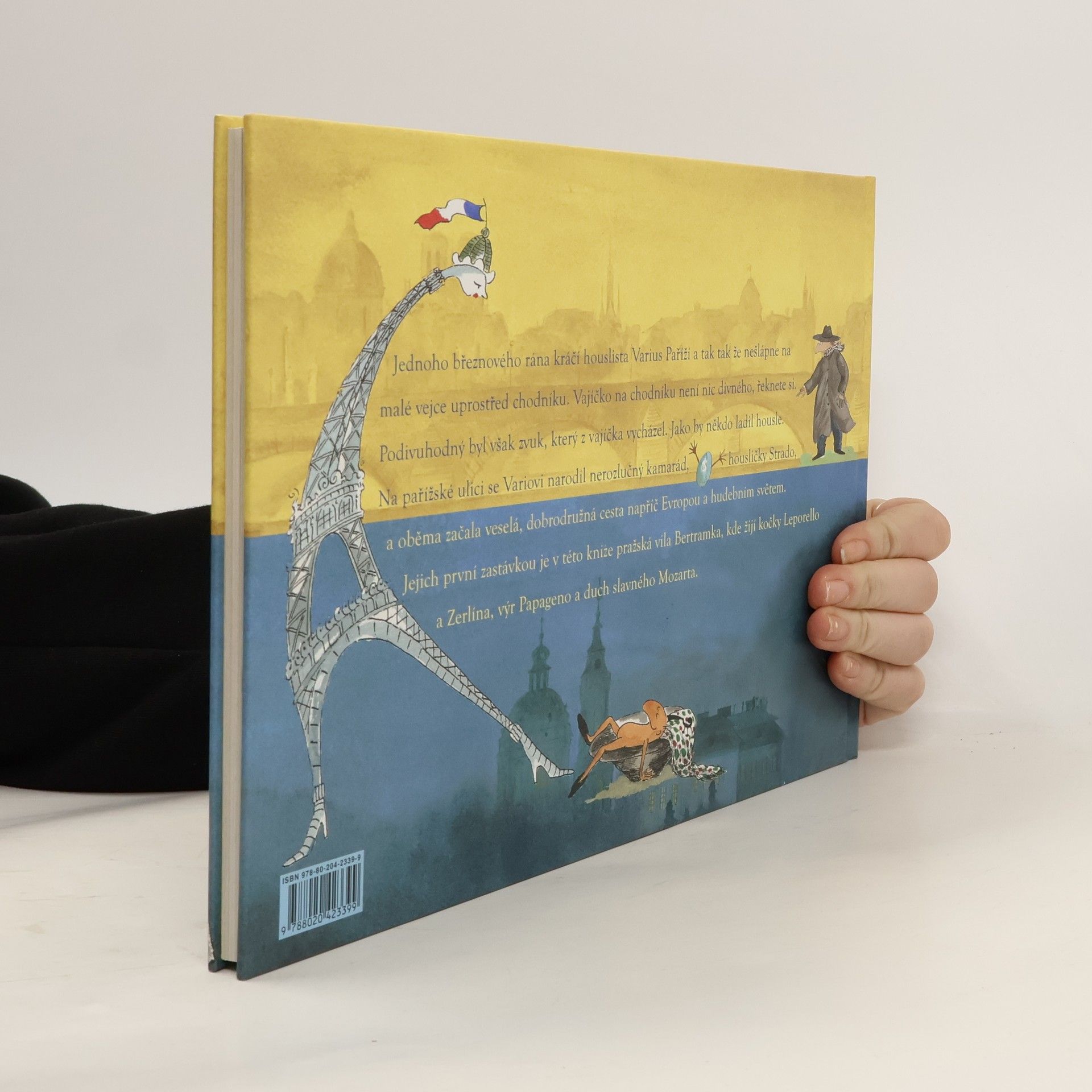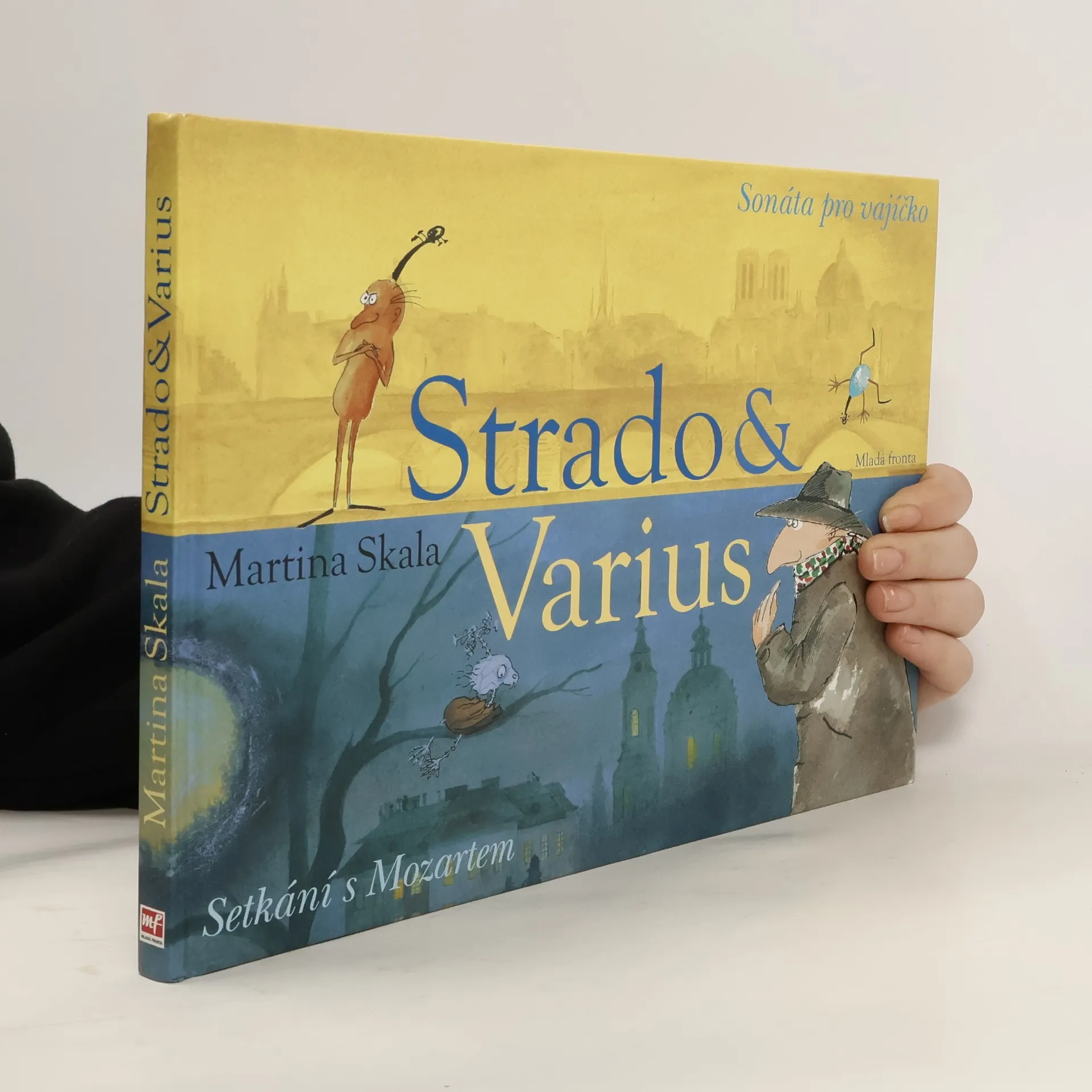 Nové vydání cenami ověnčených knih o hlavních hrdinech jménem Strado a Varius, kteří nás provedou zákoutími hudby a ukážou, co je to přátelství. Jednoho březnového rána kráčí houslista Varius Paříží a tak tak že nešlápne na malé vejce uprostřed chodníku. Vajíčko na chodníku není nic divného, řeknete si. Podivuhodný byl však zvuk, který z vajíčka vycházel. Jako by někdo ladil housle. Na pařížské ulici se Variovi narodil nerozlučný kamarád, housličky Strado, a oběma začala veselá, dobrodružná cesta napříč Evropou a hudebním světem. Jejich první zastávkou je v této knize pražská vila Bertramka, kde žijí kočky Leporello a Zerlina, výr Papageno a duch slavného Mozarta.