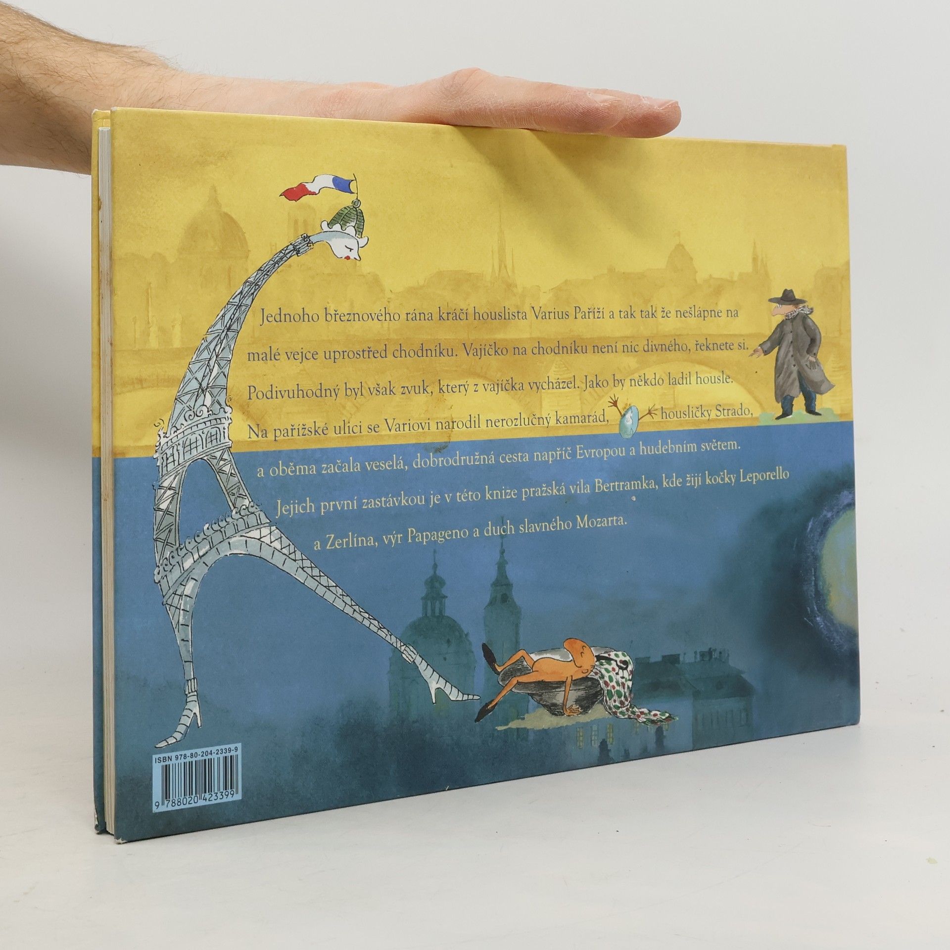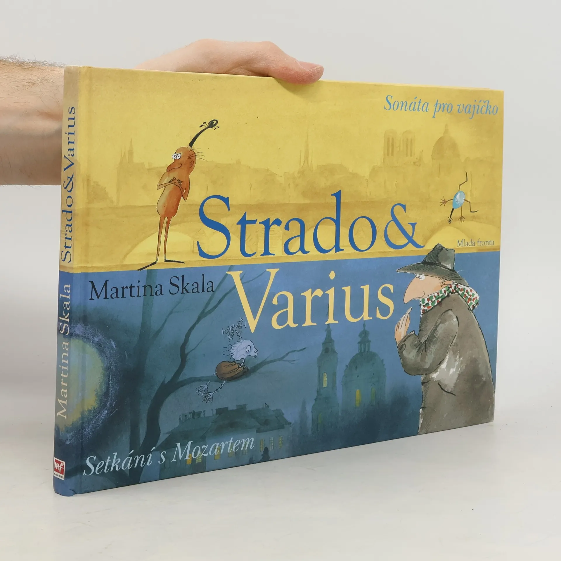 Nové vydání cenami ověnčených knih o hlavních hrdinech jménem Strado a Varius, kteří nás provedou zákoutími hudby a ukážou, co je to přátelství. Jednoho březnového rána kráčí houslista Varius Paříží a tak tak že nešlápne na malé vejce uprostřed chodníku. Vajíčko na chodníku není nic divného, řeknete si. Podivuhodný byl však zvuk, který z vajíčka vycházel. Jako by někdo ladil housle. Na pařížské ulici se Variovi narodil nerozlučný kamarád, housličky Strado, a oběma začala veselá, dobrodružná cesta napříč Evropou a hudebním světem. Jejich první zastávkou je v této knize pražská vila Bertramka, kde žijí kočky Leporello a Zerlina, výr Papageno a duch slavného Mozarta.