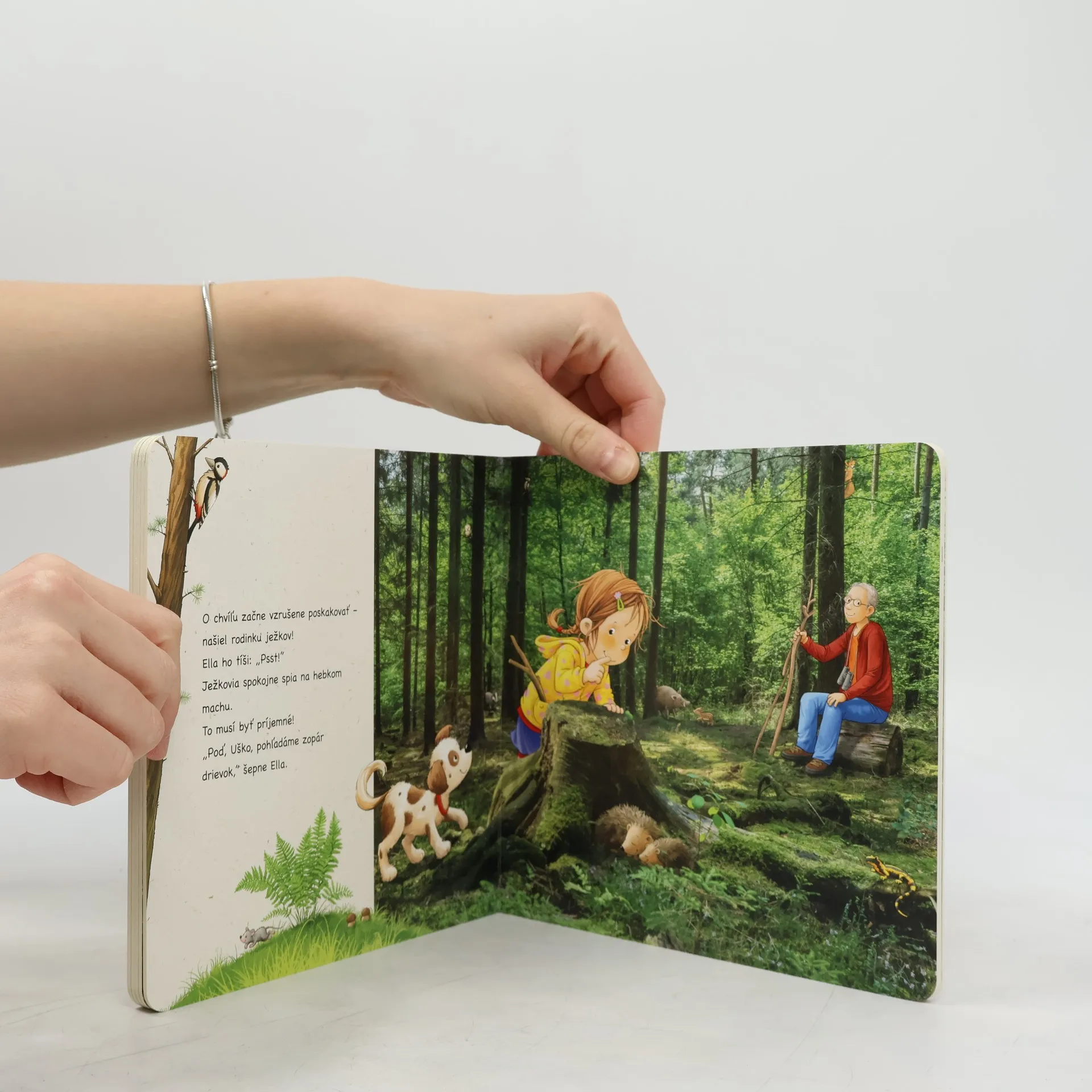 Poď s nami do lesa! Ella sa s dedkom a so psíkom Uškom vybrala na prechádzku do lesa. Aký je tam svieži vzduch! Všade sa schovávajú zvieratká a listy na stro-moch sa jemne pohojdávajú vo vánku. Psst, čože to šuští v kroví? Pridaj sa k Elle a spoznaj skutočný život v lese!