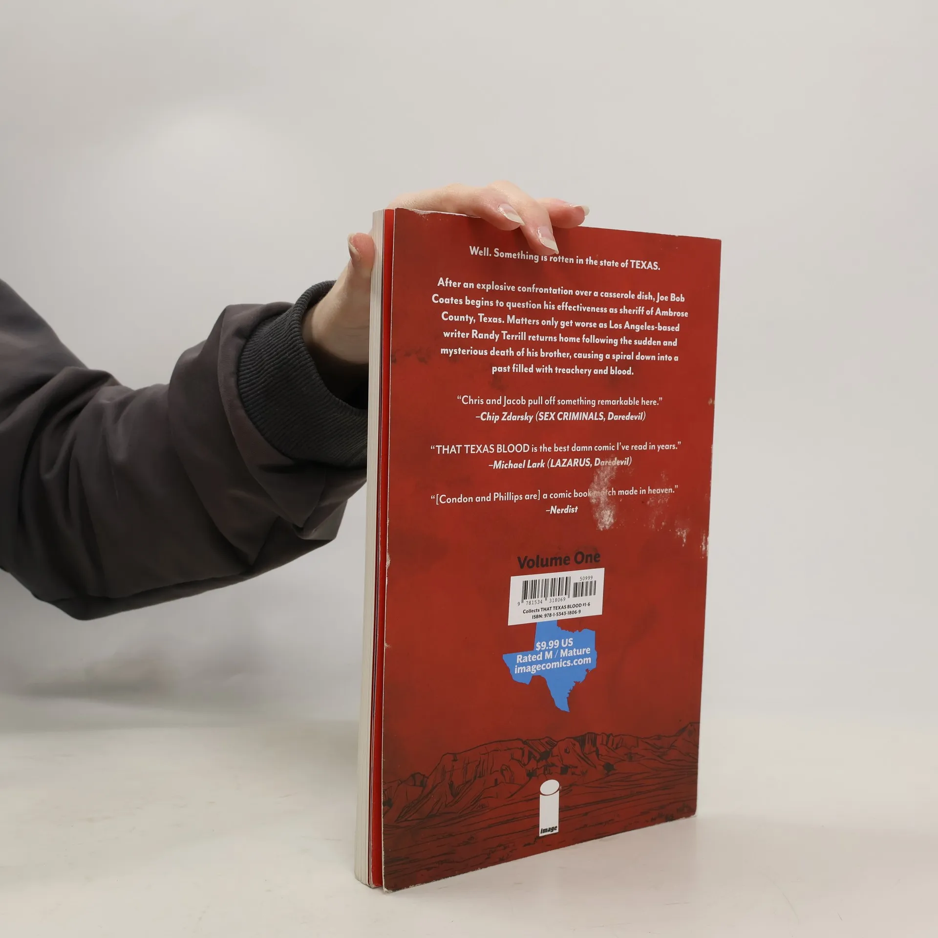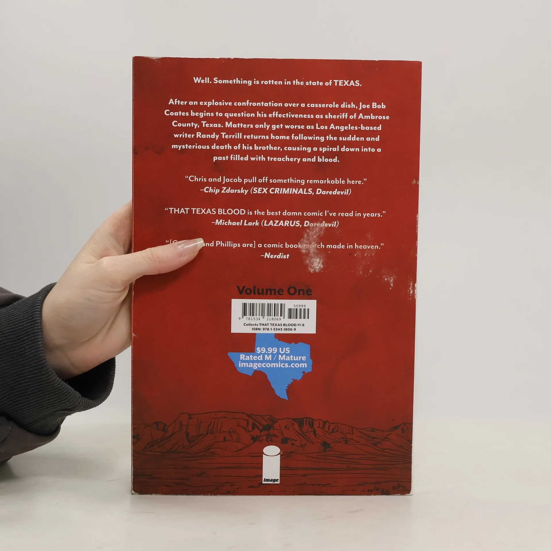 After an explosive confrontation over a casseroledish, Joe Bob Coates begins to question his effectiveness as Sheriff of AmbroseCounty, Texas. Matters only get worse as Los Angeles-based writer Randy Terrillreturns home following the sudden and mysterious death of his brother, causing aspiral down into a past filled with treachery and blood. Collects THAT TEXAS BLOOD#1-6