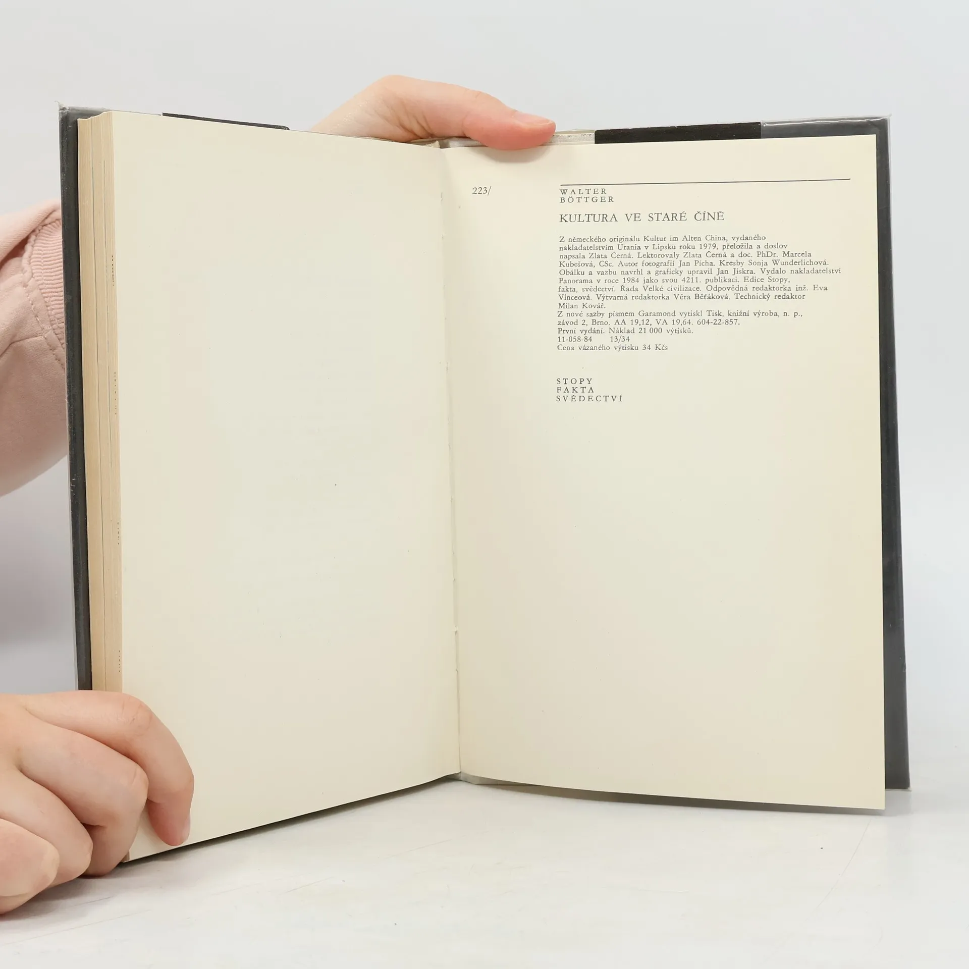 Velice zajímavá kniha o starověké Číně s mnoha ilustracemi a fotografickou přílohou (barevnou i černobílou). Obsahuje tyto části: Přírodní předpoklady a počátky čínské kultury, Krátký výlet do dějin, Materiální kultura (např. zemědělství, řemesla, obydlí,příprava pokrmů, odívání, zbraně), Sociální kultura (rodina, manželství, stát, společnost), Duchovní kultura (náboženství, věda, umění), Další osudy tradiční čínské kultury, Slovo k českému čtenáři.