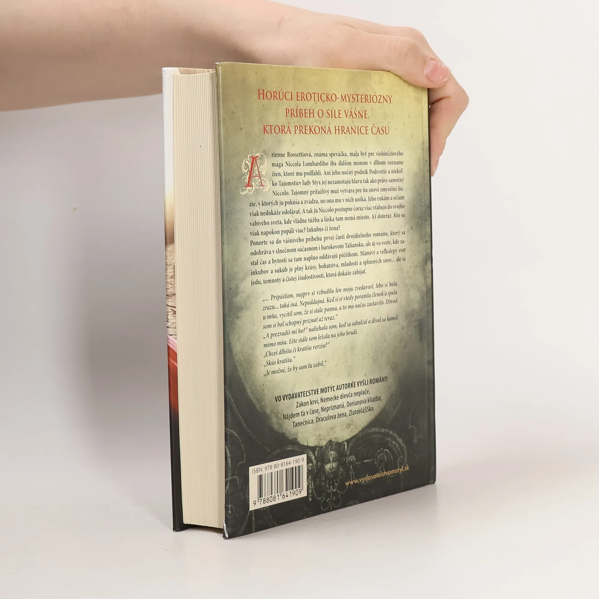 Horúci eroticko-mysteriózny príbeh o vášnivej láske, ktorá prekonáva čas. Arienne Rossettiová, známa speváčka, sa stáva objektom záujmu violončelového mága Niccola Lombardiho, ktorý ju zaujme viac, než by si kedy predstavovala. Jeho nočný podnik Podsvetie a tajomstvá lady Styx ju síce fascinujú, ale skutočná príťažlivosť prichádza od samotného Niccola. Tento tajomný a príťažlivý muž ju vťahuje do sveta plného zmyselných ilúzií, v ktorých ju pokúša a zvádza, no ona mu uniká. Napriek tomu, jeho pohľady a dotyky sú pre ňu neodolateľné. Niccolo ju postupne zasahuje do svojho vábivého, ale nebezpečného sveta, kde túžba prevláda nad láskou. Kto sa napokon spáli viac – inkubus alebo ľudská žena? Vstúpte do vášnivého príbehu, ktorý sa odohráva v súčasnom a barokovom Taliansku, ale aj v čase, kde sa bytosti oddávajú pôžitkom. Mámivý svet inkubov a sukub je plný krásy, bohatstva a splnených snov, no aj temnoty a žiadostivosti, ktorá môže zabíjať. „Pripúšťam, najprv si vzbudila len moju zvedavosť... Dôvod som si bol schopný priznať až teraz.“ „A prezradíš mi ho?“ „Chceš dlhšiu či kratšiu verziu?“ „Skús kratšiu.“ „Je možné, že by som ťa zabil.“
