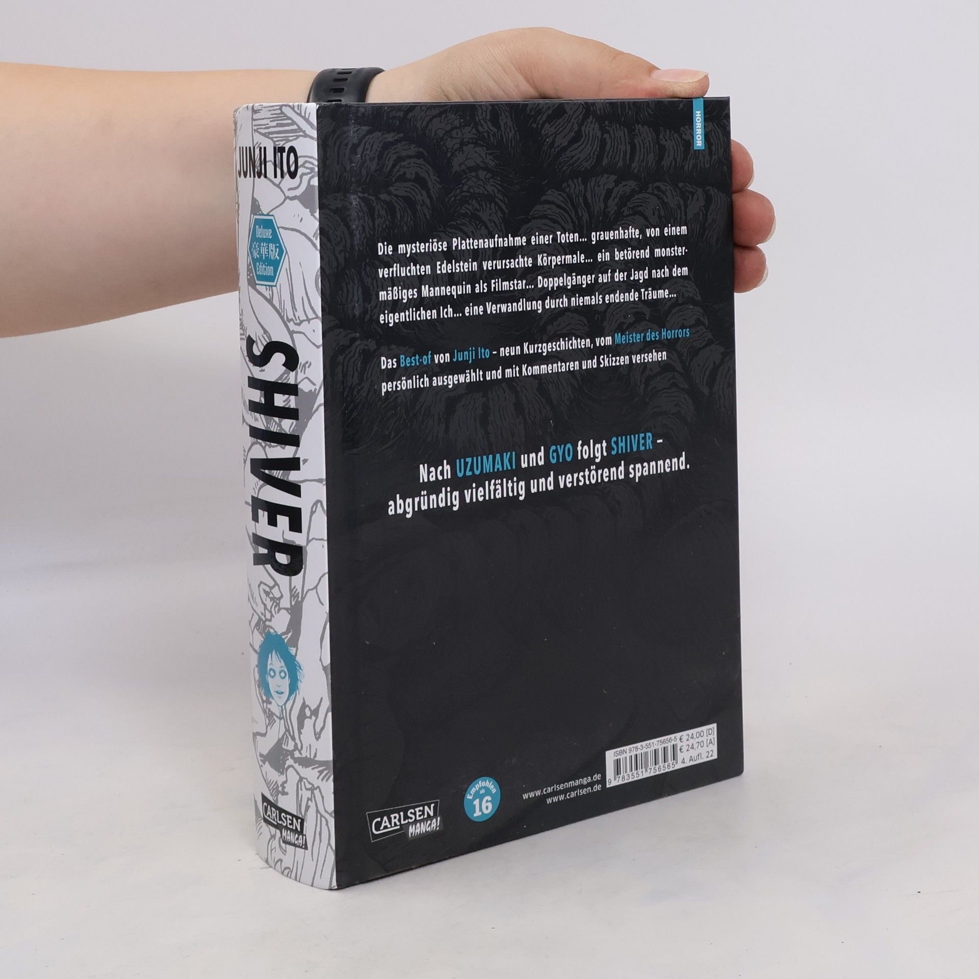 Das Best-of von Junji Ito – neun Kurzgeschichten vom Meister des Horrors selbst ausgewählt und mit persönlichen Kommentaren versehen. Die mysteriöse Plattenaufnahme einer Toten, grauenhafte Körpermale verursacht von einem verfluchten Edelstein, ein betörend-monstermäßiges Mannequin als Filmstar, Doppelgänger auf der Jagd nach dem eigentlichen Ich, eine Verwandlung durch niemals endende Träume... Junji Ito versteht das Handwerk des Übernatürlichen wie kaum ein anderer und beweist in SHIVER mit dieser Sammlung sein vielfältiges Talent, Reales in Horror zu verwandeln. Nach UZUMAKI und GYO folgt mit SHIVER die dritte Ausgabe des Ausnahmekünstlers bei Carlsen Manga - abgründig vielfältig und verstörend spannend.