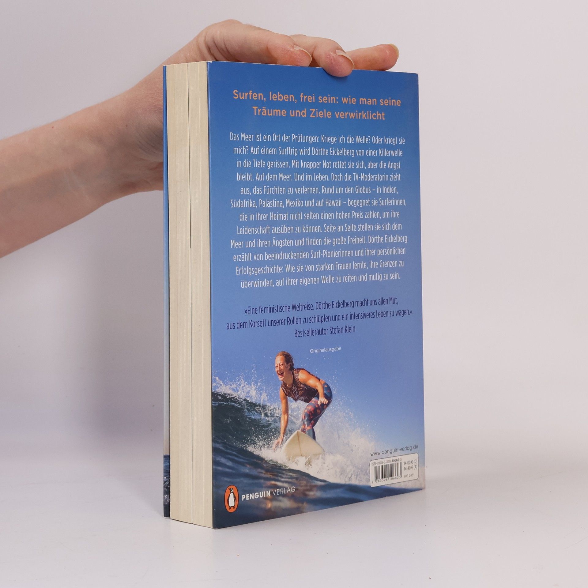 »Ein Buch, das unter die Haut geht und vom Mut erzählt, der hinter vielen großen Leidenschaften steckt. Nicht nur für Surfer – sondern für alle, die es wagen, tief in verschiedene Kulturen einzutauchen und sich von starken Frauen aus der ganzen Welt inspirieren zu lassen.« – Lea Rieck Das Meer ist ein Ort der Prüfungen: Kriege ich die Welle? Oder kriegt sie mich? Auf einem Surftrip wird Dörthe Eickelberg von einer Killerwelle in die Tiefe gerissen. Mit knapper Not rettet sie sich, aber die Angst bleibt. Auf dem Meer. Und im Leben. Doch die TV-Moderatorin zieht aus, das Fürchten zu verlernen. Rund um den Globus – in Indien, Südafrika, Palästina, Mexiko und auf Hawaii – begegnet sie Surferinnen, die in ihrer Heimat nicht selten einen hohen Preis zahlen, um ihre Leidenschaft ausüben zu können. Seite an Seite stellen sie sich dem Meer und ihren Ängsten und finden die große Freiheit. Dörthe Eickelberg erzählt von beeindruckenden Surf-Pionierinnen und ihrer persönlichen Erfolgsgeschichte: Wie sie von starken Frauen lernte, ihre Grenzen zu überwinden, auf ihrer eigenen Welle zu reiten und mutig zu sein. Das Buch enthält zahlreiche beeindruckende Farbfotos. Ausstattung: mit buntem Bildteil