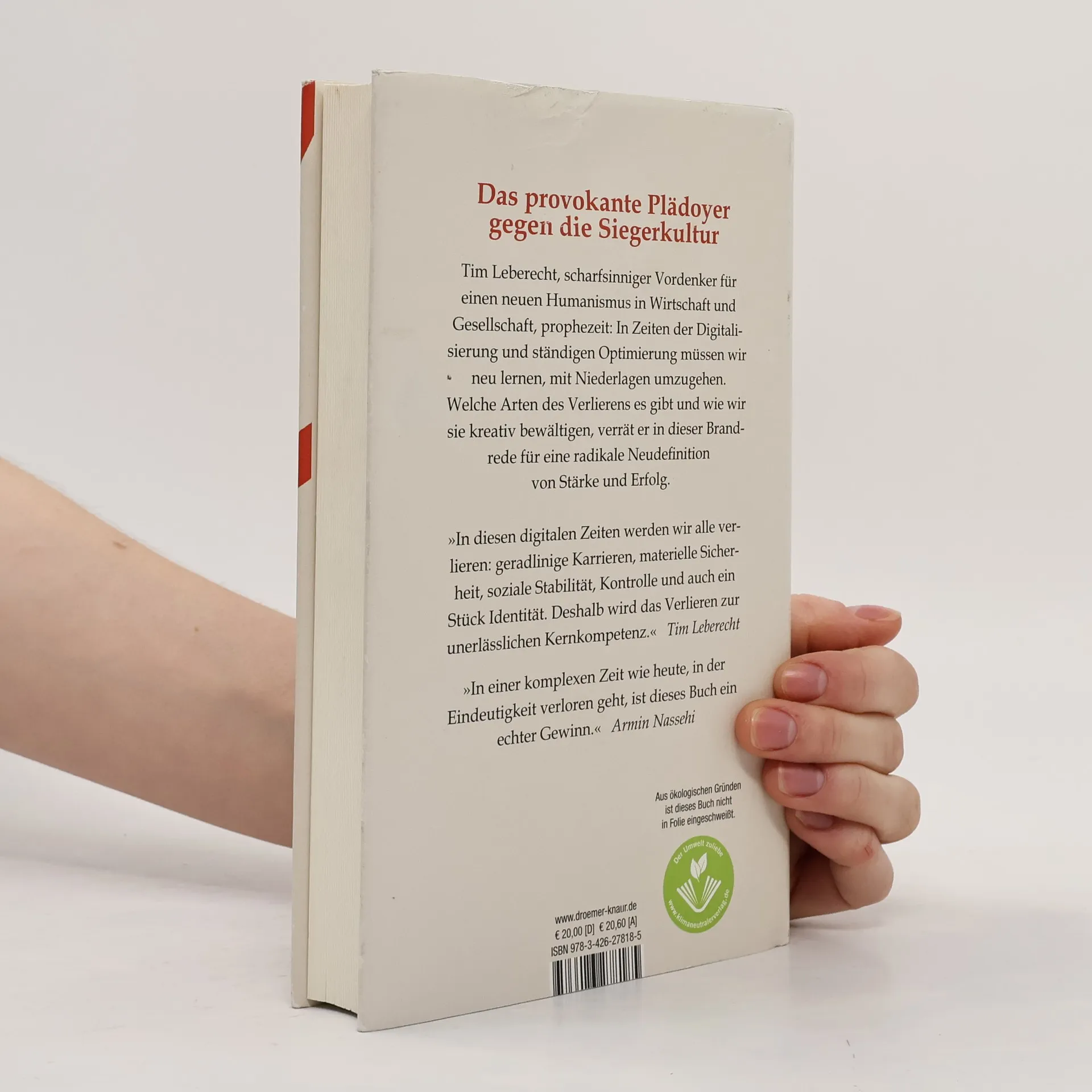 Tim Leberecht, scharfsinniger Vordenker für einen neuen Humanismus in Wirtschaft und Gesellschaft, prophezeit: In Zeiten der Digitalisierung und der ständigen Optimierung müssen wir neu lernen, mit Niederlagen umzugehen. Verlieren wird sogar zur unerlässlichen Kernkompetenz. Welche Arten des Verlierens es gibt und wie wir gut damit zurechtkommen, verrät er in diesem leidenschaftlichen, gesellschaftskritischen Aufruf zu mehr Menschlichkeit. Wie Sie Kunden gewinnen, wie Sie Menschen gewinnen, wie Sie im Leben gewinnen: Das Dogma vom Gewinnen-Müssen ist ungebrochen. Über das Verlieren spricht keiner – aus Angst, als Versager dazustehen. Tim Leberecht sieht darin jedoch eine große Chance: Denn nur eine Gesellschaft, in der wir verlieren können, ohne als Verlierer abgestempelt zu werden, ist eine humane Gesellschaft. Leberecht stellt die vorherrschende Winners-take-all-Mentalität infrage, geht auf verschiedene Arten des Verlierens ein und beschreibt Strategien, wie wir mit Niederlagen und Verlusten produktiv umgehen können. Sie reichen von sozialer staatlicher Fürsorge über Raum für Negativerfahrungen in der Arbeitswelt bis hin zum bewussten persönlichen Verzicht. Eine scharfsinnige Beobachtung unserer Gesellschaft, ein radikaler Tabubruch, der die Verletzlichkeit in einer durchoptimierten Welt als Stärke begreift, und die anregende Utopie einer zutiefst menschlichen Gesellschaft der guten Verlierer.