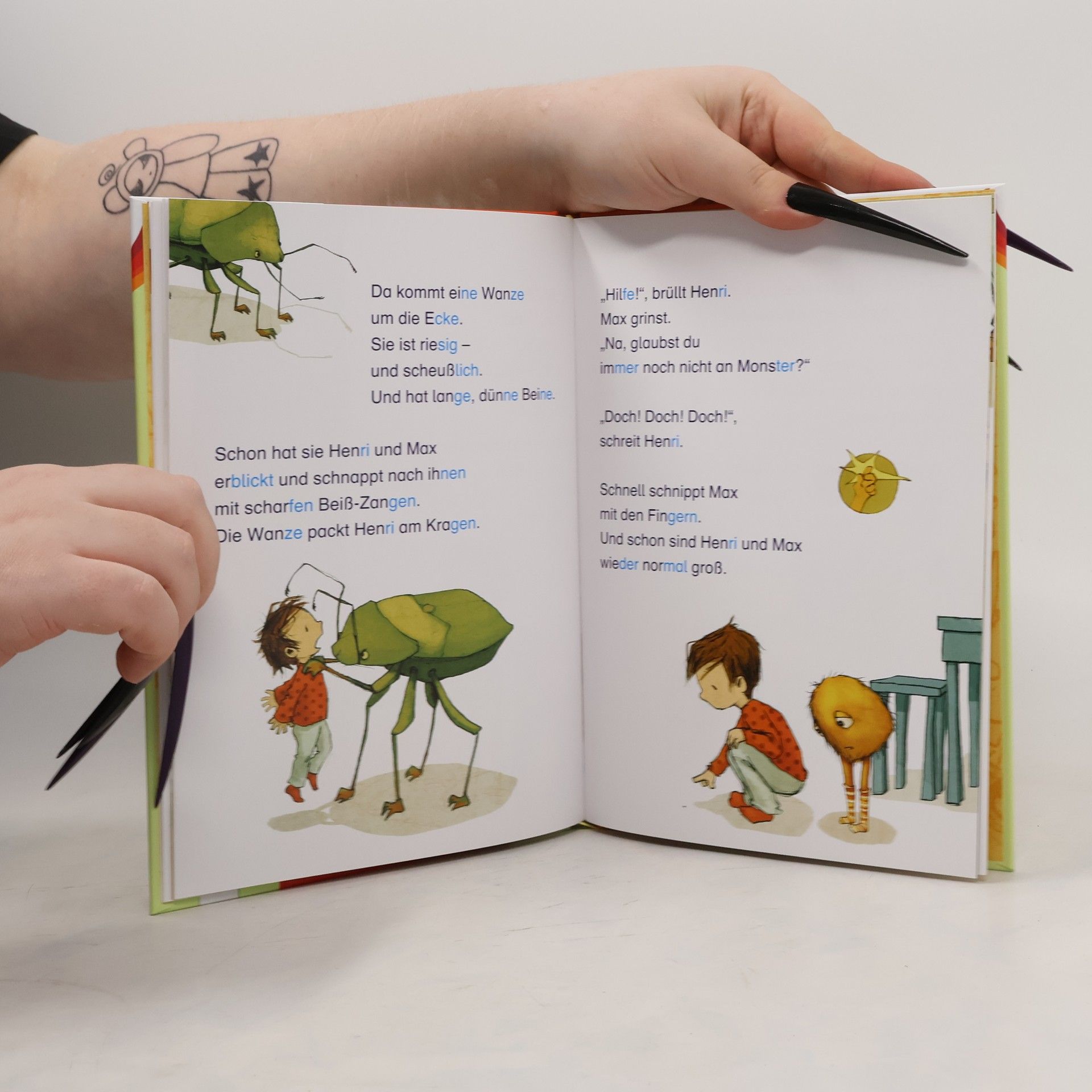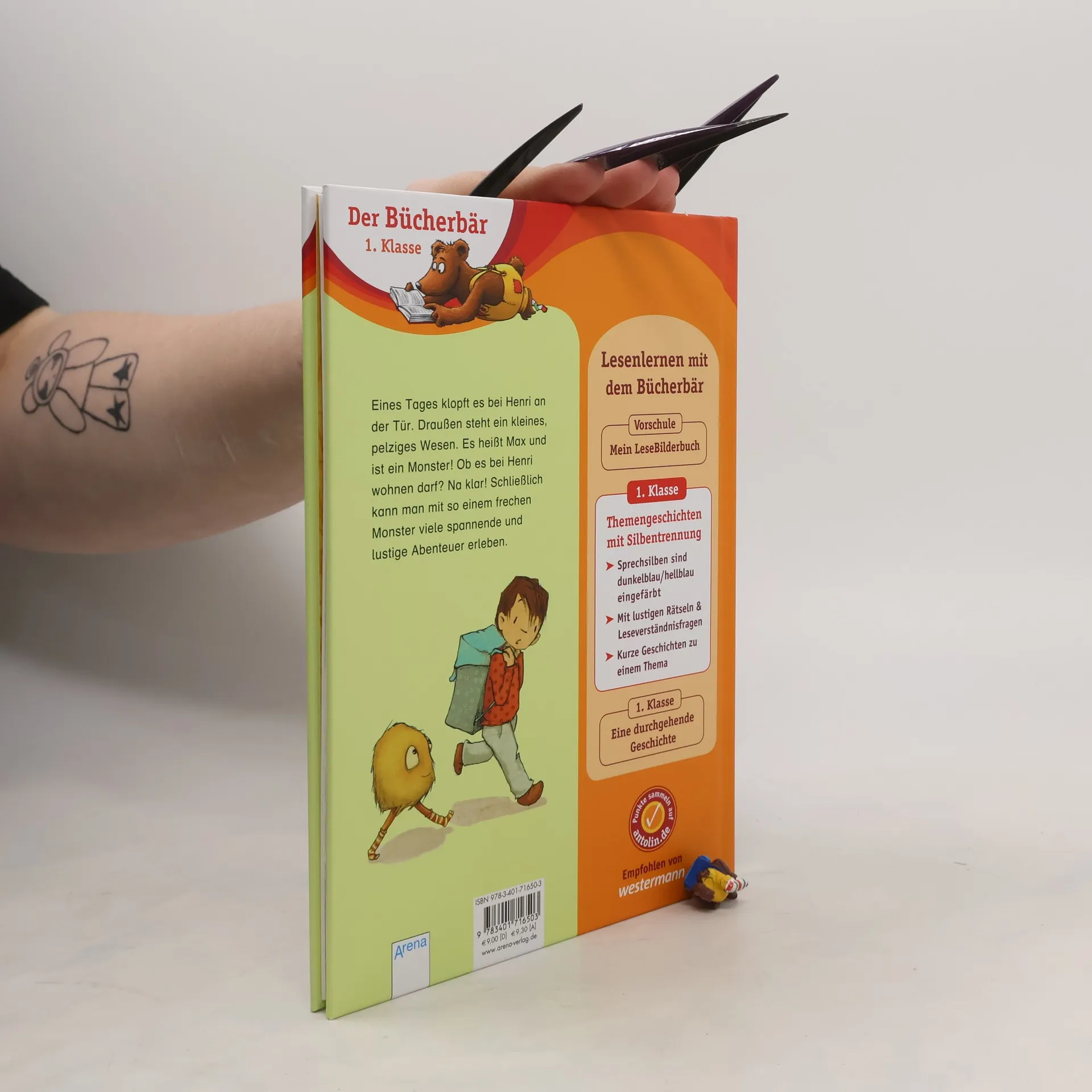 Eines Tages klopft es bei Henri an der Tür. Draußen steht ein kleines, pelziges Wesen. Es heißt Max und ist ein Monster! Ob es bei Henri wohnen darf? Na klar! Schließlich kann man mit so einem frechen Monster viele spannende und lustige Abenteuer erleben. Vier kurze monsterstarke Geschichten über eine ganz besondere Freundschaft. Lesenlernen mit dem Bücherbär Dieses Buch richtet sich an Leseanfänger in der 1. Klasse. Die besonders übersichtlichen Leseeinheiten und kurzen Zeilen sind ideal zum Lesenlernen. Das Hervorheben der Sprechsilben in dunkelblau/hellblau hilft dabei, ein Wort richtig lesen und verstehen zu können. So können Leseanfänger jede Sprechsilbe erkennen. Zusätzlich regen lustige Rätsel und Verständnisfragen zum Nachdenken und zum Gespräch über die Geschichten an. Denn Kinder, die viel Gelegenheit zum Sprechen haben, lernen auch schneller lesen. Empfohlen von Westermann Mit Bücherbärfigur am Lesebändchen Der Titel ist auf Antolin.de gelistet