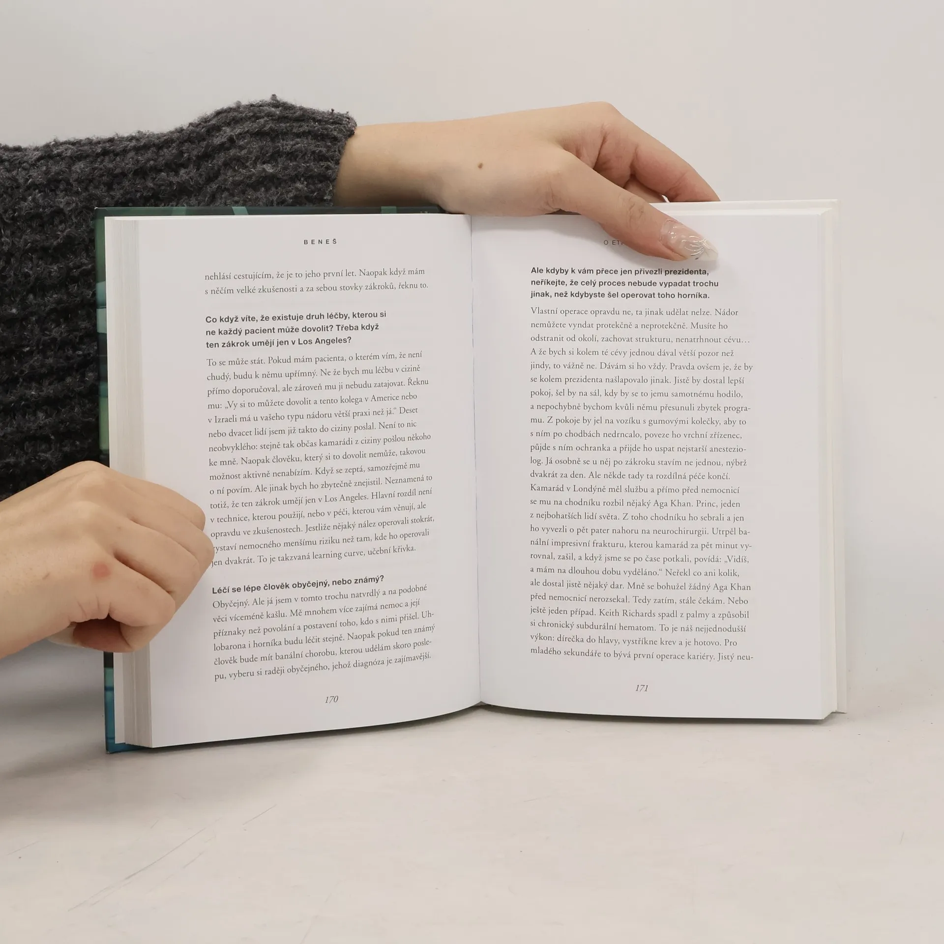 Upřímná zpověď našeho nejznámějšího neurochirurga přináší pohled na život, smrt, naději a zázraky moderní medicíny. Autor se zabývá otázkami o mozku, jeho bolesti a prevenci těžkých onemocnění, jako jsou parkinson, alzheimer či mozkové nádory. Diskutuje o etice sdělování pravdy pacientům a o možnosti rozhodování o vlastním životě. Kniha je rozhovorem s lékařem, který má na svém kontě přes osm tisíc operací a patří k nejlepším na světě. Jeho názory jsou přímé a provokativní, přičemž se nebojí přiznat, že chirurgové mají kromě sebevědomí také strach. Při operacích mozku totiž o životě a smrti rozhodují milimetry. Autor vyjadřuje, že strach je nezbytný, aby chirurg mohl operovat bezpečně, a že bez něj by mohl pacientovi ublížit. Beneš poutavě vypráví o pacientech, doktorech, lékařské etice, víře, eutanazii, výčitkách a radosti z úspěšných operací. Zmiňuje také lékařské seriály, úplatky ve zdravotnictví, studia za minulého režimu a své zážitky z cestování po světě, kde loví brouky s kamarádem. Jeho příběh je kombinací odbornosti, osobních zkušeností a reflexí nad důležitými otázkami medicíny a lidského života.