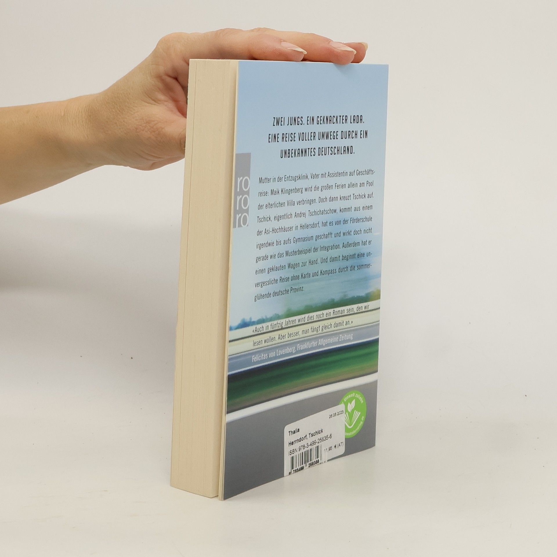 «Ein klappriges Auto kam die Straße runtergefahren. Es fuhr langsam auf unser Haus zu und bog in die Garagenauffahrt ein. Eine Minute stand der hellblaue Lada Niva mit laufendem Motor vor unserer Garage, dann wurde der Motor abgestellt. Die Fahrertür ging auf, Tschick stieg aus. Er legte beide Ellenbogen aufs Autodach und sah zu, wie ich den Rasen sprengte. ‹Ah›, sagte er, und dann sagte er lange nichts mehr. ‹Macht das Spaß?›» Mutter in der Entzugsklinik, Vater mit Assistentin auf Geschäftsreise: Maik Klingenberg wird die großen Ferien allein am Pool der elterlichen Villa verbringen. Doch dann kreuzt Tschick auf. Tschick, eigentlich Andrej Tschichatschow, kommt aus einem der Asi-Hochhäuser in Hellersdorf, hat es von der Förderschule irgendwie bis aufs Gymnasium geschafft und wirkt doch nicht gerade wie das Musterbeispiel der Integration. Außerdem hat er einen geklauten Wagen zur Hand. Und damit beginnt eine Reise ohne Karte und Kompass durch die sommerglühende deutsche Provinz, unvergesslich wie die Flussfahrt von Tom Sawyer und Huck Finn.