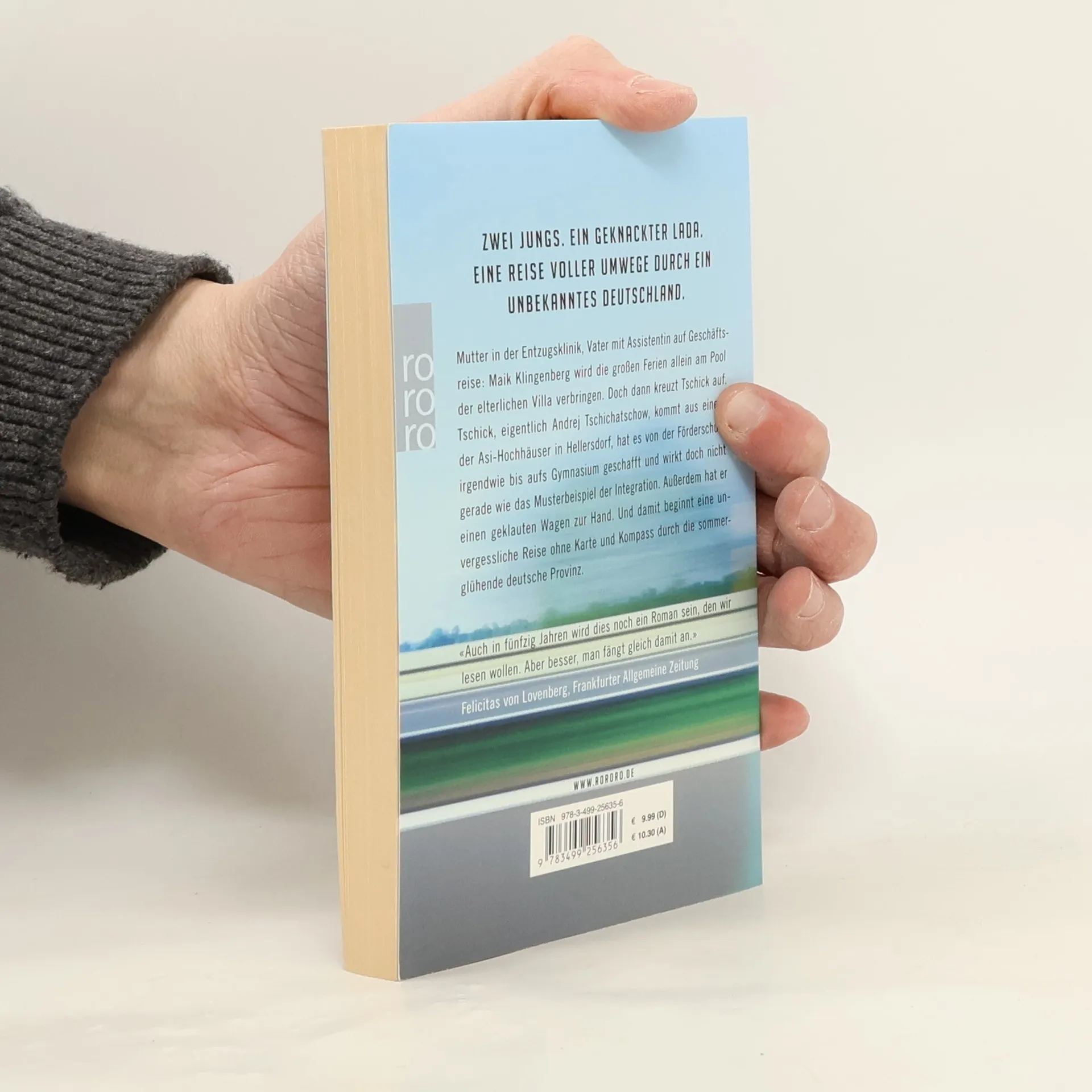 «Ein klappriges Auto kam die Straße runtergefahren. Es fuhr langsam auf unser Haus zu und bog in die Garagenauffahrt ein. Eine Minute stand der hellblaue Lada Niva mit laufendem Motor vor unserer Garage, dann wurde der Motor abgestellt. Die Fahrertür ging auf, Tschick stieg aus. Er legte beide Ellenbogen aufs Autodach und sah zu, wie ich den Rasen sprengte. ‹Ah›, sagte er, und dann sagte er lange nichts mehr. ‹Macht das Spaß?›» Mutter in der Entzugsklinik, Vater mit Assistentin auf Geschäftsreise: Maik Klingenberg wird die großen Ferien allein am Pool der elterlichen Villa verbringen. Doch dann kreuzt Tschick auf. Tschick, eigentlich Andrej Tschichatschow, kommt aus einem der Asi-Hochhäuser in Hellersdorf, hat es von der Förderschule irgendwie bis aufs Gymnasium geschafft und wirkt doch nicht gerade wie das Musterbeispiel der Integration. Außerdem hat er einen geklauten Wagen zur Hand. Und damit beginnt eine Reise ohne Karte und Kompass durch die sommerglühende deutsche Provinz, unvergesslich wie die Flussfahrt von Tom Sawyer und Huck Finn.