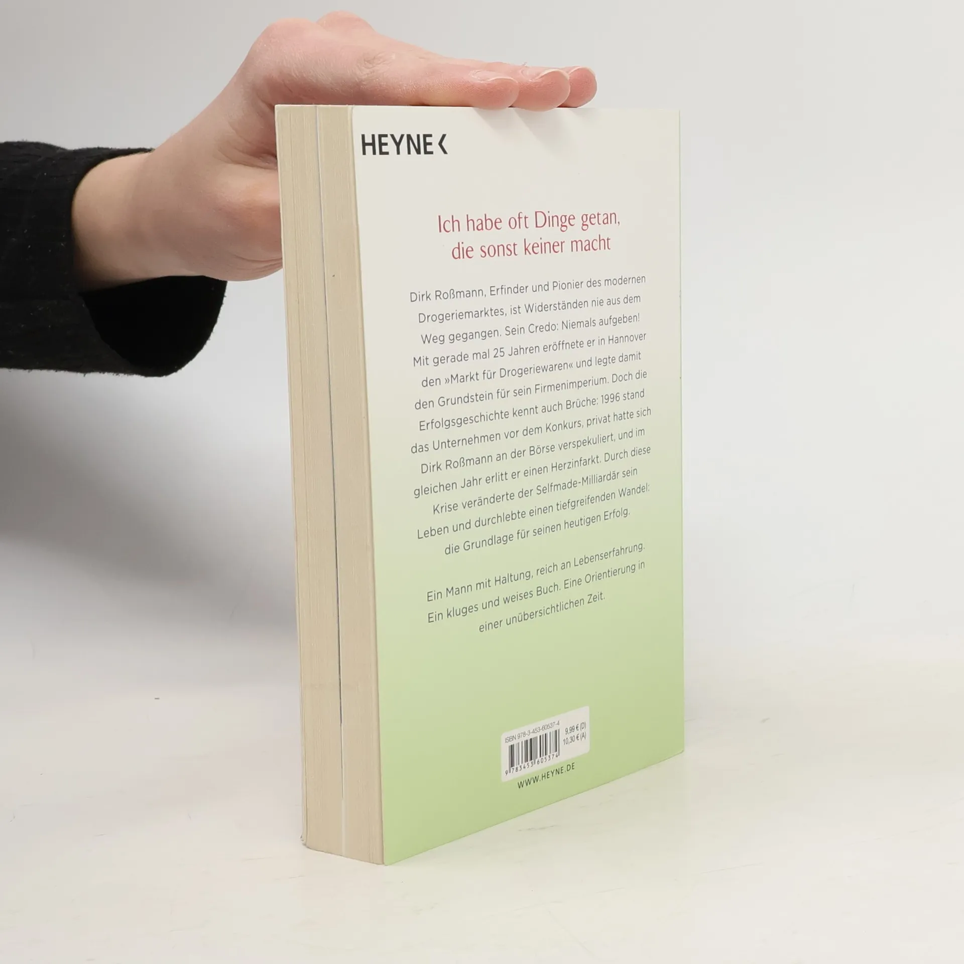 Ich habe oft Dinge getan, die sonst keiner macht Er ist ein Mann der Widersprüche. Harter Wettbewerber einerseits, sozial engagiert andererseits. Dirk Roßmann, Erfinder und Pionier des modernen Drogeriemarktes, große Unternehmerpersönlichkeit und mehrfacher Millionär. Widerständen ist er nie aus dem Weg gegangen. Sein Credo: Niemals aufgeben! Bereits im Alter von 12 zeigte sich sein Unternehmergeist: Er lieferte Drogerieartikel mit dem Fahrrad aus und verkaufte sie 10 Prozent billiger. Mit gerade mal 25 Jahren eröffnete er in Hannover den „Markt für Drogeriewaren“ und legte damit den Grundstein für seine Firma. Doch die Erfolgsgeschichte kennt auch Brüche: 1996 stand das Unternehmen vor dem Konkurs, privat hatte sich Dirk Roßmann an der Börse verspekuliert, und im gleichen Jahr erlitt er einen Herzinfarkt. „Von da an habe ich alles auf Null gestellt und versucht, die Firma zu retten.“ Durch diese Krise veränderte Dirk Roßmann sein Leben und durchlebte einen tiefgreifenden Wandel. Das sieht er heute als Grund für seinen Erfolg an. Ein Mann mit Haltung, reich an Lebenserfahrung, ein kluges und weises Buch, Orientierung in einer unübersichtlichen Zeit. Ausstattung: mit Bildteil