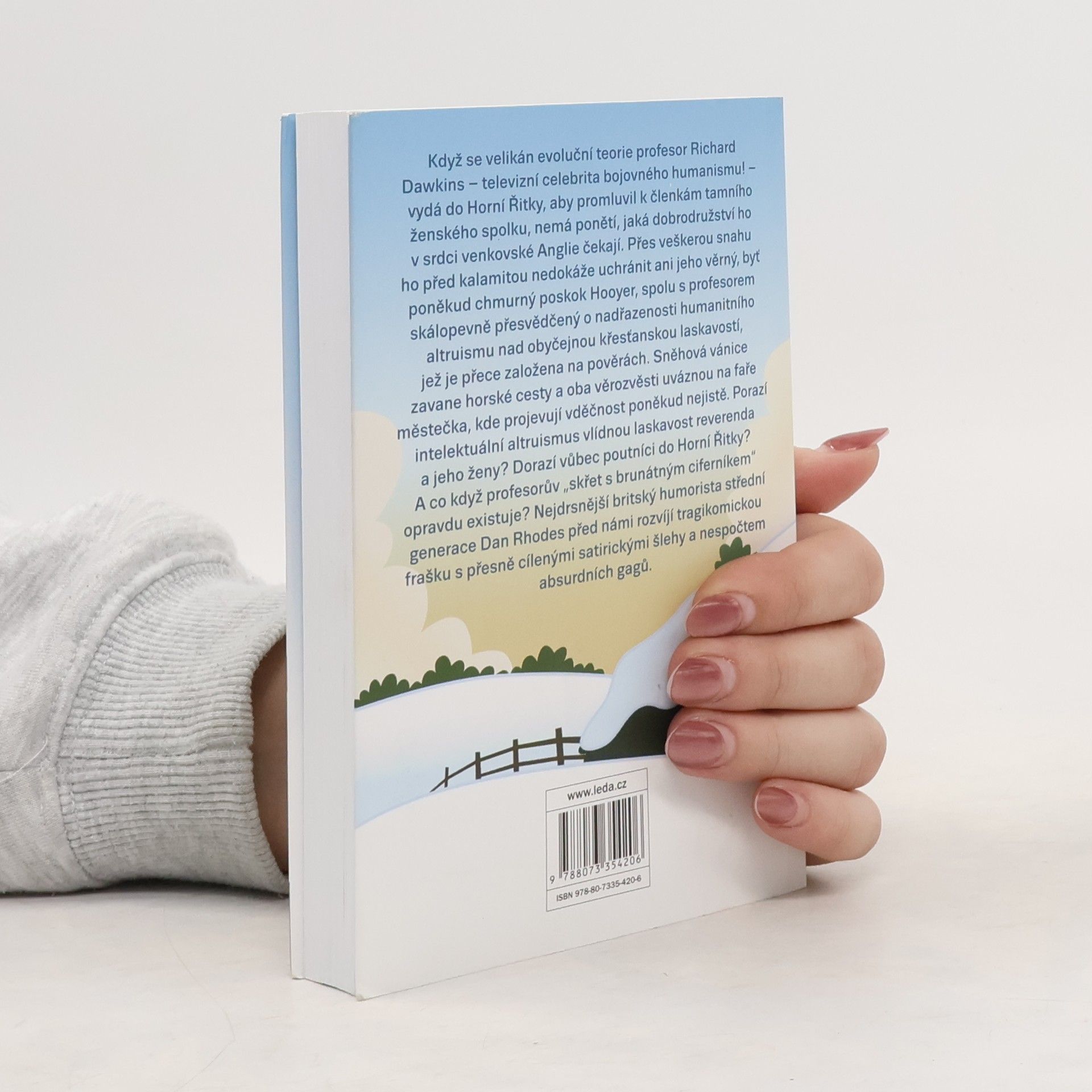 Když se velikán evoluční teorie profesor Richard Dawkins – televizní celebrita bojovného humanismu! – vydá do Horní Řitky, aby promluvil k členkám tamního ženského spolku, nemá ponětí, jaká dobrodružství ho v srdci venkovské Anglie čekají. Přes veškerou snahu ho před kalamitou nedokáže uchránit ani jeho věrný, byť poněkud chmurný poskok Hooyer, spolu s profesorem skálopevně přesvědčený o nadřazenosti humanitního altruismu nad obyčejnou křesťanskou laskavostí, jež je přece založena na pověrách. Sněhová vánice zavane horské cesty a oba věrozvěsti uváznou na faře městečka, kde projevují vděčnost poněkud nejistě. Porazí intelektuální altruismus vlídnou laskavost reverenda a jeho ženy? Dorazí vůbec poutníci do Horní Řitky? A co když profesorův „skřet s brunátným ciferníkem“ opravdu existuje? Nejdrsnější britský humorista střední generace Dan Rhodes před námi rozvíjí tragikomickou frašku s přesně cílenými satirickými šlehy a nespočtem absurdních gagů.