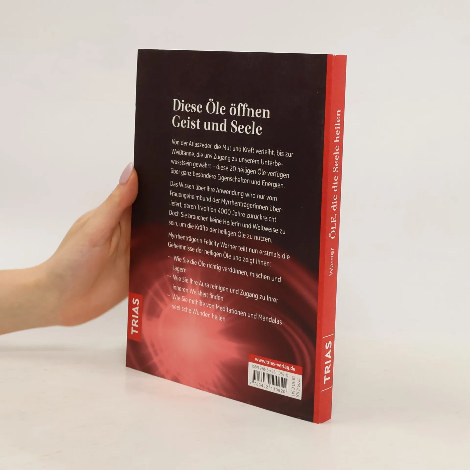 Diese Öle öffnen Geist und Seele Von der Atlaszeder, die Mut und Kraft verleiht, bis zur Weißtanne, die uns Zugang zu unserem Unterbewusstsein gewährt – diese 20 heiligen Öle verfügen über ganz besondere Eigenschaften und Energien. Das Wissen über ihre Anwendung wird nur vom Frauengeheimbund der Myrrhenträgerinnen überliefert, deren Tradition 4000 Jahre zurückreicht. Doch Sie brauchen keine Heilerin und Weltweise zu sein, um die Kräfte der heiligen Öle zu nutzen. Myrrhenträgerin Felicity Warner teilt nun erstmals die Geheimnisse der heiligen Öle und zeigt Ihnen: Wie Sie die Öle richtig verdünnen, mischen und lagern Wie Sie Ihre Aura reinigen und Zugang zu Ihrer inneren Weisheit finden Wie Sie mithilfe von Meditationen und Mandalas seelische Wunden heilen