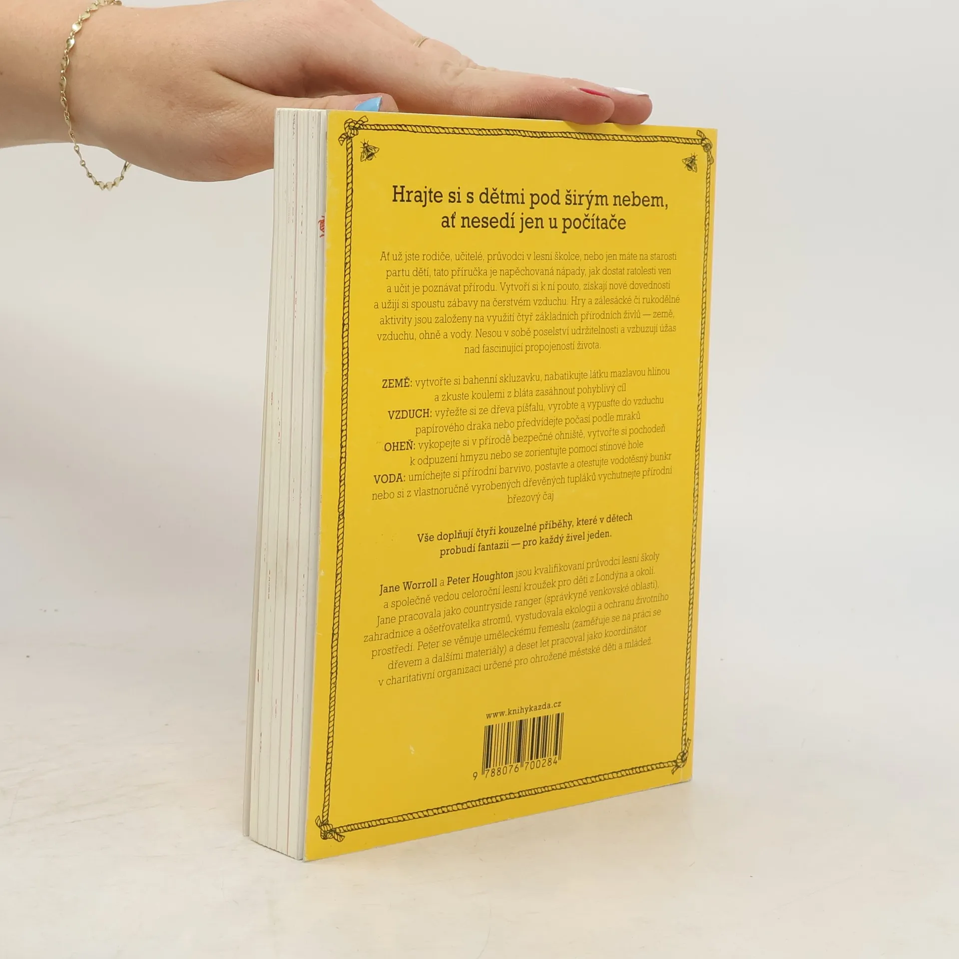 Hry a zálesácké či rukodělné aktivity jsou založeny na využití čtyř základních přírodních živlů — země, vzduchu, ohně a vody. Nesou v sobě poselství udržitelnosti a vzbuzují úžas nad fascinující propojeností života. Ať už jste rodiče, učitelé, průvodci v lesní školce, nebo jen máte na starosti partu dětí, tato příručka je napěchovaná nápady, jak dostat ratolesti ven a učit je poznávat přírodu. Vytvoří si k ní pouto, získají nové dovednosti a užijí si spoustu zábavy na čerstvém vzduchu. Hry a zálesácké či rukodělné aktivity jsou založeny na využití čtyř základních přírodních živlů — země, vzduchu, ohně a vody. Nesou v sobě poselství udržitelnosti a vzbuzují úžas nad fascinující propojeností života. ZEMĚ: vytvořte si bahenní skluzavku, nabatikujte látku mazlavou hlínou a zkuste koulemi z bláta zasáhnout pohyblivý cíl VZDUCH: vyřežte si ze dřeva píšťalu, vyrobte a vypusťte do vzduchu papírového draka nebo předvídejte počasí podle mraků OHEŇ: vykopejte si v přírodě bezpečné ohniště, vytvořte si pochodeň k odpuzení hmyzu nebo se zorientujte pomocí stínové hole VODA: umíchejte si přírodní barvivo, postavte a otestujte vodotěsný bunkr nebo si z vlastnoručně vyrobených dřevěných tupláků vychutnejte přírodní březový čaj Vše doplňují čtyři kouzelné příběhy, které v dětech probudí fantazii — pro každý živel jeden.