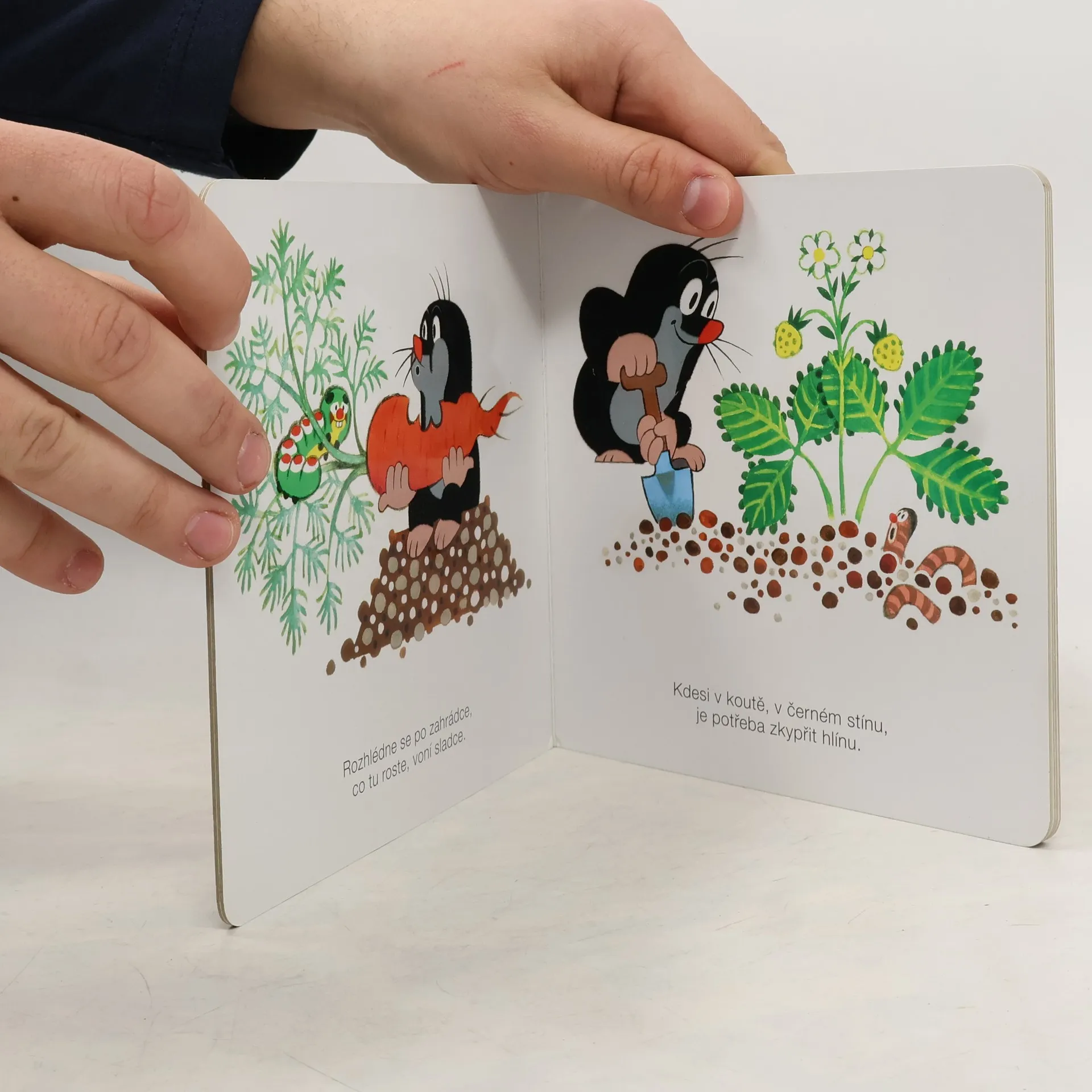 Krtka probudilo sluníčko. Bude pěkný den, a tak ho stráví na zahradě. Posnídá mrkvičku a do práce. Čekají na něj sladké jahůdky. Po dobrém obědě si odpočine, vykoupe se v rybníčku a večer znovu do postýlky. Klasické dvanáctistránkové leporelo pro nejmenší. Ilustrace Zdeňka Milera provázejí půvabné verše Josefa Bruknera.
