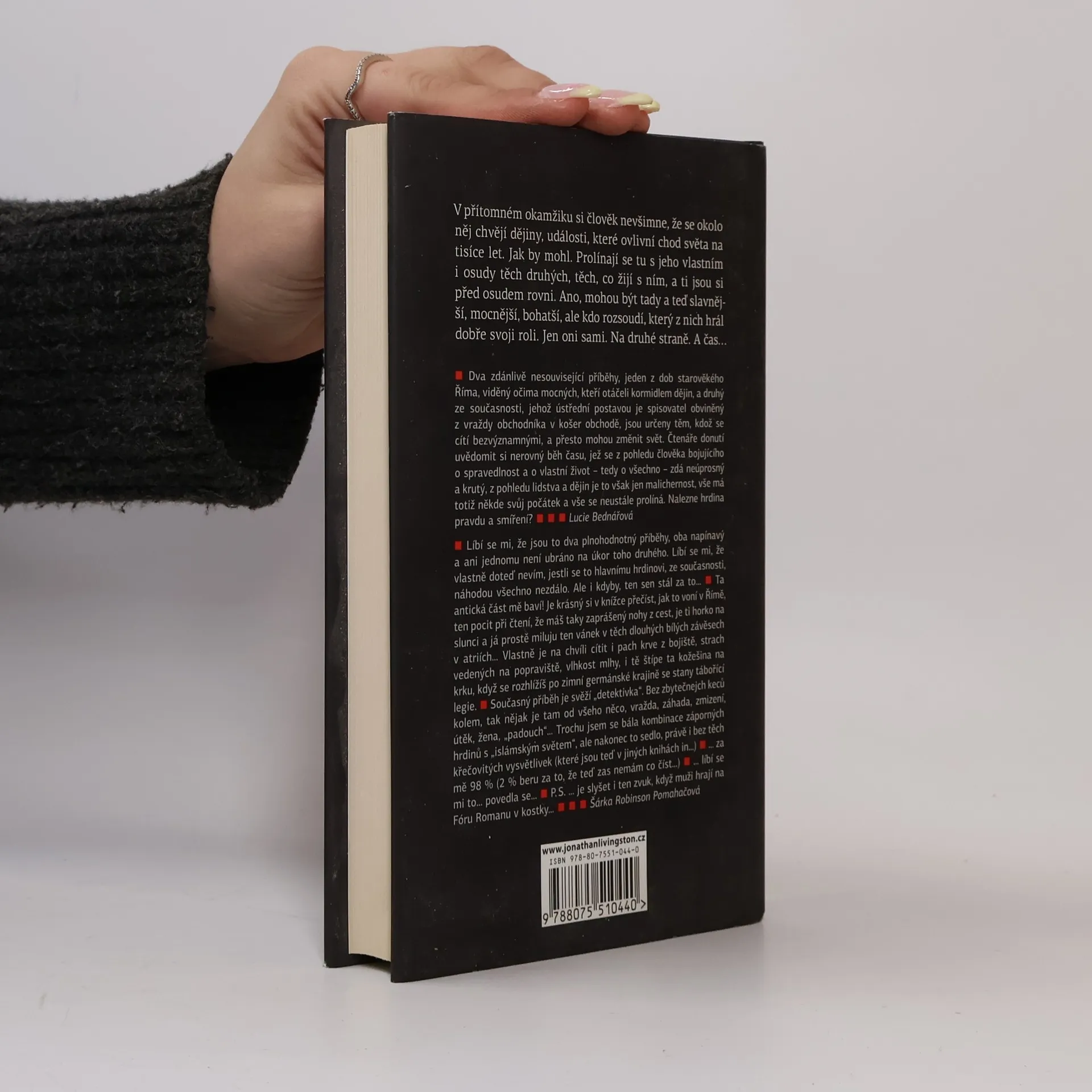 V přítomném okamžiku si člověk nevšimne, že se okolo něj chvějí dějiny, události, které ovlivní chod světa na tisíce let. Jak by mohl. Prolínají se tu, s jeho vlastním, osudy těch druhých, těch, co žijí s ním a ti jsou si před osudem rovni. Ano, mohou být tady a teď slavnější, mocnější, bohatší, ale kdo rozsoudí, který z nich hrál dobře svoji roli. Jen oni sami. Na druhé straně. A čas… Dva zdánlivě nesouvisející příběhy, jeden z dob starověkého Říma, viděný očima mocných, kteří otáčeli kormidlem dějin, a druhý ze současnosti, jehož ústřední postavou je spisovatel obviněný z vraždy obchodníka v košer obchodě, jsou určeny těm, kdož se cítí bezvýznamnými, a přesto mohou změnit svět. Čtenáře donutí uvědomit si nerovný běh času, jež se z pohledu člověka bojujícího o spravedlnost a o vlastní život – tedy o všechno – zdá neúprosný a krutý, z pohledu lidstva a dějin je to však jen malichernost, vše má totiž někde svůj počátek a vše se neustále prolíná. Nalezne hrdina pravdu a smíření?