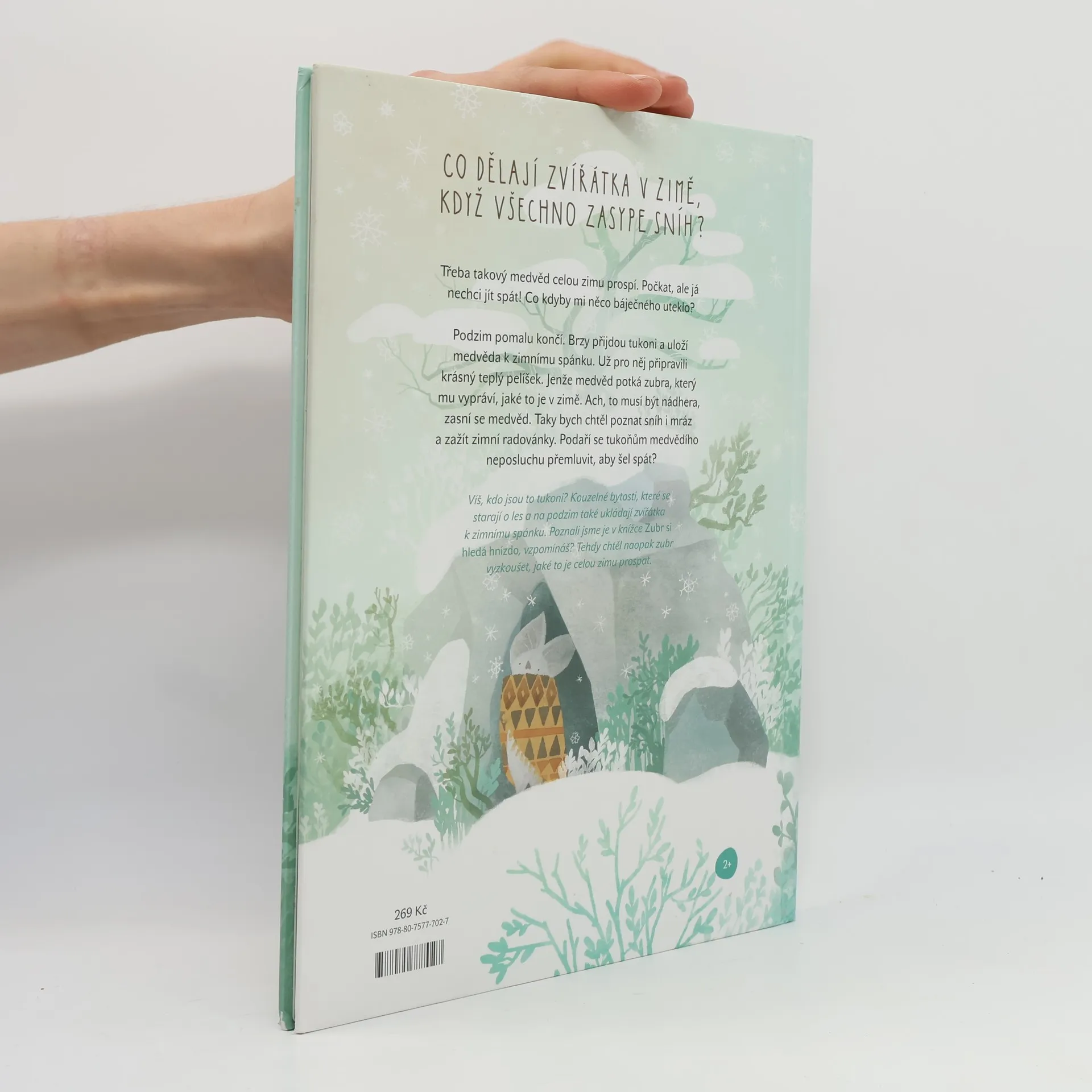 Co dělají zvířátka v zimě, když všechno zasype sníh? Třeba takový medvěd celou zimu prospí. Počkat, ale já nechci jít spát! Co kdyby mi něco báječného uteklo? Podzim pomalu končí. Brzy přijdou tukoni a uloží medvěda k zimnímu spánku. Už pro něj připravili krásný teplý pelíšek. Jenže medvěd potká zubra, který mu vypráví, jaké to je v zimě. Ach, to musí být nádhera, zasní se medvěd. Taky bych chtěl poznat sníh i mráz a zažít zimní radovánky. Podaří se tukoňům medvědího neposluchu přemluvit, aby šel spát?