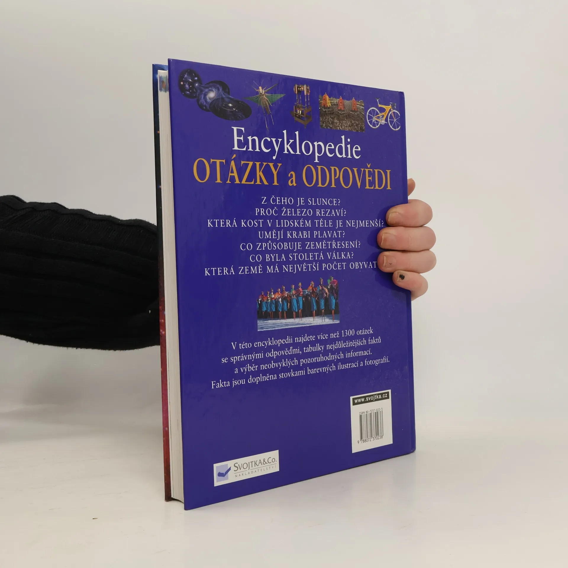 Z čeho je slunce? Proč železo rezaví? Která kost je nejmenší? Umějí krabi plavat? Co způsobuje zemětřesení? Co byla stoletá válka? Která země má největší počet obyvatel? Encyklopedie otázek a odpovědí poskytuje mladým čtenářům přístup k informacím na nejrůznější náměty. Najdete zde více než 1300 otázek se správnými odpověďmi, tabulky faktů a výběr neobvyklých pozoruhodných informací. Celá kniha je prokládána testy a navíc doplněna stovkami podrobných ilustrací a fotografií. Encyklopedie je rozdělena do následujících částí: Země a vesmír, věda, lidské tělo, zvířata a rostliny, lidé a země, dějiny.