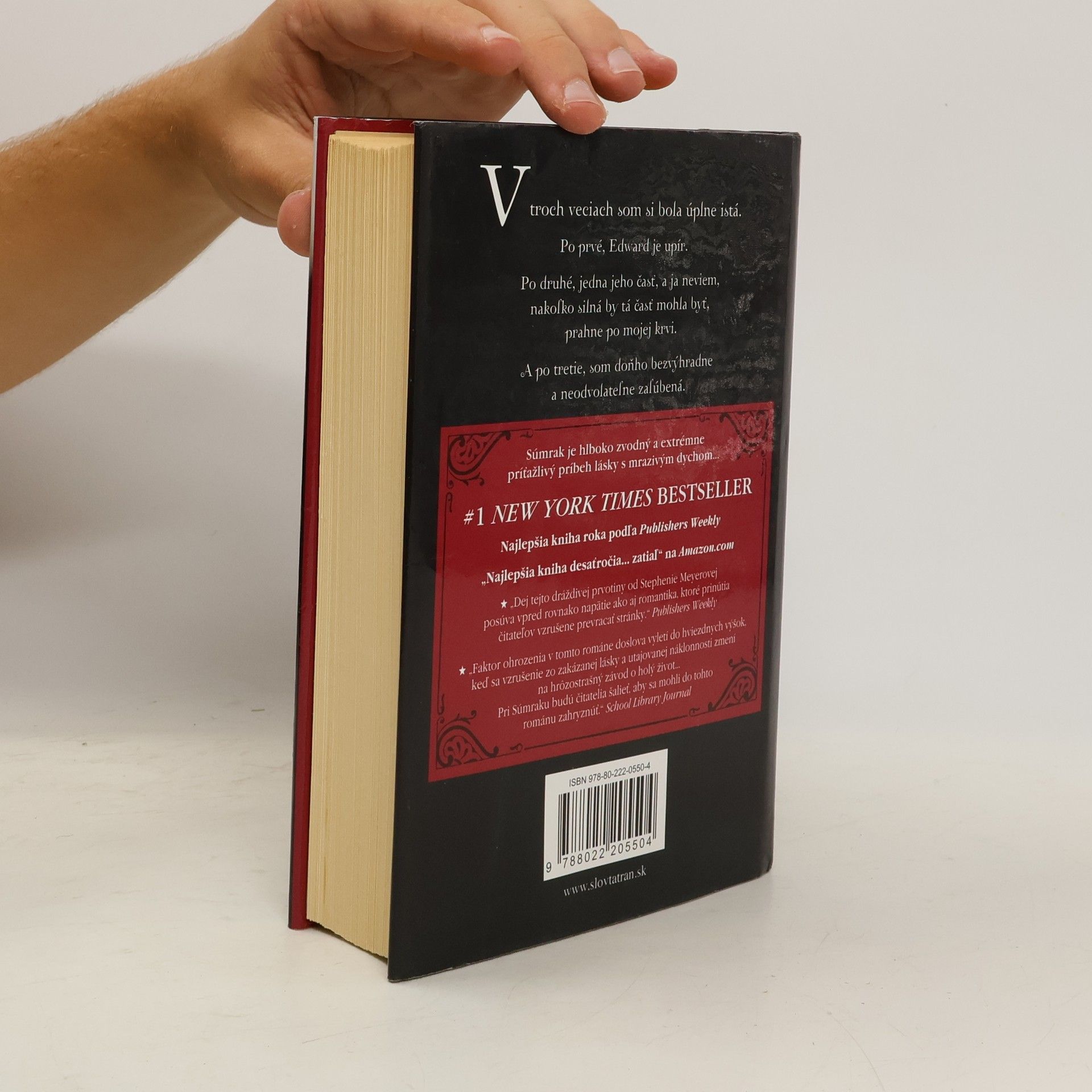 Súmrak od Stephenie Meyerovej bol po svojom vydaní mimoriadne úspešný a prilákal množstvo nadšených čitateľov. Hoci je určený mladšej vekovej kategórii, román si získal aj staršie generácie, pričom sa dostal až k babičkám. Publishers Weekly ho označil za najlepšiu knihu roka, získal ocenenie Editor's Choice v New York Times a na Amazon.com bol vyhlásený za najlepšiu knihu desaťročia. Príťažlivosť tohto diela spočíva v kombinácii shakespearovskej lásky a faktora ohrozenia, ktorý sa zintenzívňuje, keď sa zakázaná láska a utajovaná náklonnosť menia na hrôzostrašný závod o prežitie. Napätie a romantika posúvajú dej vpred a nútia čitateľov neustále otáčať stránky. Keď sa Isabella Swanová presťahuje do zamračeného Forks, stretáva záhadného Edwarda Cullena, ktorého porcelánová pokožka a nadprirodzené schopnosti ju fascinujú. Edward sa snaží skrývať svoju pravú identitu, no Bella je odhodlaná odhaliť jeho temné tajomstvo. Čím bližšie sa k nemu dostáva, tým väčšiemu riziku vystavuje seba aj svojich blízkych. Na návrat už môže byť neskoro… Súmrak je zvodný a napínavý román, ktorý čitateľa doslova priklincuje, až kým neotočí poslednú stránku.