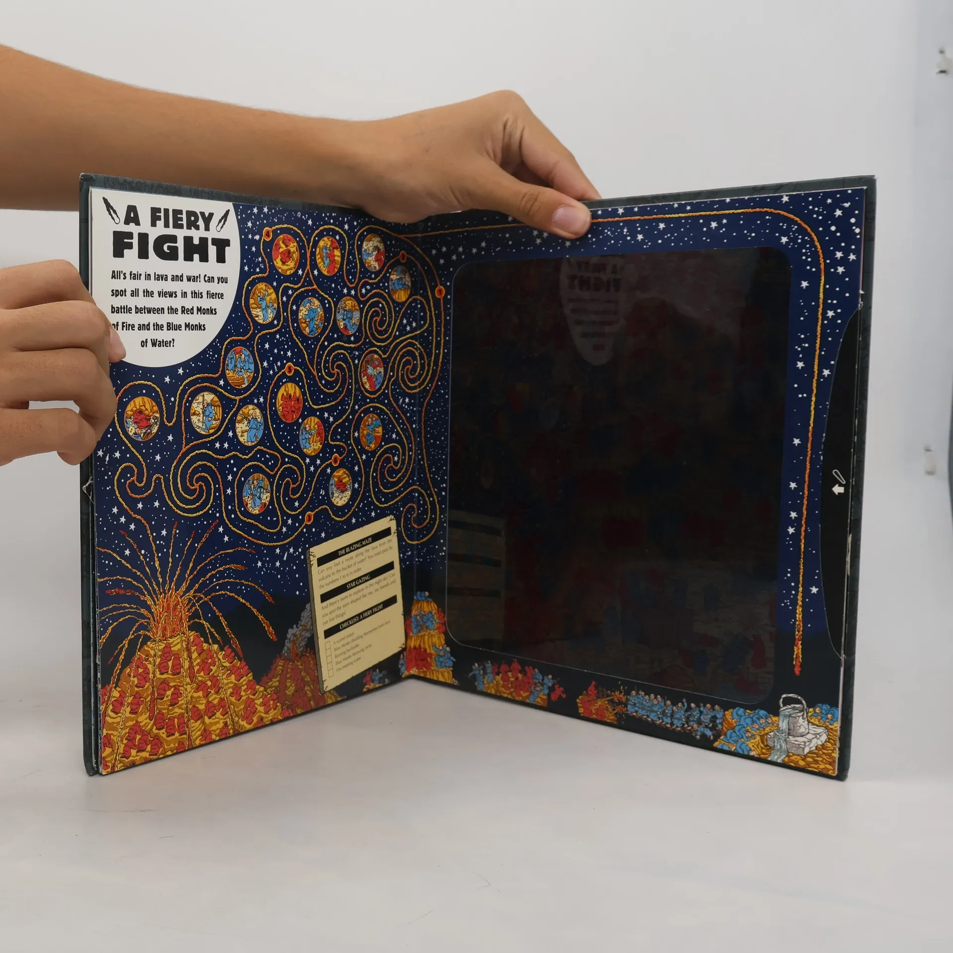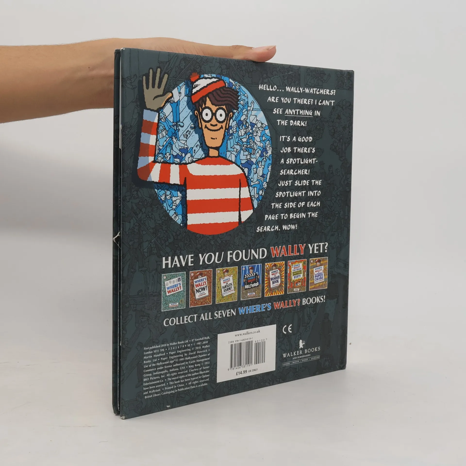 Hello…Wally-watchers? Are you there I can’t see ANYTHING in the dark! It’s a good job there’s a spotlight-searcher! Just slide the spotlight into the side of each page to begin the search. Wow!