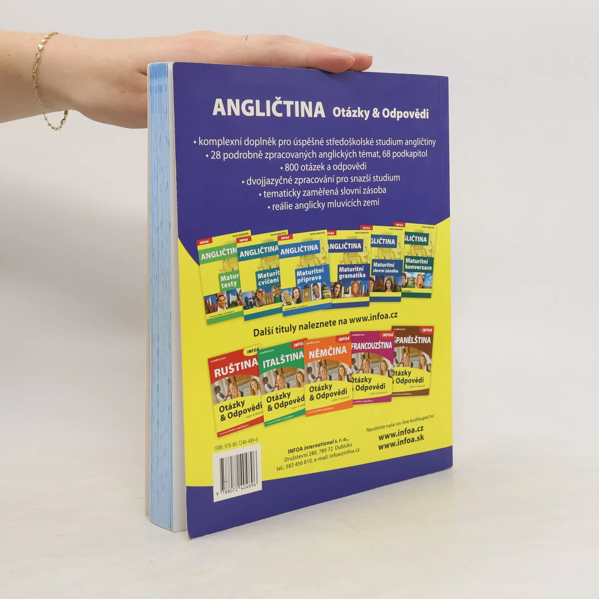 Komplexní doplněk pro úspěšné stredoškolské studium angličtiny, 28 podrobně zpracovaných témat, 68 podkapitol, 800 otázek a odpovědí, dvojjazyčné zpracování pro snazší studium, tematicky zaměřená slovní zásoba, reálie anglicky mluvících zemí, nahrávka anglických textů namluvená rodilými mluvčími V knize najdete podrobně zpracovaná témata: Rodinný život, Bydlení, Denní režim, Volný čas a zábava, Dnešní mládež, Škola a vzdělání, Volba povolání, Životopis, Pokrmy, Nakupování, Služby, Sport, Cestování, Zdraví a nemoci, Svátky, Móda a oblečení, Počasí a příroda, Umění a kultura, Média, Věda a technika, Evropská unie, Česká republika, Praha atd. Z anglických reálií témata: Spojené království Velké Británie a Severního Irska, Londýn, Spojené státy americké, Washington D. C. a jiná města v USA, Britské společenství, Anglická a americká literatura, Anglický jazyk
