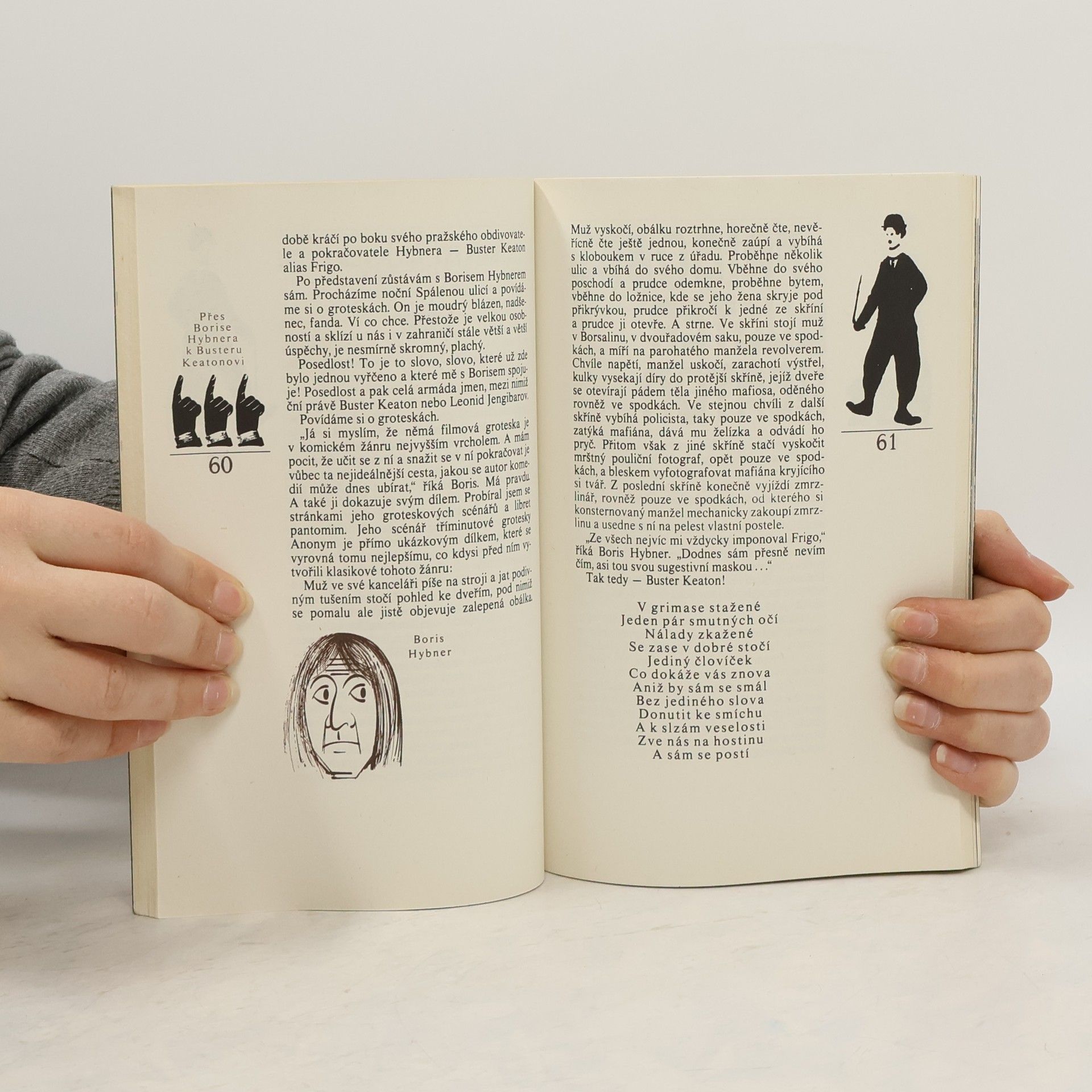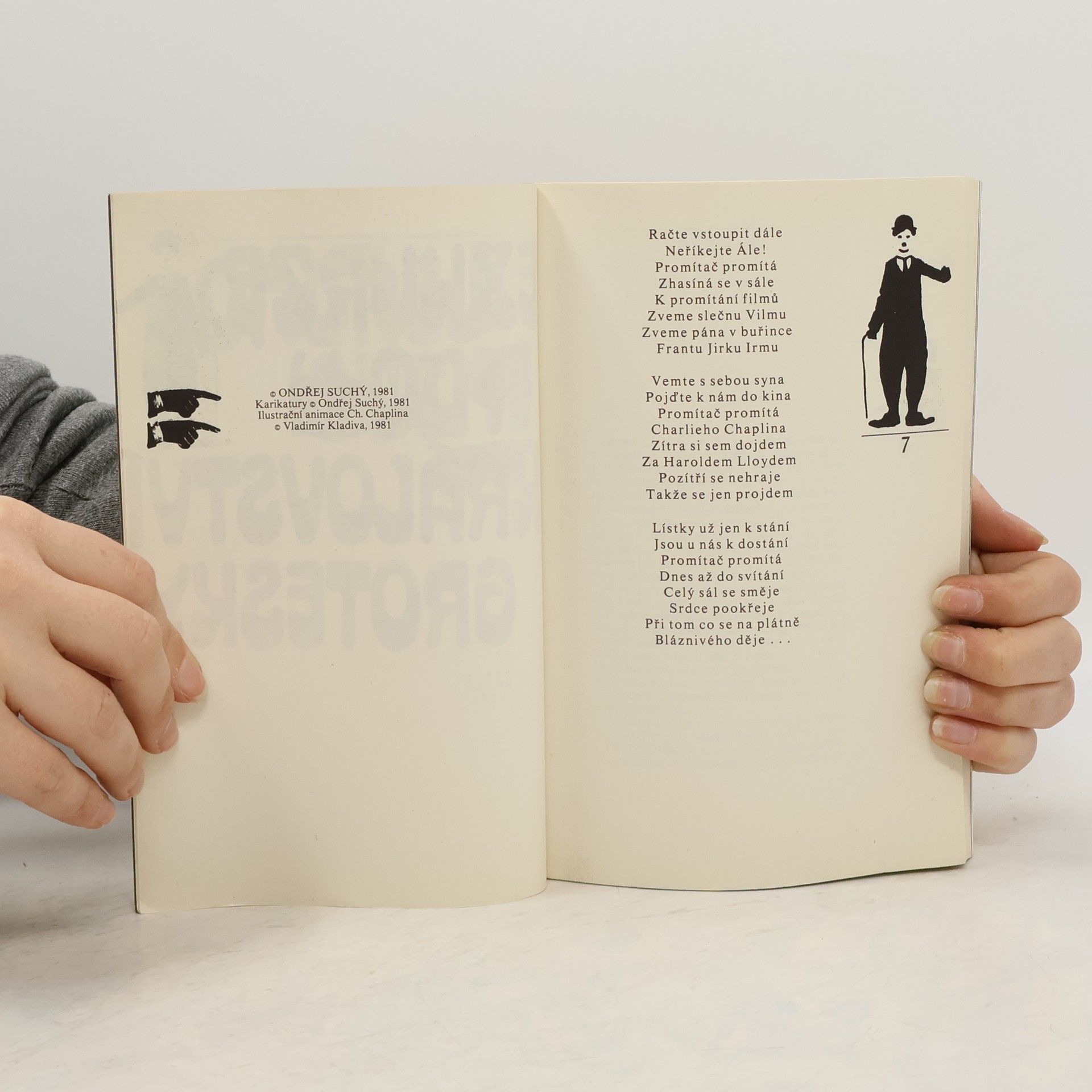 Kniha pokrývá historii němého filmu a grotesky vč. největších herců té doby jako byli Chaplin, Frigo, Laurel a Hardy, Harold Lloyd a další. Součástí knihy je i 32 stránková příloha s fotografiemi herců a slavných scén z grotesek.