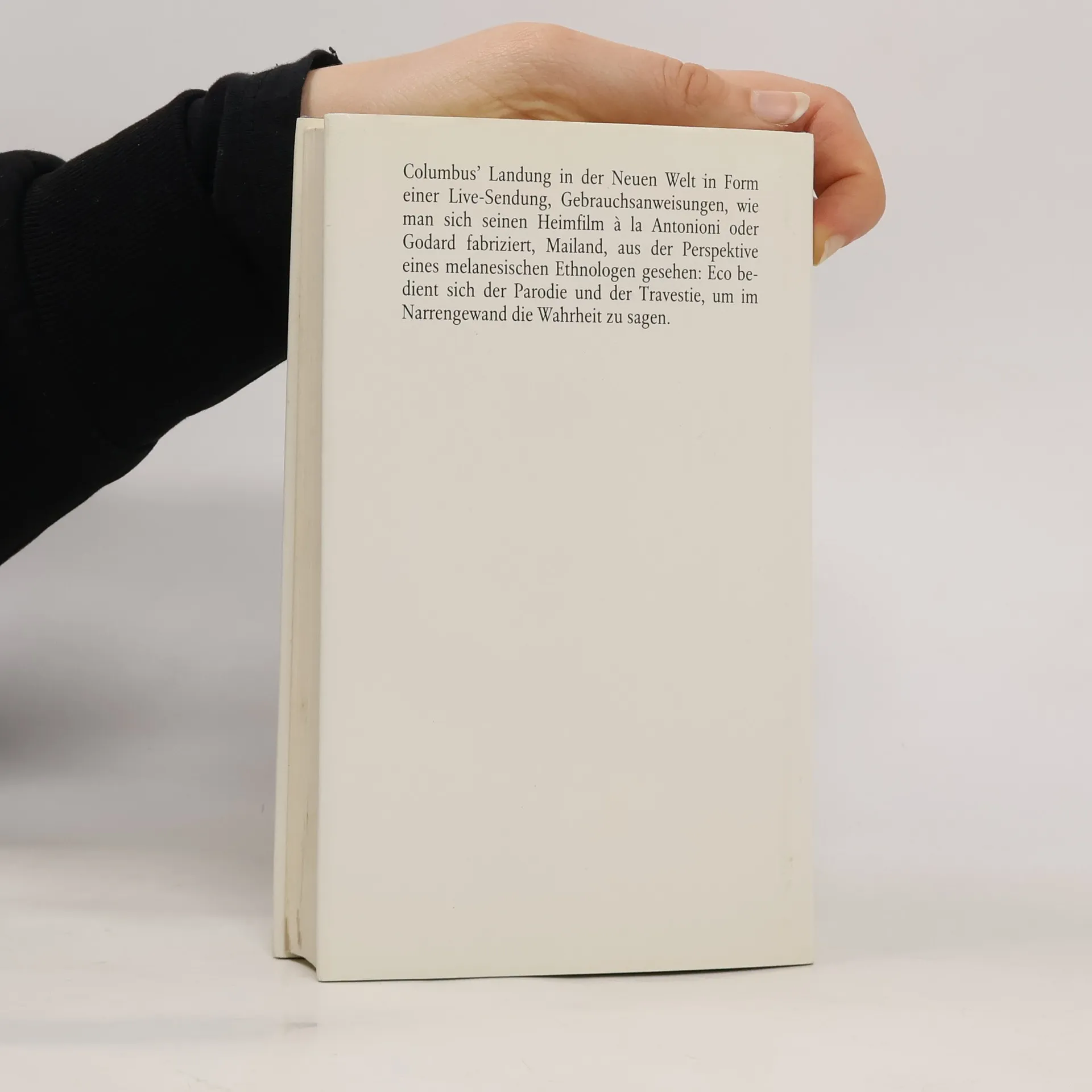In Italien scheinen nicht nur das Leben und die Liebe problemloser zu sein als anderswo, auch mit der Literatur und der Philosophie tun sich die Italiener leichter. Meisterhaftes Beispiel hierfür sind diese Kabinettstückchen: In einer Parodie auf Nabokovs Lolita liebt ein sehr junger Mann eine Greisin. Per Live-Sendung sind wir dabei, als Columbus die Neue Welt betritt - worüber uns das Fernsehen so berichtet wie seinerzeit über die Landung der Amerikaner auf dem Mond -, und wir werden Zeugen bei der Erfindung des Faustkeils, der, eben erst als nützliches Werkzeug erdacht, sogleich zum Töten benutzt wird. Daneben erfahren wir, wie man als Intellektueller auch dann überlebt, wenn die scheinbar real existierende Lebensgrundlage entfällt. Spätestens hier wird deutlich, daß Parodie und Satire für Eco bei aller Lust am Spott immer auch eine Form des ethischen Engagements sind, nur eben: eine unterhaltsame.