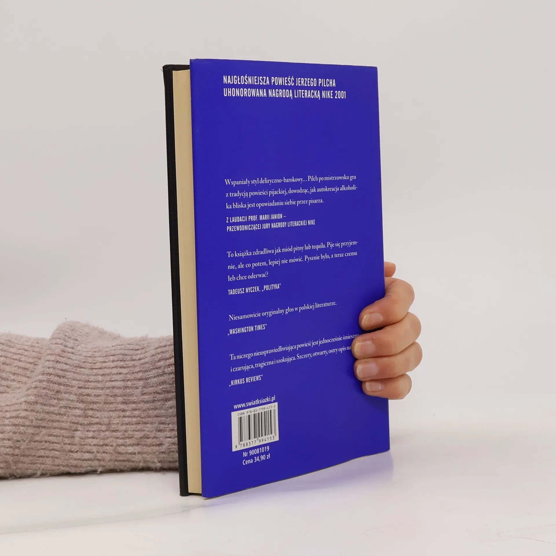 "Najgłośniejsza powieść Jerzego Pilcha, uhonorowana Nagrodą Literacką NIKE'2001. Ta niczego nieusprawiedliwiająca powieść jest jednocześnie śmieszna i czarująca, tragiczna i szokująca. Szczery, otwarty, ostry opis nałogu. Kirkus Review Wspaniały styl deliryczno-barokowy… Pilch po mistrzowsku gra z tradycją powieści pijackiej, dowodząc, jak autokreacja alkoholika bliska jest opowiadaniu siebie przez pisarza. -Z laudacji prof. Marii Janion - przewodniczącej jury Nagrody Literackiej Nike "
