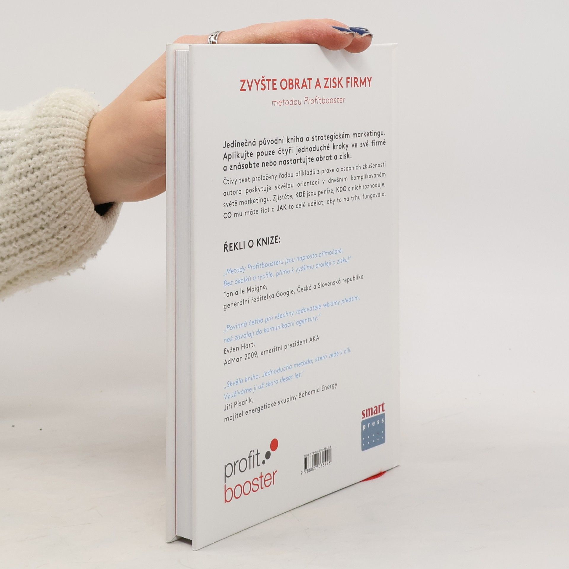 Jedinečná původní kniha o strategickém marketingu. Aplikujte pouze čtyři jednoduché kroky ve své firmě a znásobte nebo nastartujte obrat a zisk. Čtivý text proložený řadou příkladů z praxe a osobních zkušeností autora poskytuje skvělou orientaci v dnešním komplikovaném světě marketingu. Zjistěte, KDE jsou peníze, KDO o nich rozhoduje, CO mu máte říct a JAK to celé udělat, aby to na trhu fungovalo. „Metody Profitboosteru jsou naprosto přímočaré. Bez okolků a rychle, přímo k vyššímu prodeji a zisku! “ Tania le Moigne, generální ředitelka Google, Česká a Slovenská republika