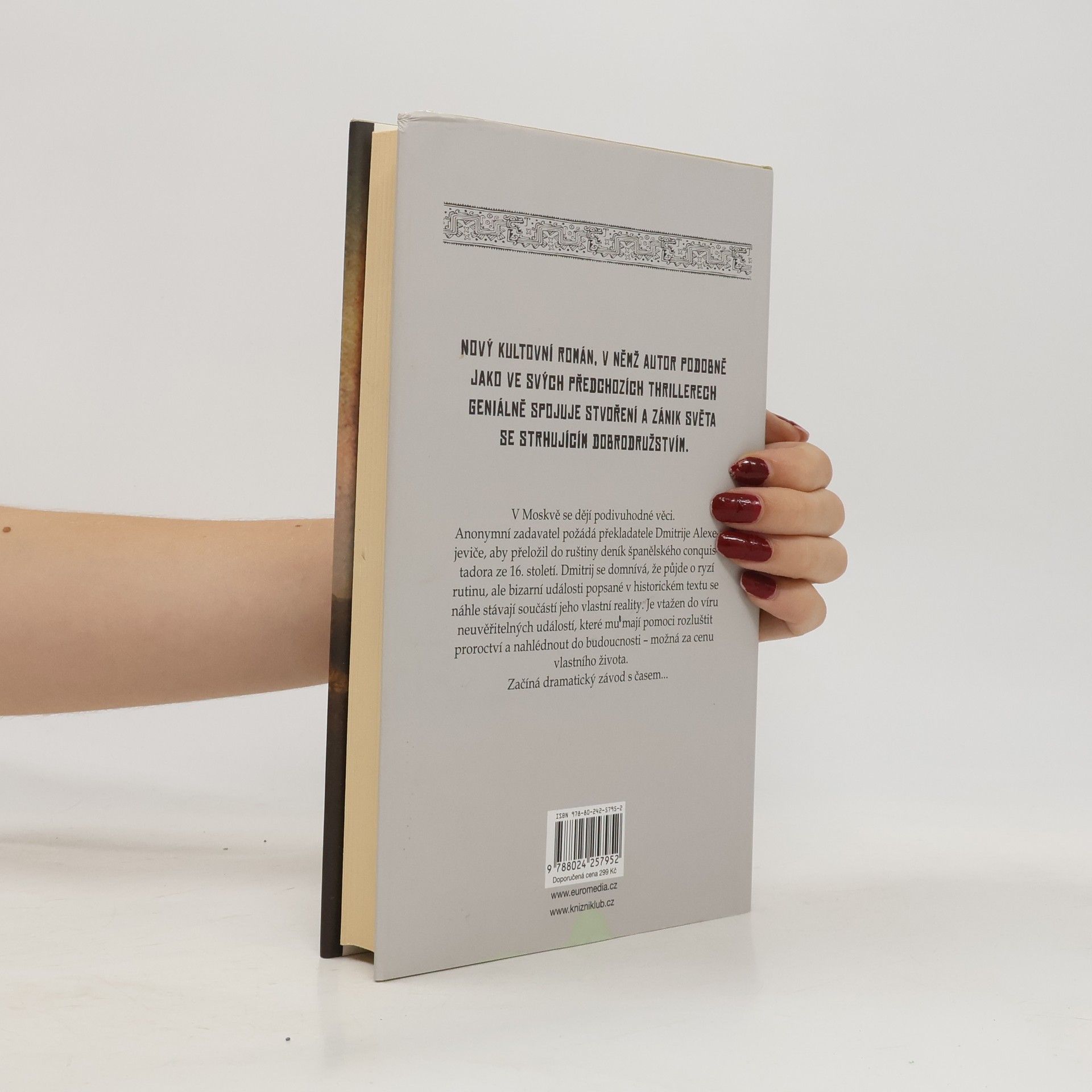 Nový kultovní román, v němž autor podobně jako ve svých předchozích románech geniálně spojuje stvoření a zánik světa se strhujícím dobrodružstvím. V Moskvě se dějí podivuhodné věci. Anonymní zadavatel požádá překladatele Dmitrije Alexejeviče, aby přeložil do ruštiny deník španělského conquistadora ze 16. století. Dmitrij se domnívá, že půjde o ryzí rutinu, ale bizarní události popsané v historickém textu se náhle stávají součástí jeho vlastní reality. Je vtažen do víru neuvěřitelných událostí, které mu mají pomoci rozluštit proroctví a nahlédnout do budoucnosti – možná za cenu vlastního života. Začíná dramatický závod s časem...