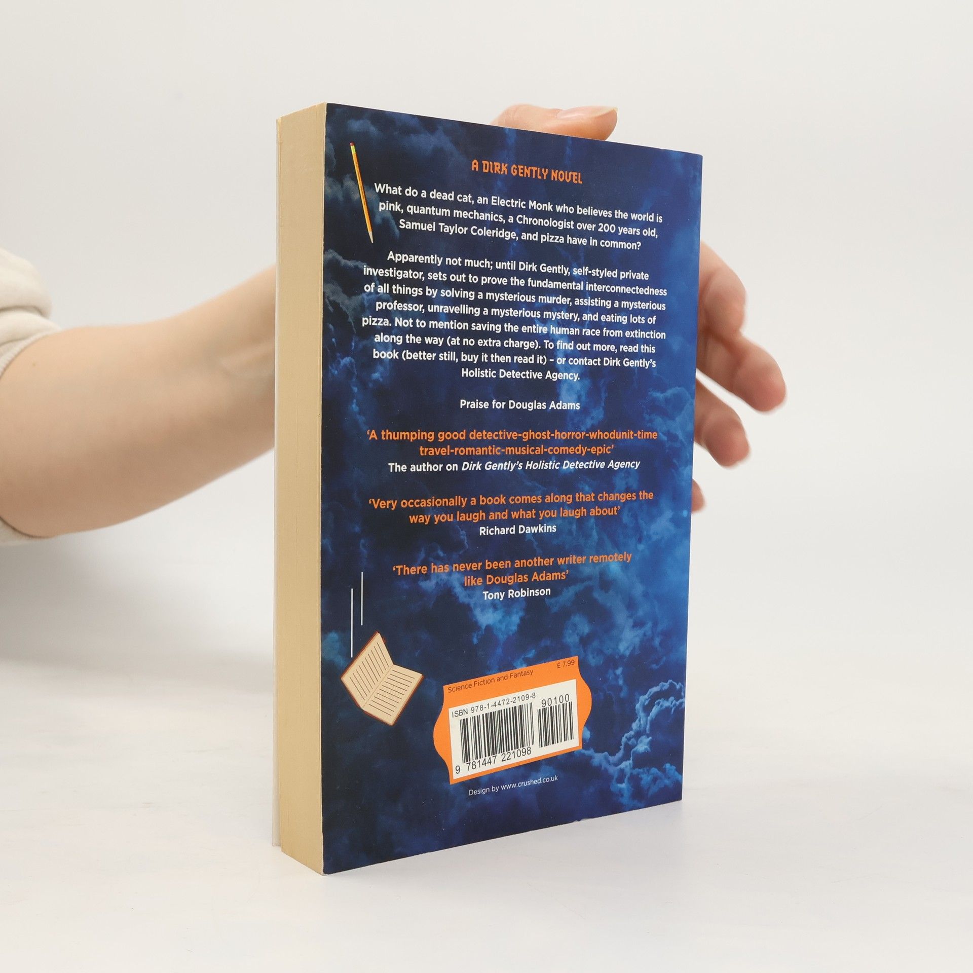 What do a dead cat, a computer whiz-kid, an Electric Monk who believes the world is pink, quantum mechanics, a Chronologist over 200 years old, Samuel Taylor Coleridge (poet), and pizza have in common? Apparently not much; until Dirk Gently, self-styled private investigator, sets out to prove the fundamental interconnectedness of all things by solving a mysterious murder, assisting a mysterious professor, unravelling a mysterious mystery, and eating a lot of pizza – not to mention saving the entire human race from extinction along the way (at no extra charge). To find out more, read this book (better still, buy it then read it) – or contact Dirk Gently's Holistic Detective Agency.