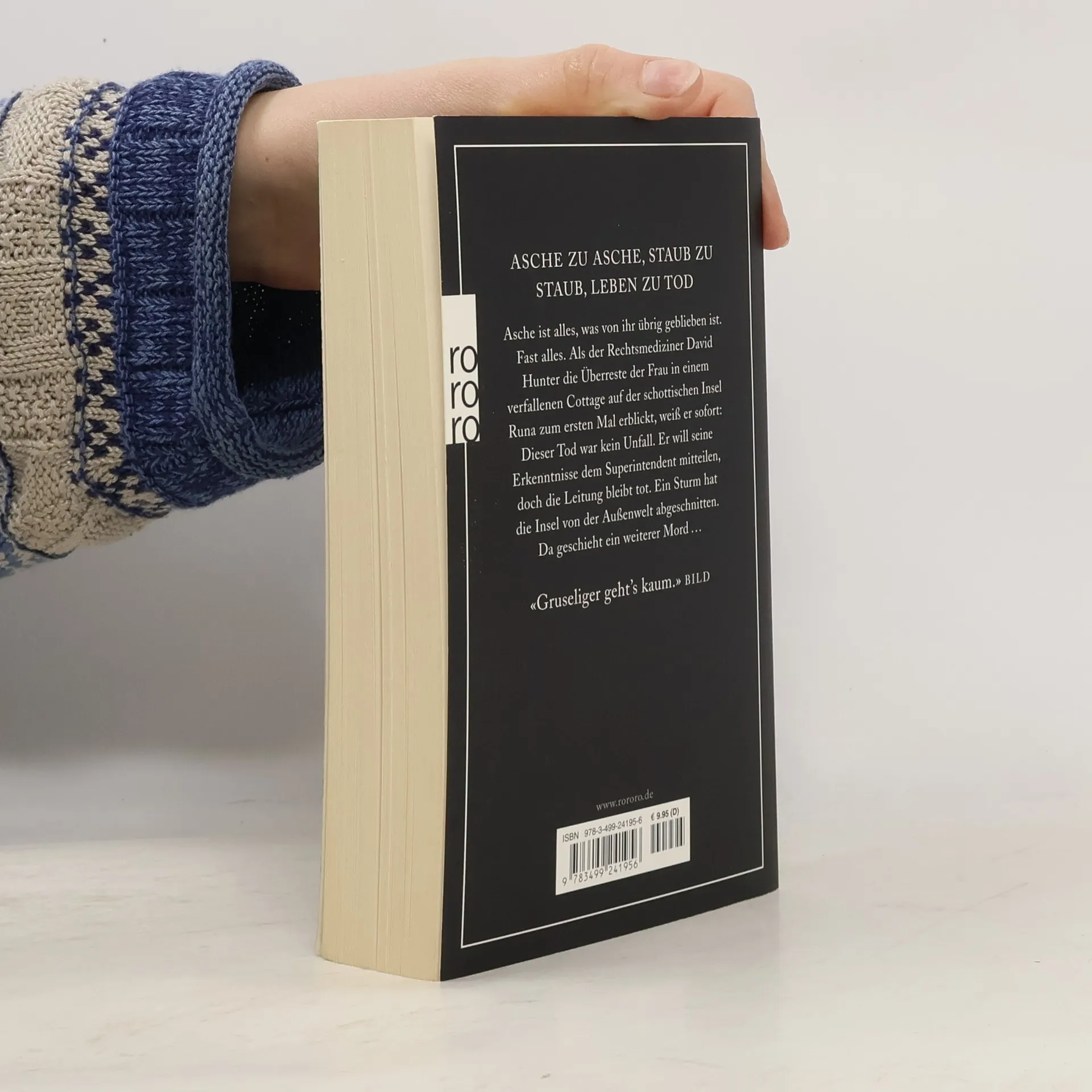 Asche zu Asche, Staub zu Staub, Leben zu Tod. Asche ist alles, was von ihr übrig geblieben ist. Fast alles. Als der Rechtsmediziner David Hunter die Überreste der Frau in einem verfallenen Cottage auf der schottischen Insel Runa zum ersten Mal erblickt, weiß er sofort: Dieser Tod war kein Unfall. Er will seine Erkenntnisse dem Superintendenten mitteilen, doch die Leitung bleibt tot. Ein Sturm hat die Insel von der Außenwelt abgeschnitten. Da geschieht ein weiterer Mord. «Gruseliger geht’s kaum.» (Bild)