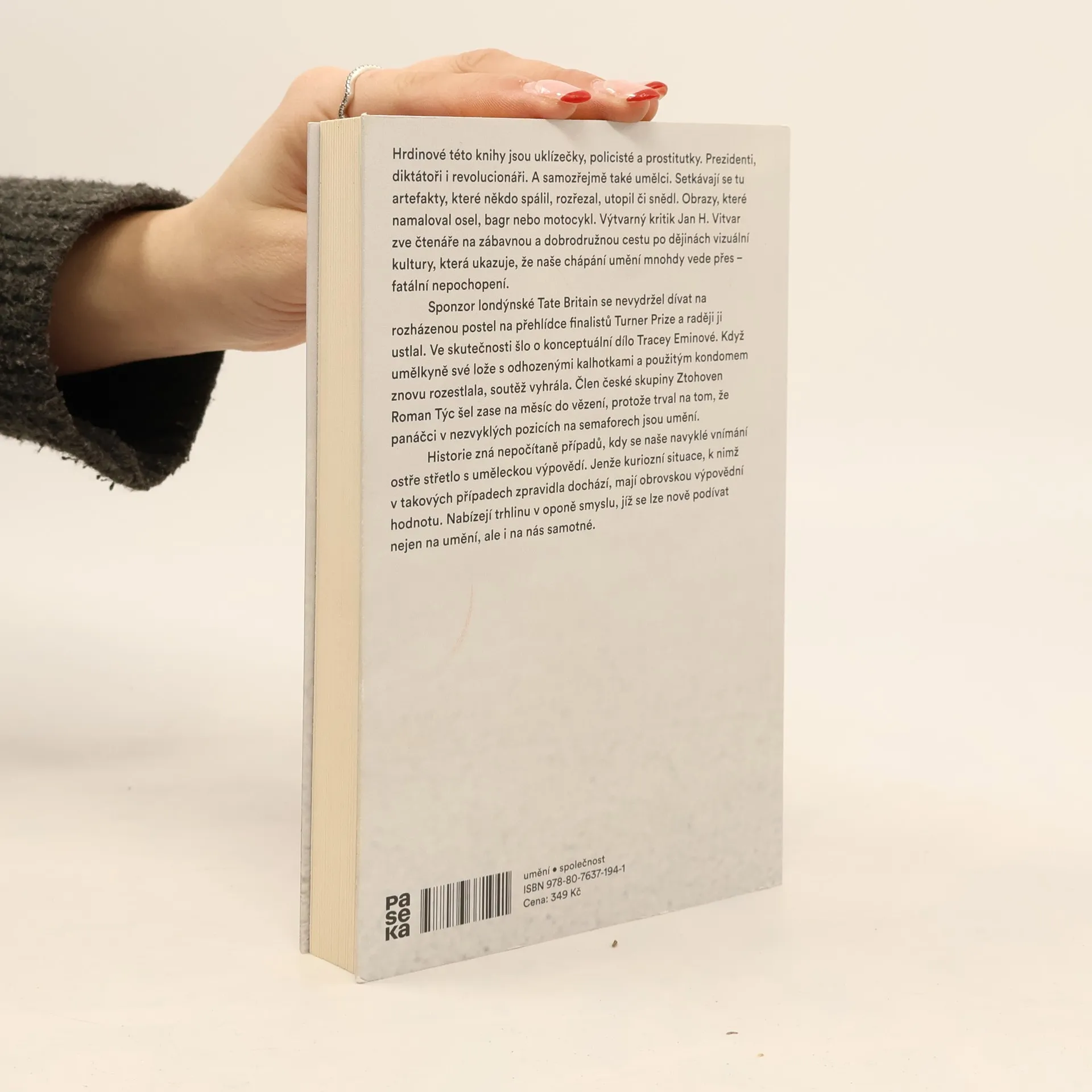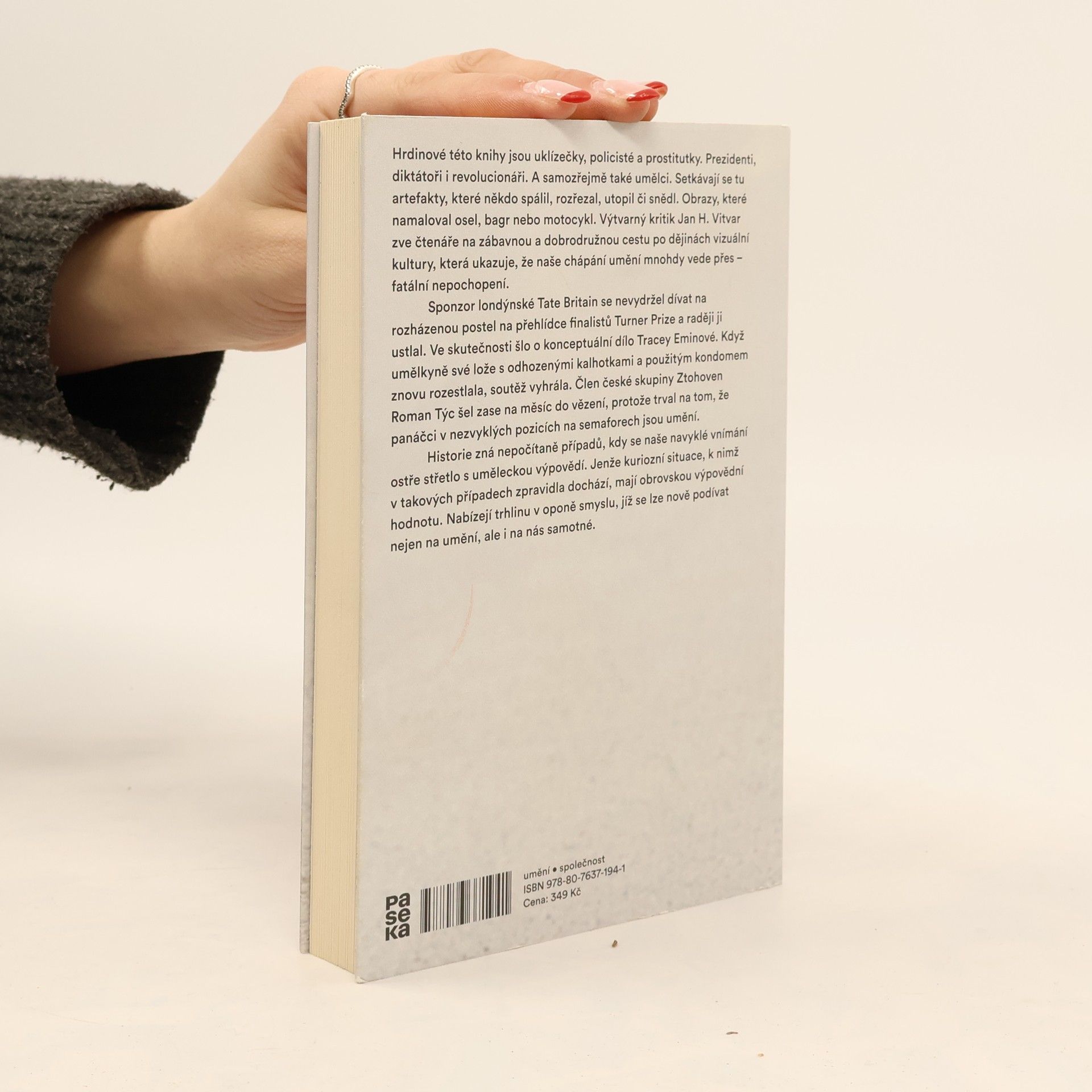 Hrdinové této knihy jsou uklízečky, policisté a prostitutky. Prezidenti, diktátoři i revolucionáři. A samozřejmě také umělci. Setkávají se tu artefakty, které někdo spálil, rozřezal, utopil či snědl. Obrazy, které namaloval osel, bagr nebo motocykl. Výtvarný kritik Jan H. Vitar zve čtenáře na zábavnou a dobrodružnou cestu po dějinách vizuální kultury, která ukazuje, že naše chápání umění mnohdy vede přes fatální nepochopení. Sponzor londýnské Tate Britain se nevydržel dívat na rozházenou postel na přehlídce finalistů Turner Prize a raději ji ustlal. Ve skutečnosti šlo o konceptuální dílo Tracey Eminové. Když umělkyně své lože s odhozenými kalhotkami a použitým kondomem znovu rozestlala, soutěž vyhrála. Člen české skupiny Ztohoven Roman Týc šel zase na měsíc do vězení, protože trval na tom, že panáčci v nezvyklých pozicích na semaforech jsou umění. Historie zná nepočitatelně případů, kdy se naše navyklé vnímání ostře střetlo s uměleckou výpovědí. Jenže kuriózní situace, k nimž v takových případech zpravidla dochází, mají obrovskou výpovědní hodnotu. Nabízejí trhlinu v oponě smyslu, jíž se lze nově podívat nejen na umění, ale i na nás samotné.