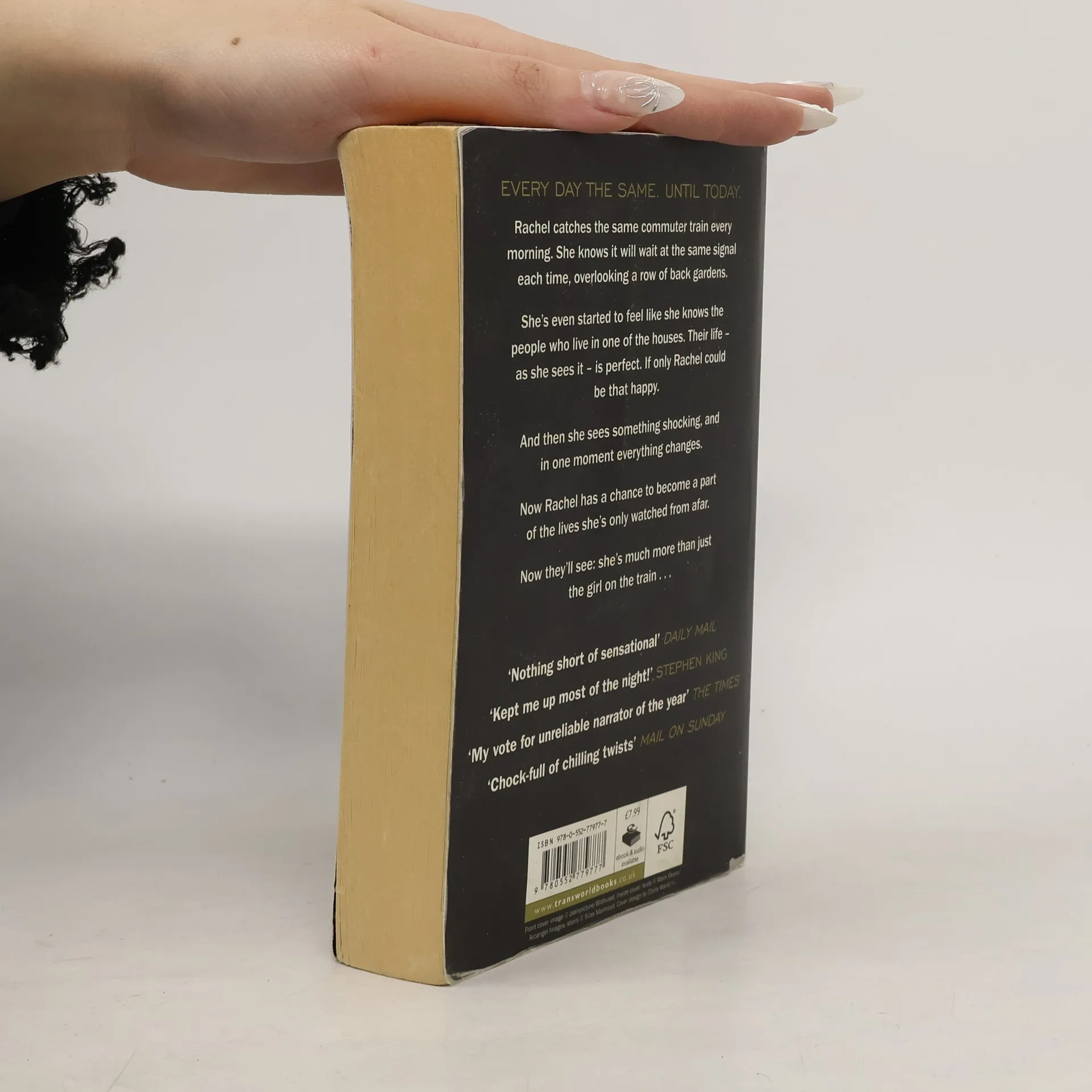THE RUNAWAY SUNDAY TIMES NO.1 BESTSELLER AND THRILLER OF THE YEAR, NOW A MAJOR FILM STARRING EMILY BLUNT 'Really great suspense novel. Kept me up most of the night. The alcoholic narrator is dead perfect' STEPHEN KING Rachel catches the same commuter train every morning. She knows it will wait at the same signal each time, overlooking a row of back gardens. She's even started to feel like she knows the people who live in one of the houses. 'Jess and Jason', she calls them. Their life - as she sees it - is perfect. If only Rachel could be that happy. And then she sees something shocking. It's only a minute until the train moves on, but it's enough. Now everything's changed. Now Rachel has a chance to become a part of the lives she's only watched from afar. Now they'll see; she's much more than just the girl on the train...