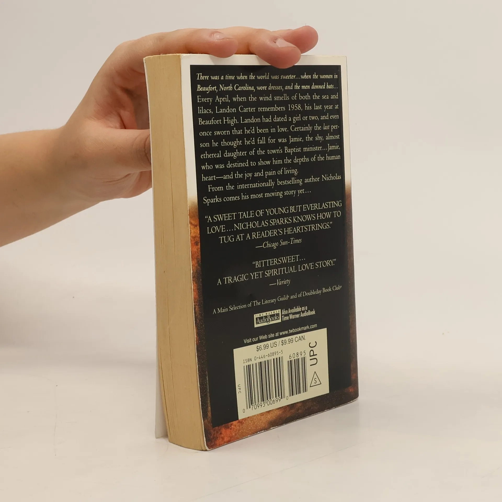 A high school rebel and a minister's daughter find strength in each other in this star-crossed tale of "young but everlasting love" (Chicago Sun-Times). There was a time when the world was sweeter....when the women in Beaufort, North Carolina, wore dresses, and the men donned hats.... Every April, when the wind smells of both the sea and lilacs, Landon Carter remembers 1958, his last year at Beaufort High. Landon had dated a girl or two, and even once sworn that he'd been in love. Certainly the last person he thought he'd fall for was Jamie, the shy, almost ethereal daughter of the town's Baptist minister....Jamie, who was destined to show him the depths of the human heart-and the joy and pain of living. The inspiration for this novel came from Nicholas Sparks's sister: her life and her courage. From the internationally bestselling author Nicholas Sparks, comes his most moving story yet....