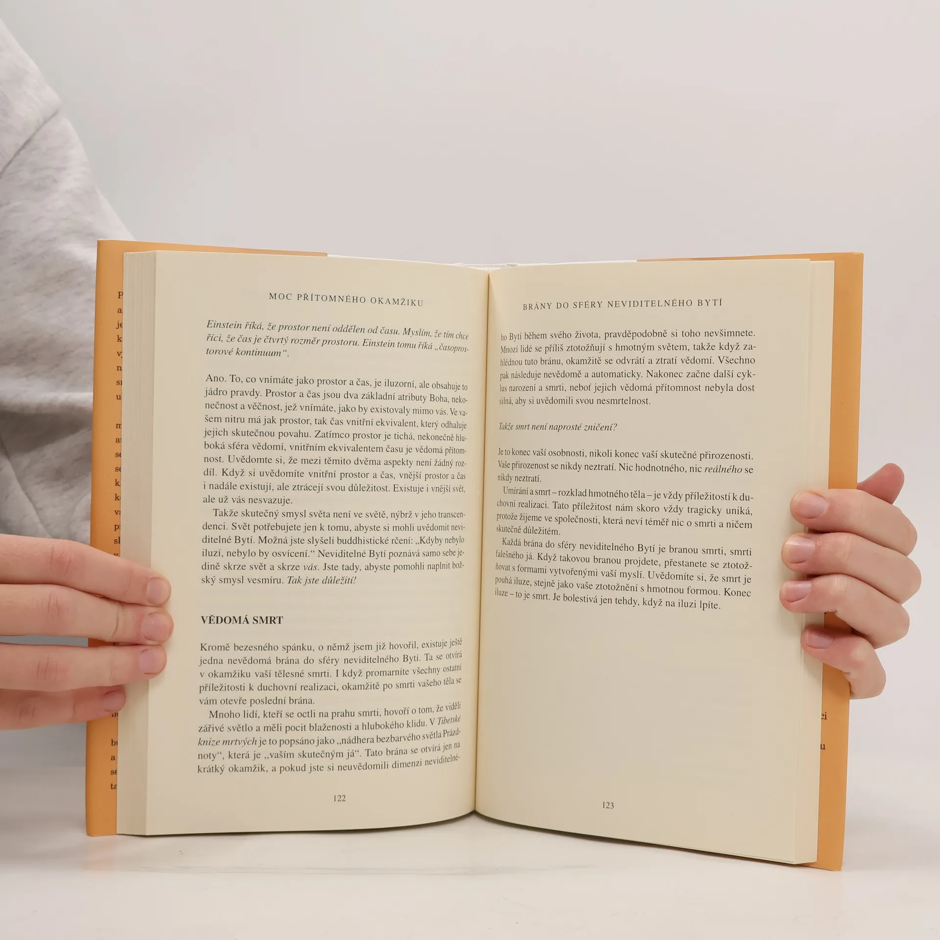 Při čtení této knihy mnoho z nás učiní nové objevy: nejsme svou myslí; můžeme se zbavit duševní bolesti; najdeme, jakmile se vzdáme přítomnému okamžiku. Dovíme se také, že jedním z klíčů k dosažení vnitřního klidu je naše tělo, stejně jako ticho a prostor kolem nás. To jsou brány, jimiž můžeme vstoupit do přítomnosti, kde neexistují žádné problémy. V přítomném okamžiku najdeme své skutečné já a hlubokou vnitřní radost. Pouze v přítomném okamžiku si uvědomíme, že už jsme úplní a dokonalí. Mnoho z nás zjistí, že naší největší překážkou na cestě k tomuto poznání jsou naše partnerské vztahy. Vstupujeme do ,,nového teritoria" a nic není takové, jak se nám to dosud jevilo. Pochopíme, že naše partnerské vztahy mohou být další branou k duchovnímu osvícení, pokud jich budeme užívat moudře, to jest k tomu, abychom se stali víc milujícími. Výsledek? Skutečné spojení mezi naším já a druhými lidmi. Naučíme-li se žít v přítomném okamžiku, budeme-li vnímat realitu ,,neviditelného Bytí" a svého ,,vnitřního těla", otevřeme se transformujícímu poznání, jež nám poskytuje tato kniha.