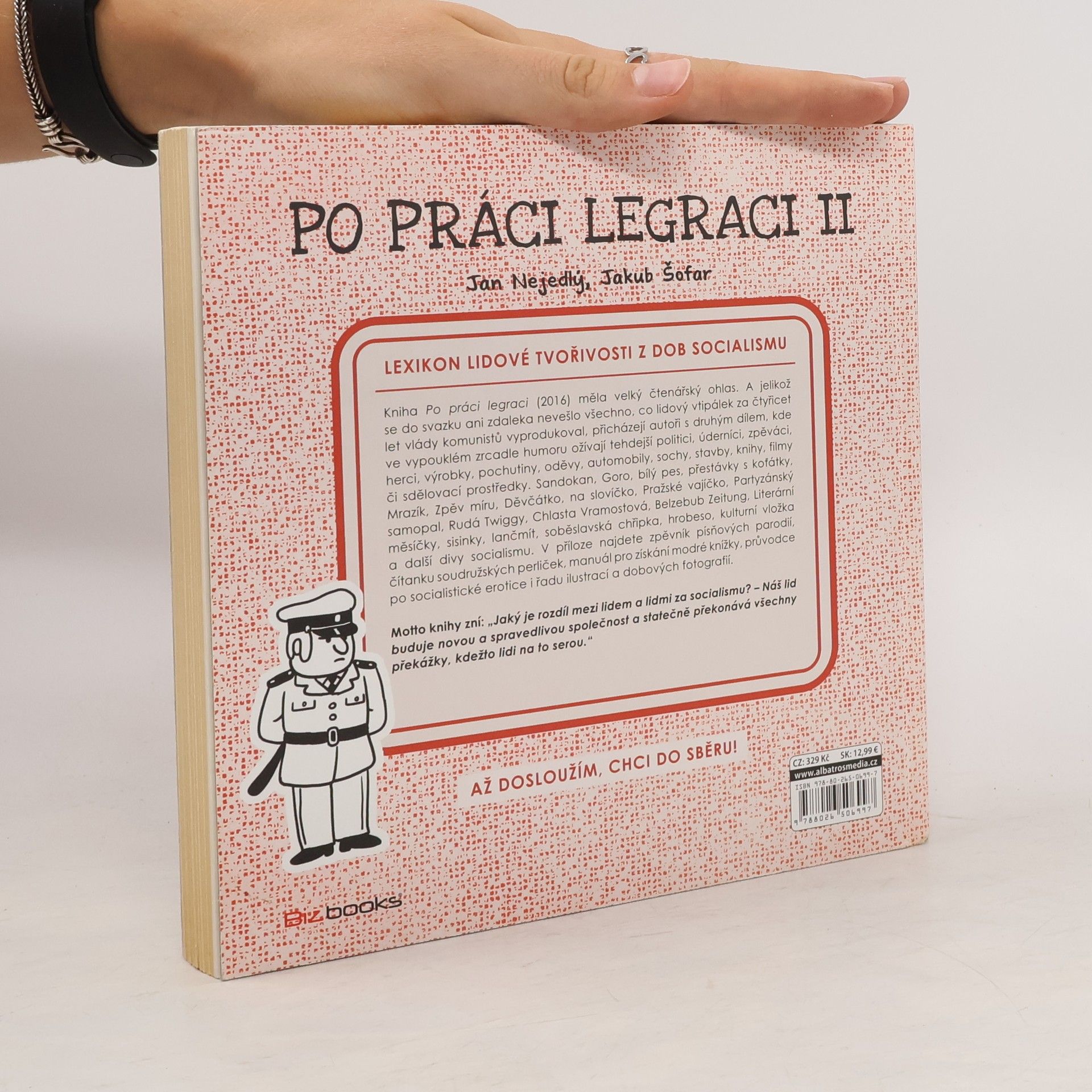 Kniha Po práci legraci (2016) měla velký čtenářský ohlas. Připomenout si dobu socialismu na tehdejších anekdotách, hádankách, parodiích a posměšcích, jež byly pro mladší ročníky opatřeny vysvětlujícím komentářem, se ukázalo jako šťastný nápad. A jelikož se do knihy ani zdaleka nevešlo všechno, co lidový vtipálek za čtyřicet let vlády komunistů vyprodukoval, přicházejí autoři s druhým dílem, kde ve vypouklém zrcadle humoru ožívají tehdejší politici, úderníci, zpěváci, herci, výrobky, pochutiny, oděvy, automobily, sochy, stavby, knihy, filmy či sdělovací prostředky. Sandokan, Goro, bílý pes, přestávky s koťátky, Mrazík, Zpěv míru, Děvčátko, na slovíčko, Pražské vajíčko, Partyzánský samopal, Rudá Twiggy, Chlasta Vramostová, Belzebub Zeitung, Literární měsíčky, sisinky, lančmít, soběslavská chřipka, hrobeso, kulturní vložka a další divy socialismu. V příloze najdete zpěvník písňových parodií, slovníček lidových průpovídek, čítanku soudružských perliček, rukověť mladého rockera a nevojáka i řadu ilustrací a dobových fotografií. Motto knihy zní: „Jaký je rozdíl mezi lidem a lidmi za socialismu? – Náš lid buduje novou a spravedlivou společnost a statečně překonává všechny překážky, kdežto lidi na to serou.“