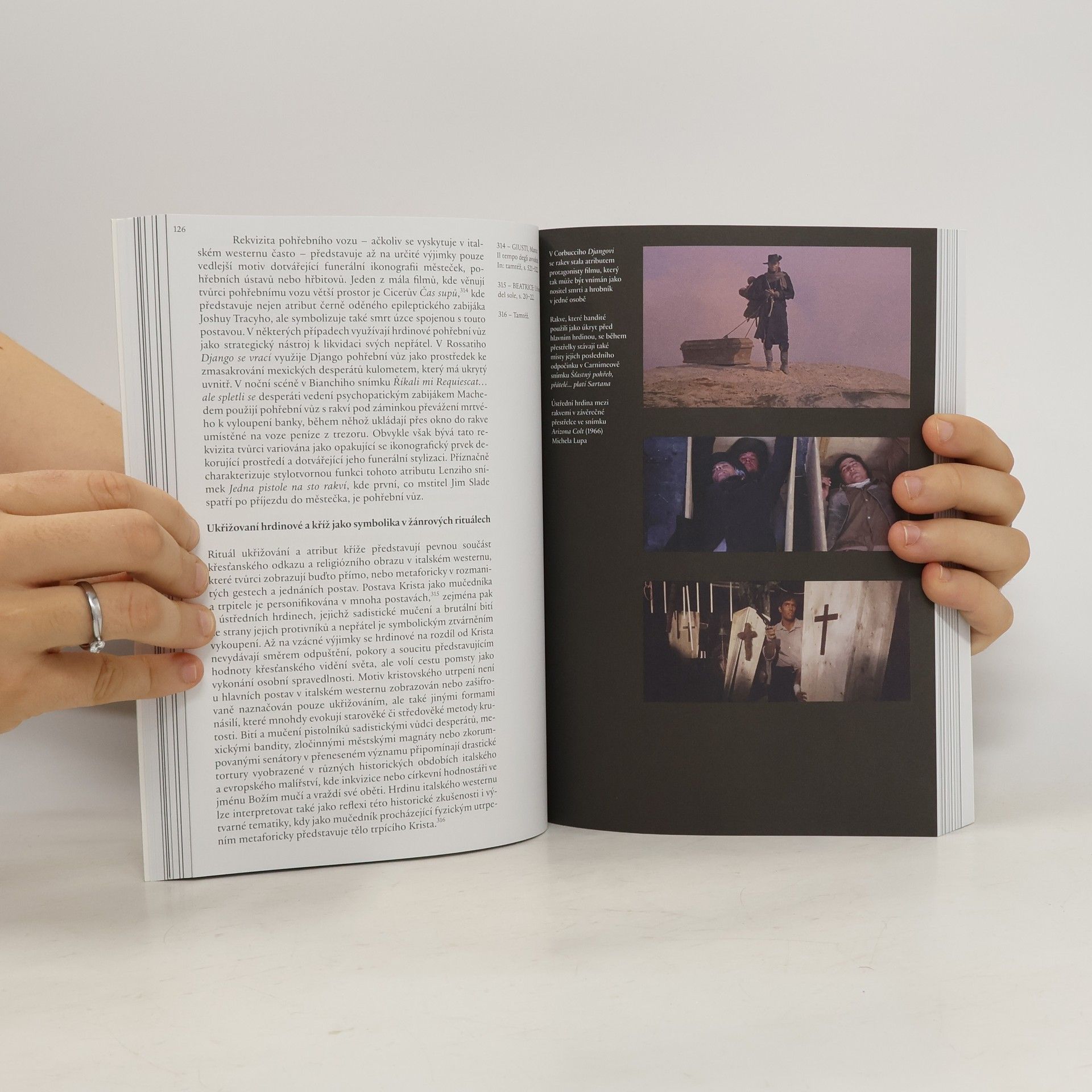 Italský western, jemuž je věnována tato kniha, představuje nejen jeden z nejpopulárnějších žánrů italské kinematografie, ale i komplexní sociokulturní fenomén, který rezonuje v širokém mezinárodním kontextu. Autor se ho snaží představit z jiného pohledu, odlišného od výkladů, které se stále opakují v publikacích věnovaných tomuto žánru. Pro svou analýzu si zvolil několik okruhů, specifických témat. V úvodní historické části se zaměřil na revizi dlouhodobě a mylně zavedeného obrazu historie italského westernu spojeného zejména s tvorbou Sergia Leoneho. V následujících, interpretačních kapitolách rozebírá příznačné rozpoznávací atributy tohoto žánru, úzce spojené s náboženskou symbolikou, kulturní intertextualitou, anachronickými prvky, žánrovými konstrukcemi a filmovou hudbou. Autorův text uvozují osobní historická svědectví o vlastních tvůrčích zkušenostech z pera scenáristy Ernesta Gastaldiho, který pro knihu napsal předmluvu, a režiséra Giancarla Santiho, s nímž autor vedl rozhovor.