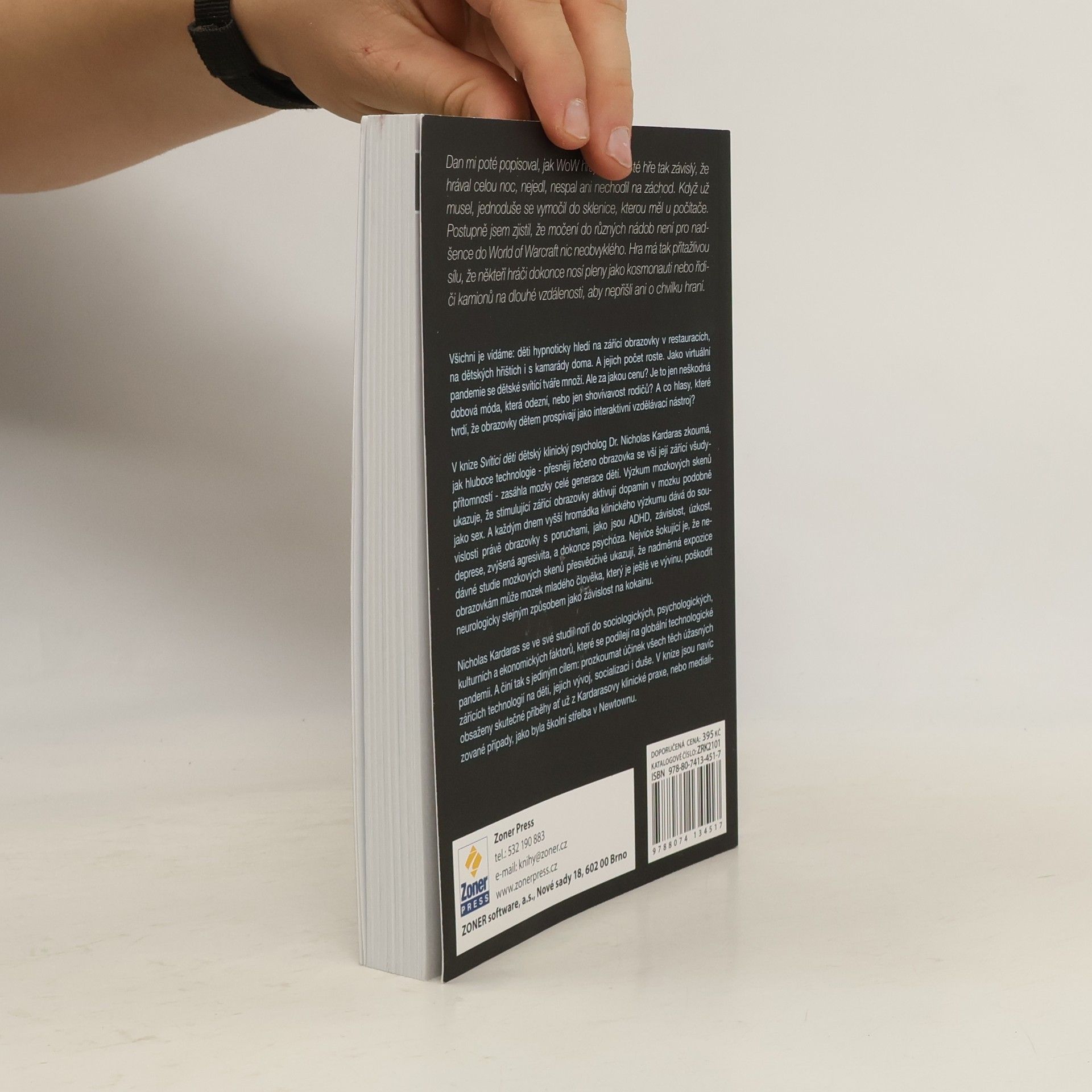 Děti hypnoticky hledí na zářící obrazovky v restauracích, na hřištích i doma, a jejich počet roste jako virtuální pandemie. Jaké jsou však důsledky? Je to neškodná móda, nebo projev schovívavosti rodičů? Někteří tvrdí, že obrazovky mohou být pro děti přínosné jako interaktivní vzdělávací nástroje. Dětský klinický psycholog Dr. Nicholas Kardaras zkoumá, jak technologie, zejména zářící obrazovky, ovlivnily mozky celé generace dětí. Výzkum ukazuje, že stimulující obrazovky aktivují dopamin v mozku podobně jako sex. Růst klinického výzkumu spojuje obrazovky s poruchami jako ADHD, závislost, úzkost, deprese, agresivita a dokonce psychóza. Nejvíce znepokojivé jsou studie, které naznačují, že nadměrná expozice obrazovkám může poškodit mozek vyvíjejícího se dítěte obdobně jako závislost na kokainu. Kardaras se zabývá sociologickými, psychologickými, kulturními a ekonomickými faktory, které přispívají k této technologické pandemii, s cílem prozkoumat účinky moderních technologií na děti, jejich vývoj, socializaci a duševní zdraví. Kniha obsahuje také skutečné příběhy z Kardarasovy praxe a medializované případy, jako byla školní střelba v Newtownu.