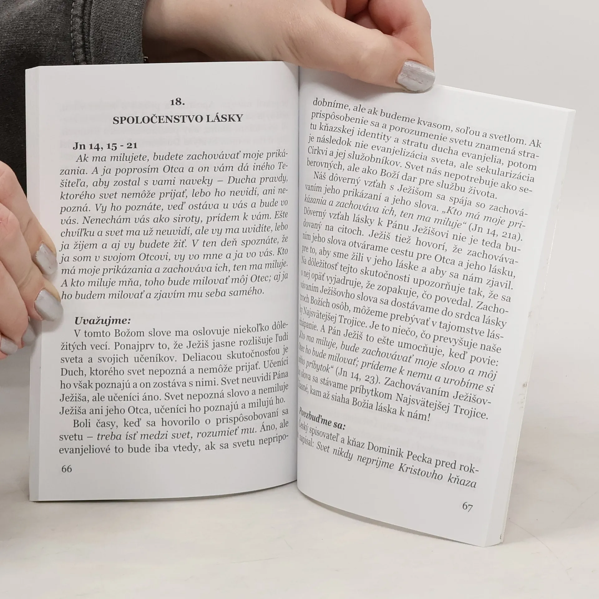 Pápež František hovorí: Prvá úloha kresťana je počúvať Božie slovo, počúvať Ježiša, pretože on k nám hovorí, zachraňuje nás svojím slovom; posilňuje našu vieru prostredníctvom tohto slova. Načúvaním Ježišovi živíme svoju vieru. Položím vám otázku: Vyhradíme si každý deň tro- chu času, aby sme počúvali Ježiša, aby sme načúvali Božiemu slovu? Navrhujem vám nosiť v taške či vo vrecku maličké evanjelium, a keď máme trochu času, zoberme si evanjelium a prečítajme si zopár slov. Evanjelium je vždy s nami.