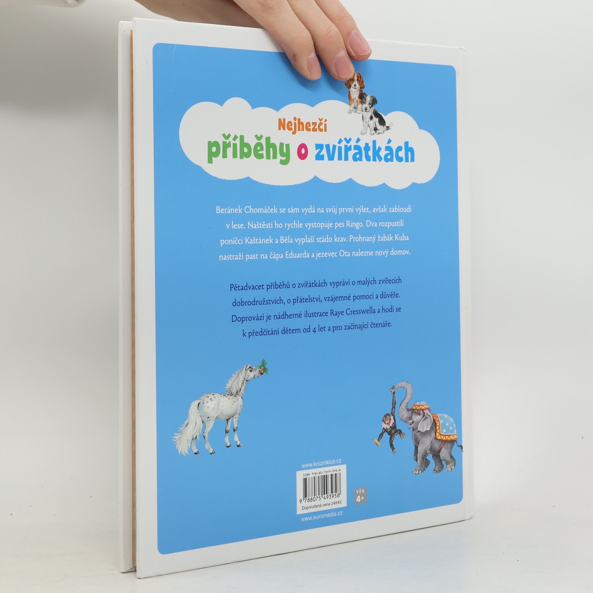 Beránek Chomáček se sám vydá na svůj první výlet, avšak zabloudí v lese. Naštěstí ho rychle vystopuje pes Ringo. Dva rozpustilí poníčci Kaštánek a Běla vyplaší stádo krav. Prohnaný žabák Kuba nastraží past na čápa Eduarda a jezevec Ota nalezne nový domov. Pětadvacet příběhů o zvířátkách vypráví o malých zvířecích dobrodružstvích, o přátelství, vzájemné pomoci a důvěře. Příběhy doprovází nádherné ilustrace Raye Cresswella. Knížka je určená k předčítání pro děti od 4 let.
