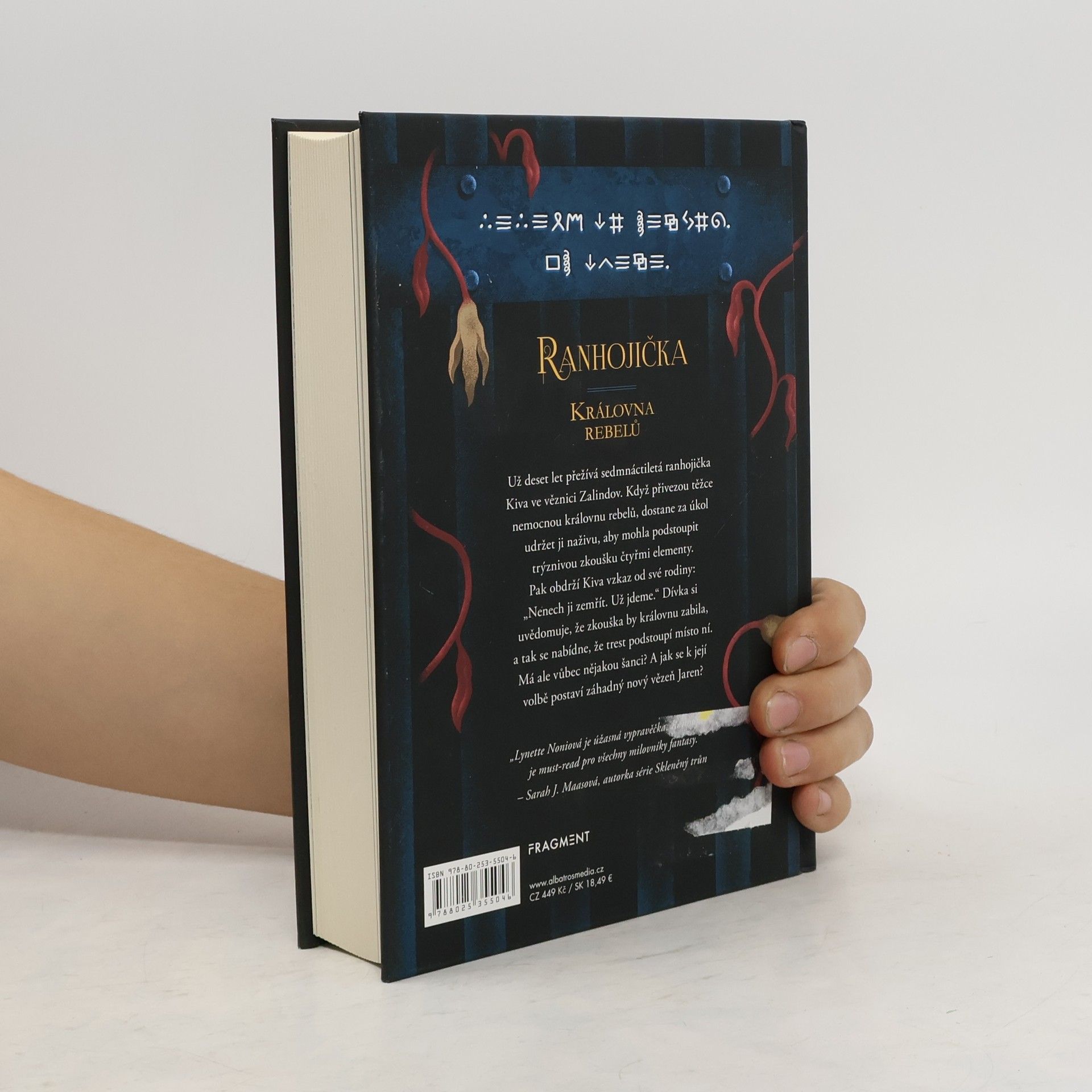 Mnohým zachránila život, teď bude bojovat o ten svůj. První díl napínavé fantasy série. Už deset let přežívá sedmnáctiletá ranhojička Kiva v nechvalně proslulé věznici Zalindov. Když přivezou těžce nemocnou královnu rebelů, dostane nelehký úkol – udržet ji na živu, aby mohla podstoupit zkoušky utrpením, určené těm nejnebezpečnějším zločincům. Musí přežít mučení vzduchem, ohněm, vodou a zemí, což se zatím nikomu nepodařilo. Ve stejné době dostane Kiva šifrovaný vzkaz od své rodiny: „Nenech ji zemřít. Už jdeme.“ Dívka si uvědomuje, že zkoušky by nemocnou královnu zabily, a tak se nabídne, že je podstoupí místo ní. Pokud uspěje, budou obě svobodné. Kiva má strach z nejisté budoucnosti. Spánek jí ruší i epidemie, která se šíří věznicí, a také Jaren - nový vězeň, jehož přítomnost je pro ni důležitější, než si dokáže přiznat…Pak obdrží Kiva vzkaz od své rodiny: „Nenech ji zemřít. Už jdeme.“ Dívka si uvědomuje, že zkouška by královnu zabila, a tak se nabídne, že trest podstoupí místo ní. Má ale vůbec nějakou šanci? A jak se k její volbě postaví záhadný nový vězeň Jaren?