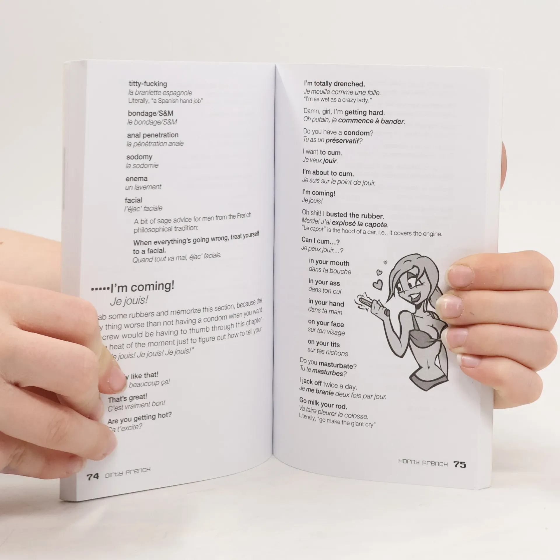 GET D!RTYNext time you’re traveling or just chattin’ in French with your friends, drop the textbook formality and bust out with expressions they never teach you in school, •Cool slang•Funny insults•Explicit sex terms•Raw swear wordsDirty French teaches the casual expressions heard every day on the streets of •What's up?Ça va?•He's totally hot.Il est un gravure de mode.•That brie smells funky.Ce brie sent putain de drôle.•I'm gonna get ripped!Je vais me fracasser!•I gotta piss.Je dois pisser.•The ref is fucking asshole.L'arbitre est un gros enaelé!•Wanna try doggy-style?Veux-tu faire l'amour en levrette?