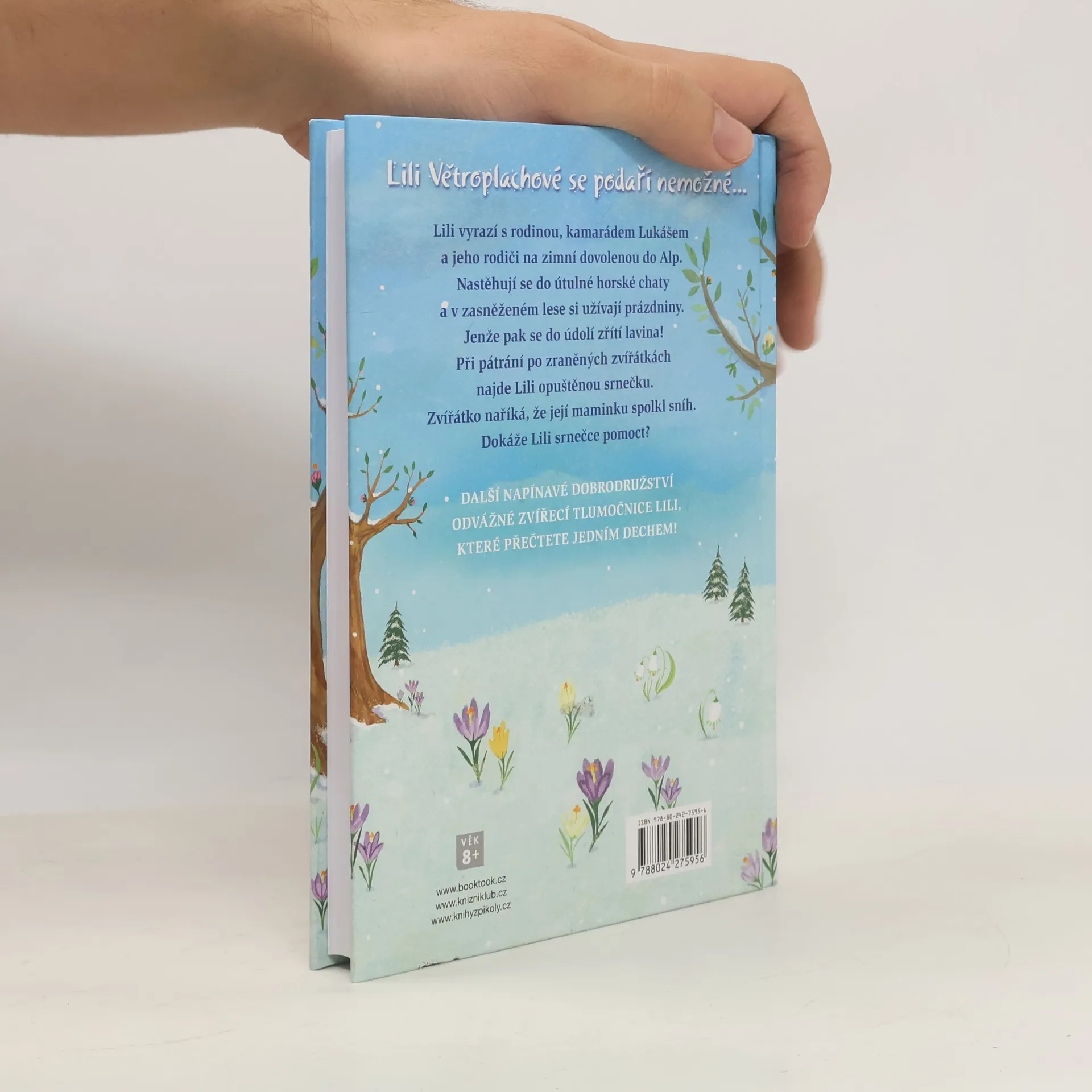 Zvířecí tlumočnice Lili vyrazí s rodinou, kamarádem Lukášem a jeho rodiči na zimní dovolenou do Alp. Nastěhují se do útulné horské chaty a v zasněženém lese si užívají prázdniny. Jenže pak se do údolí zřítí lavina! Při pátrání po zraněných zvířátkách najde Lili opuštěnou srnečku. Zvířátko naříká, že její maminku spolkl sníh. Dokáže Lili srnečce pomoct? Kniha je určena dětem od 8 let.