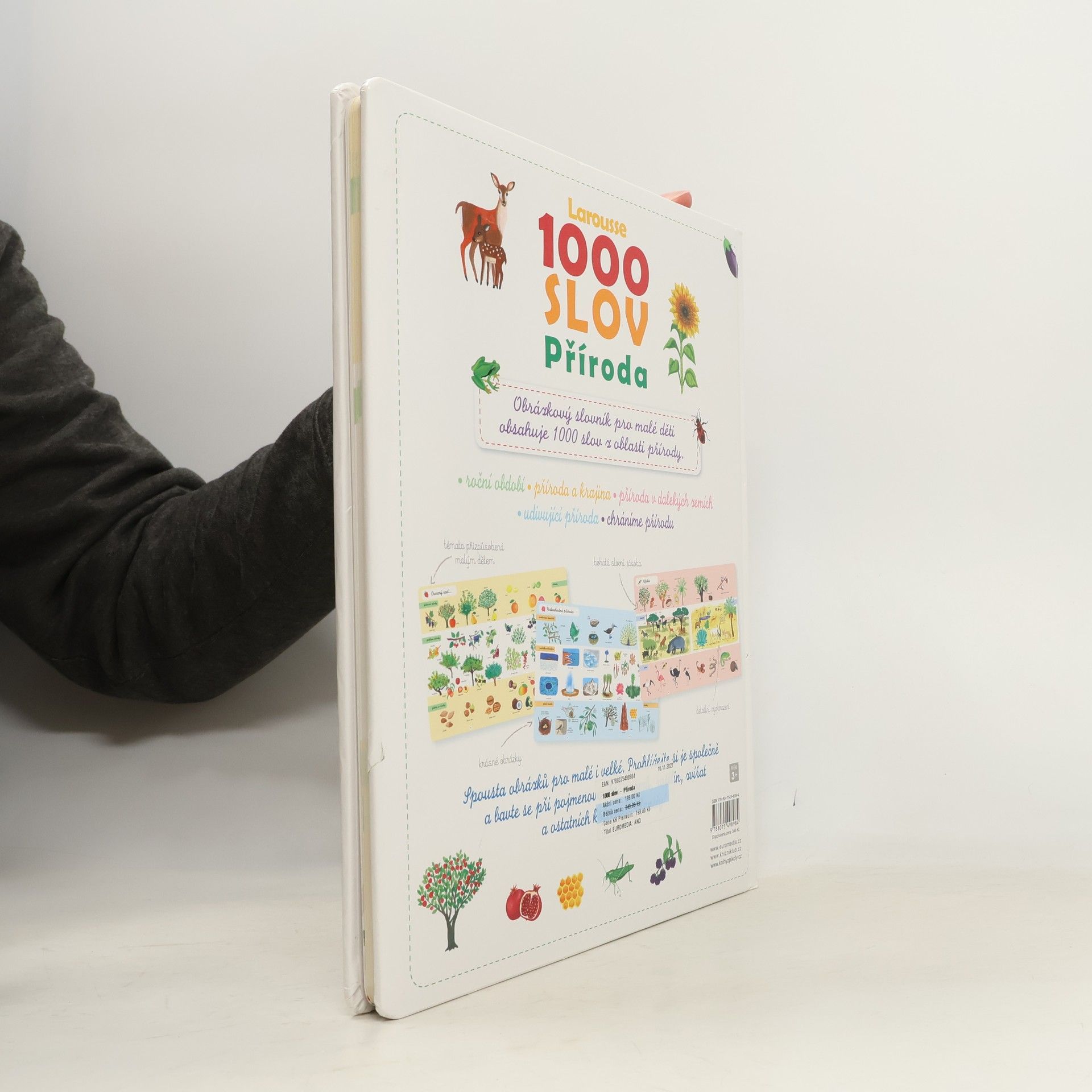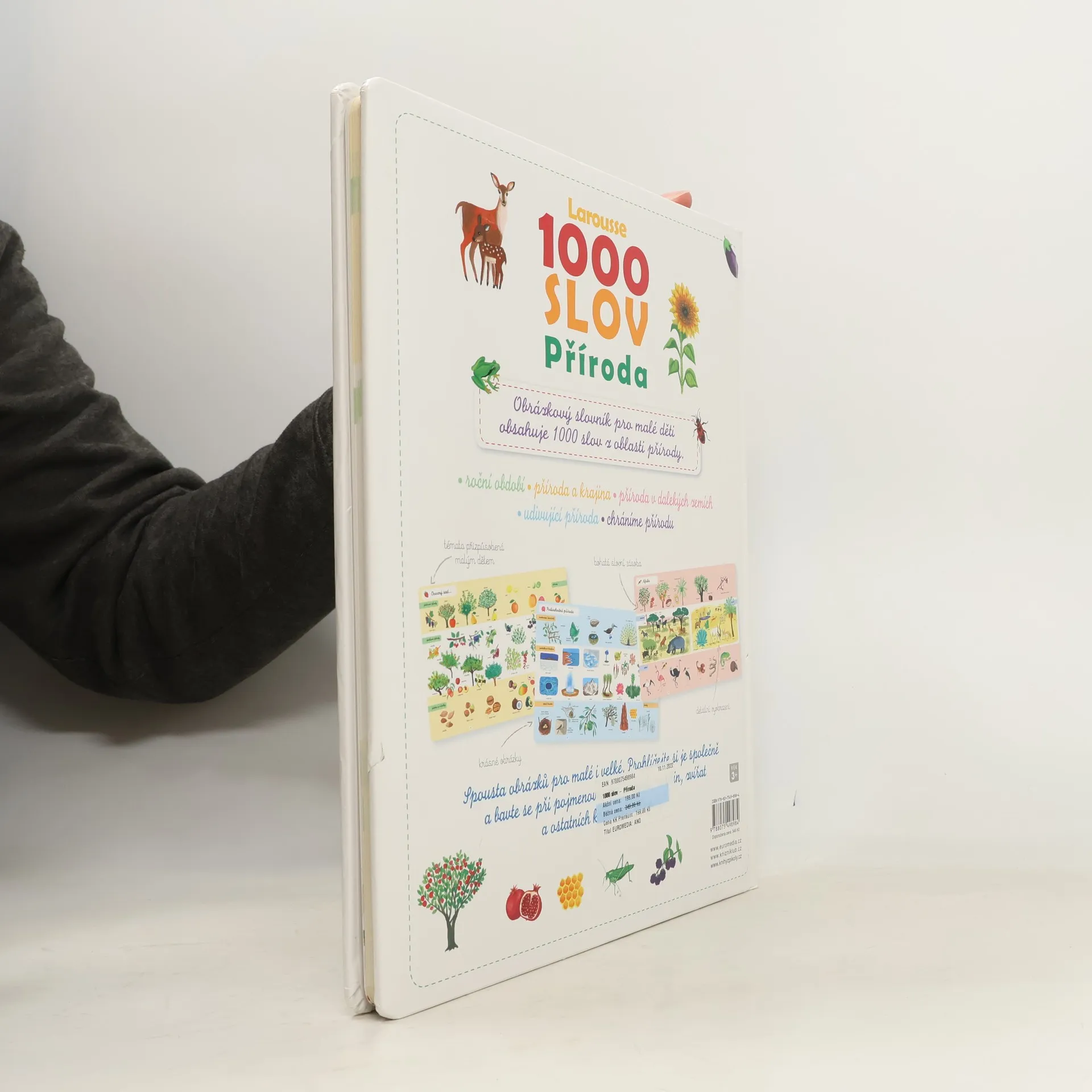 Velkoformátový obrázkový slovník obsahuje všechno, co se malé děti mohou dozvědět o přírodě! Pomáhá jim rozšiřovat slovní zásobu (na každé dvoustraně je více než 20 slovíček) a díky krásným barevným ilustracím i poznávat zvířata a rostliny z nejrůznějších prostředí – těch blízkých (zahrada, farma, louka, les) i těch vzdálených (moře, velehory, exotické krajiny). Odhaluje také spoustu zajímavostí ze života naší planety a učí děti, že je potřeba přírodu chránit a chovat se k ní šetrně.