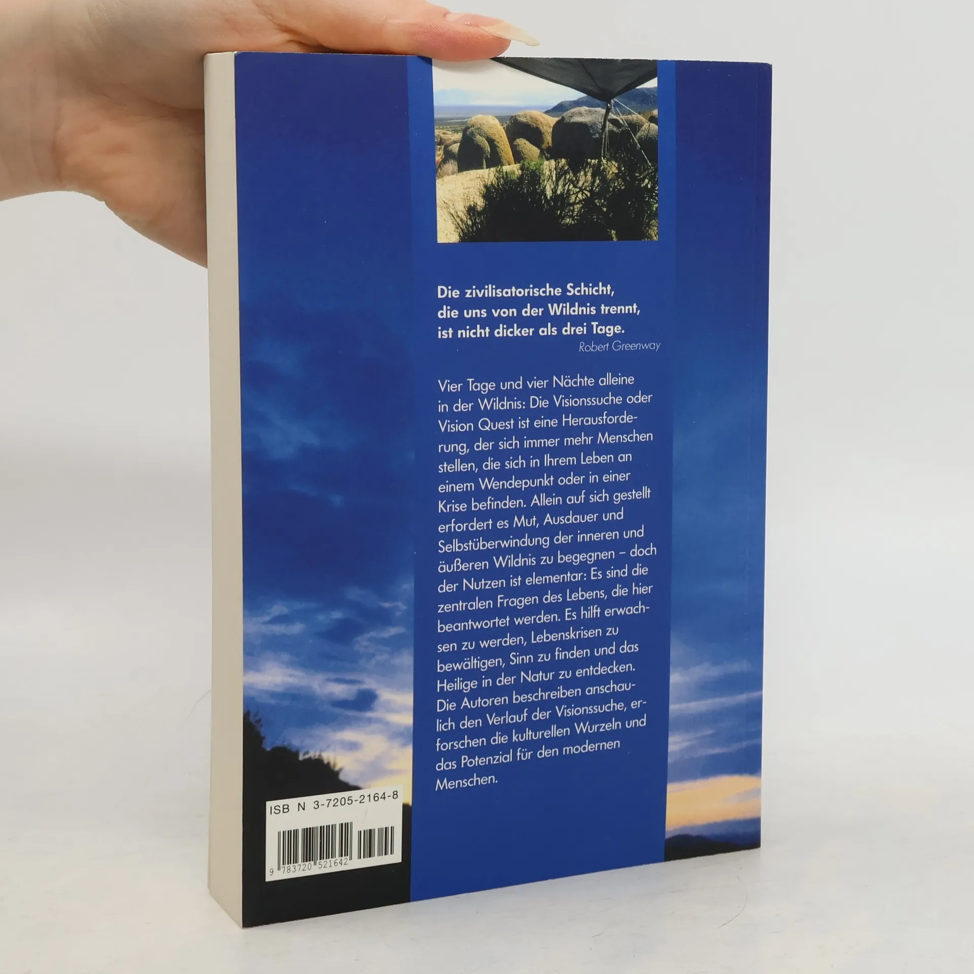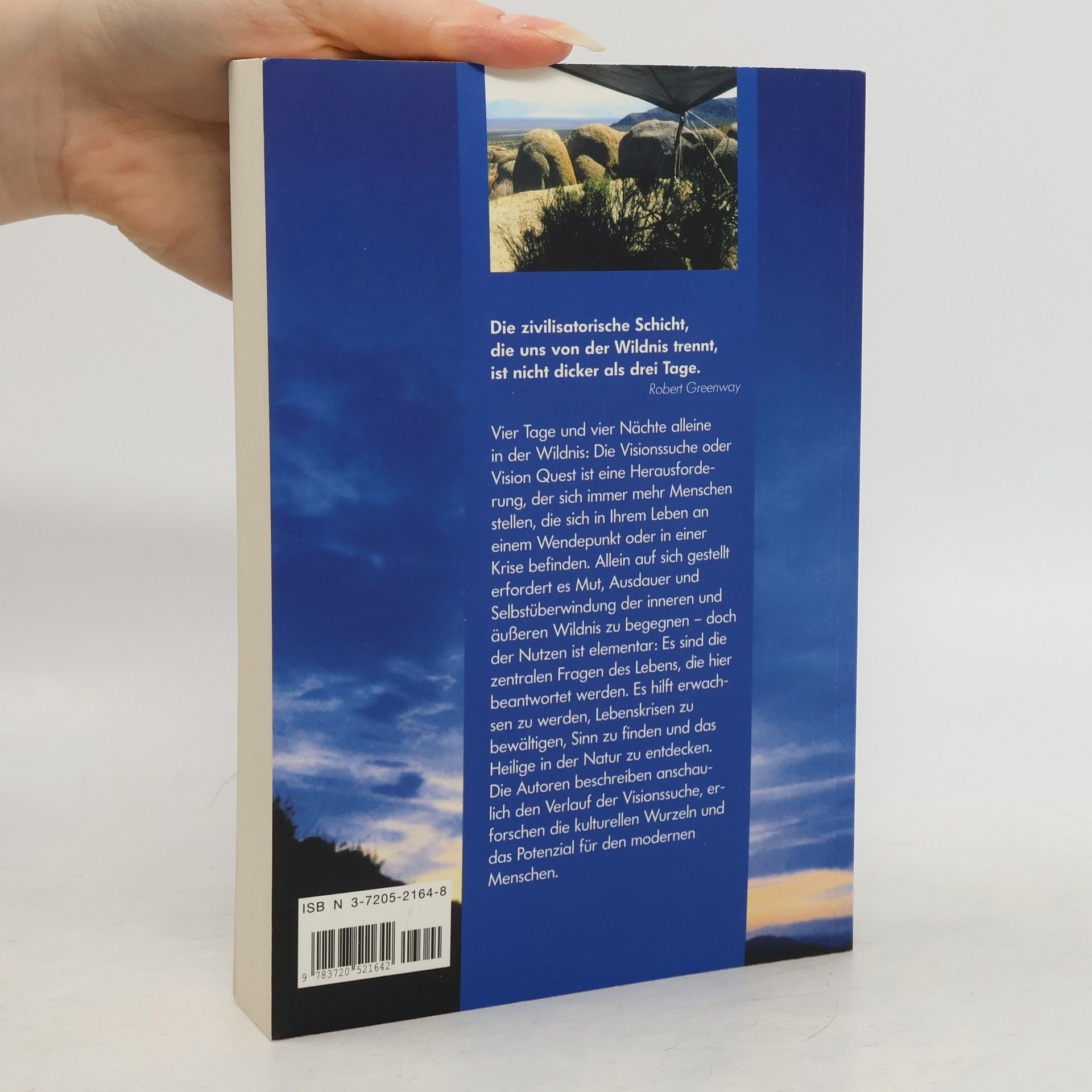 Vier Tage und Nächte allein in der Abgeschiedenheit der Natur: Die Visionssuche – Vision Quest – ist eine besondere Art der Herausforderung für Menschen, die sich an einem Wendepunkt in ihrem Leben befinden und Antworten auf die zentralen Fragen des Daseins suchen. Die Natur ist nicht nur die heute zunehmend bedrohte materielle Lebensgrundlage der Menschheit, immer mehr wird erkannt und empfunden, dass sich das Sich-Einlassen auf die spirituelle Qualität der Natur heilsam auf Seele, Geist und Körper des Menschen wirkt. Die beiden Autoren sind erfahrene Visionssucheleiter und beschreiben in diesem Buch Vorbereitung und Ablauf einer Vision Quest. Sie geben einen Überblick über die kulturellen Wurzeln dieser alten Tradition und stellen zahlreiche Erfahrungsberichte von Visionssuchern vor. Ein ausführlicher Anhang mit weiterführenden Informationen und wichtigen Adressen rundet den Band ab. Das Buch ist ein Standardwerk, das erstmals 2000 im Heinrich Hugendubel Verlag erschienen ist. 2005 wurde es in überarbeiteter Form als Knaur Taschenbuch verlegt. Die Neuausgabe wurde aktualisiert und um einen umfangreichen Anhang erweitert.