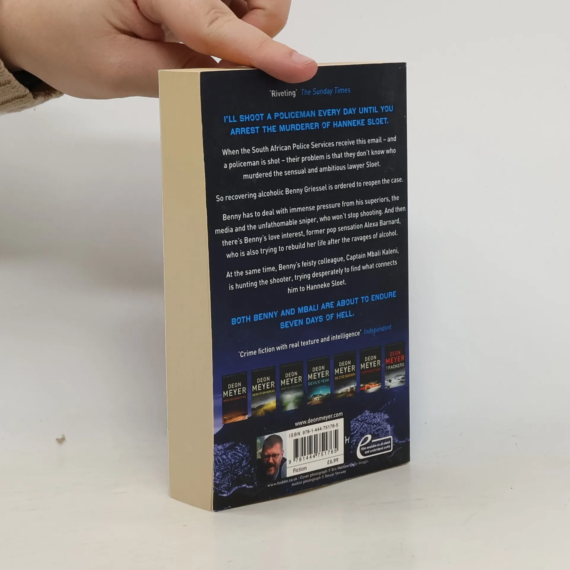 A police officer is shot dead. The next day, one of his colleagues is as well. Then the South African police receive an email threatening an additional cop killed each day until a cold case is solved. Inspector Benny Griessel is charged with reopening the file on the murder of Hanneke Sloet, an ambitious lawyer stabbed to death in her luxury apartment. There’s no apparent motive and no leads, just a set of nude photographs and a burly ex-boyfriend a rock-solid alibi. Then more policemen are shot and the pressure mounts. Can Bennie solve the case and stay sober? Featuring the fantastic characters from Deon Meyer’s Thirteen Hours , which won the Barry Award for Best Thriller in 2011, Seven Days is another gripping adventure from a masterful writer at the top of his game.